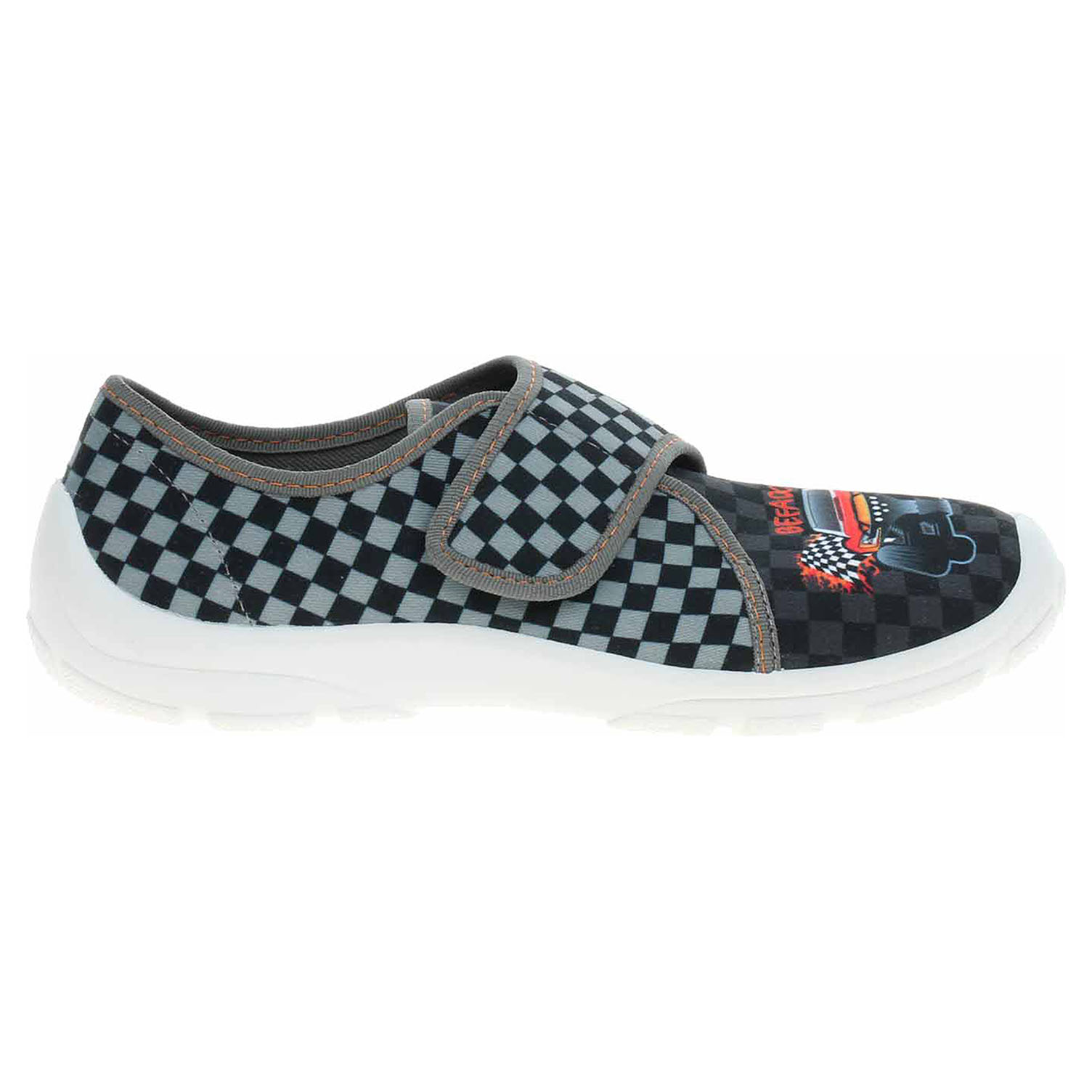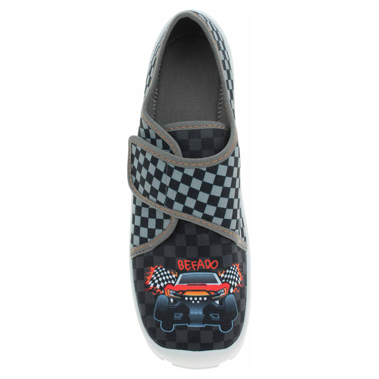Boty Befado - chlapecké domácí bačkory s textilním svrškem, podšívkou i stélkou. Obuv je vybavená vyměkčenou stélkou Soft-B systém a dýchající podešví. Pásek přes nárt, který se zapíná na suchý zip, zajišťuje pohodlné nazouvání a stabilitu nohy v obuvi. Dětská obuv - je vzhledem ke způsobu užívání vystavena většímu mechanickému poškození - okopání. Mechanické poškození není důvodem k reklamaci.
