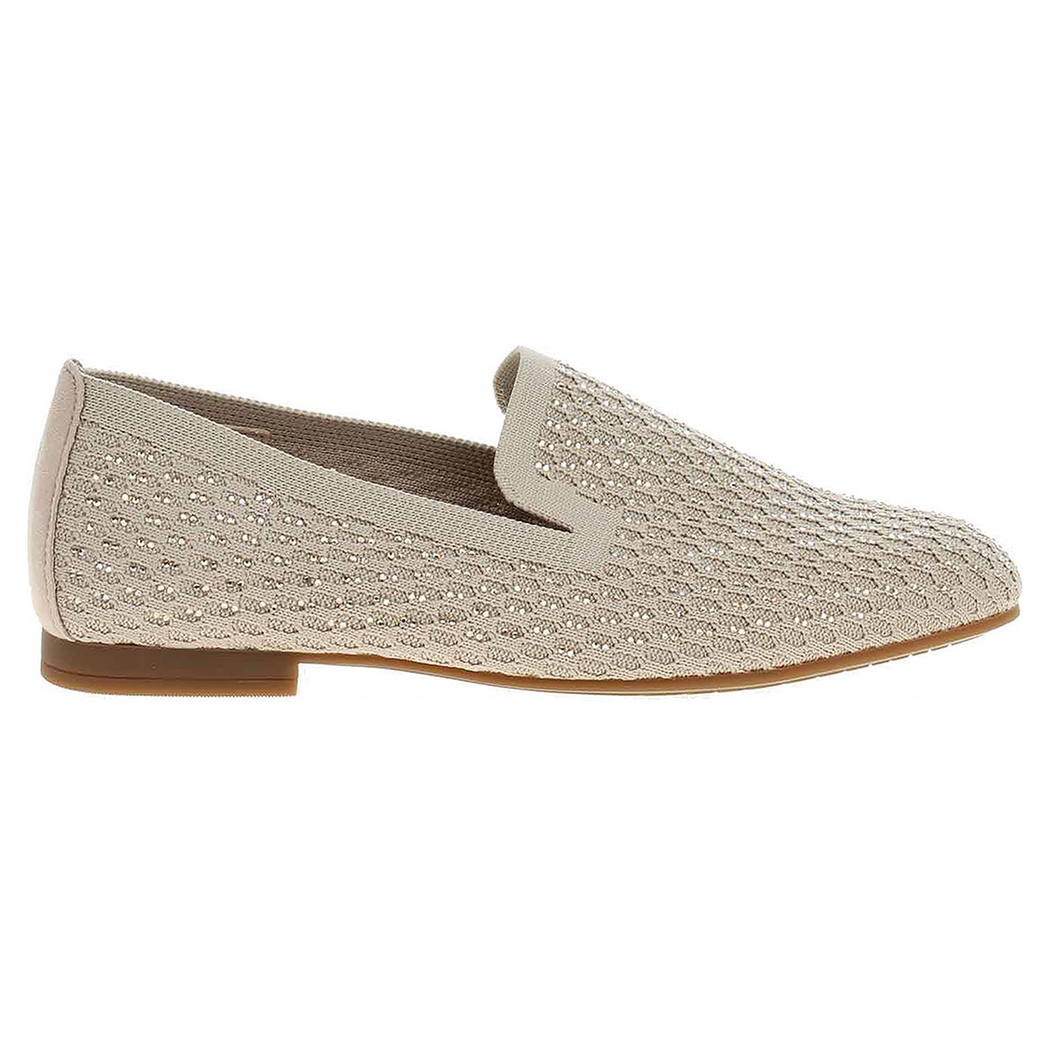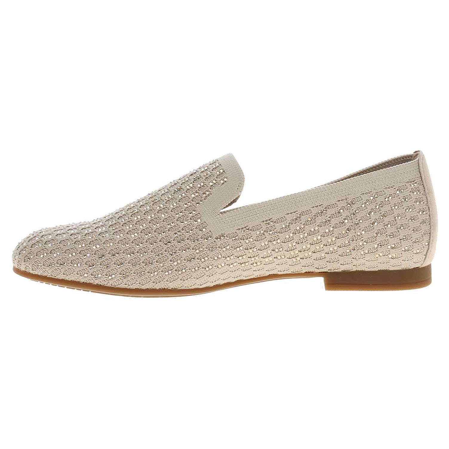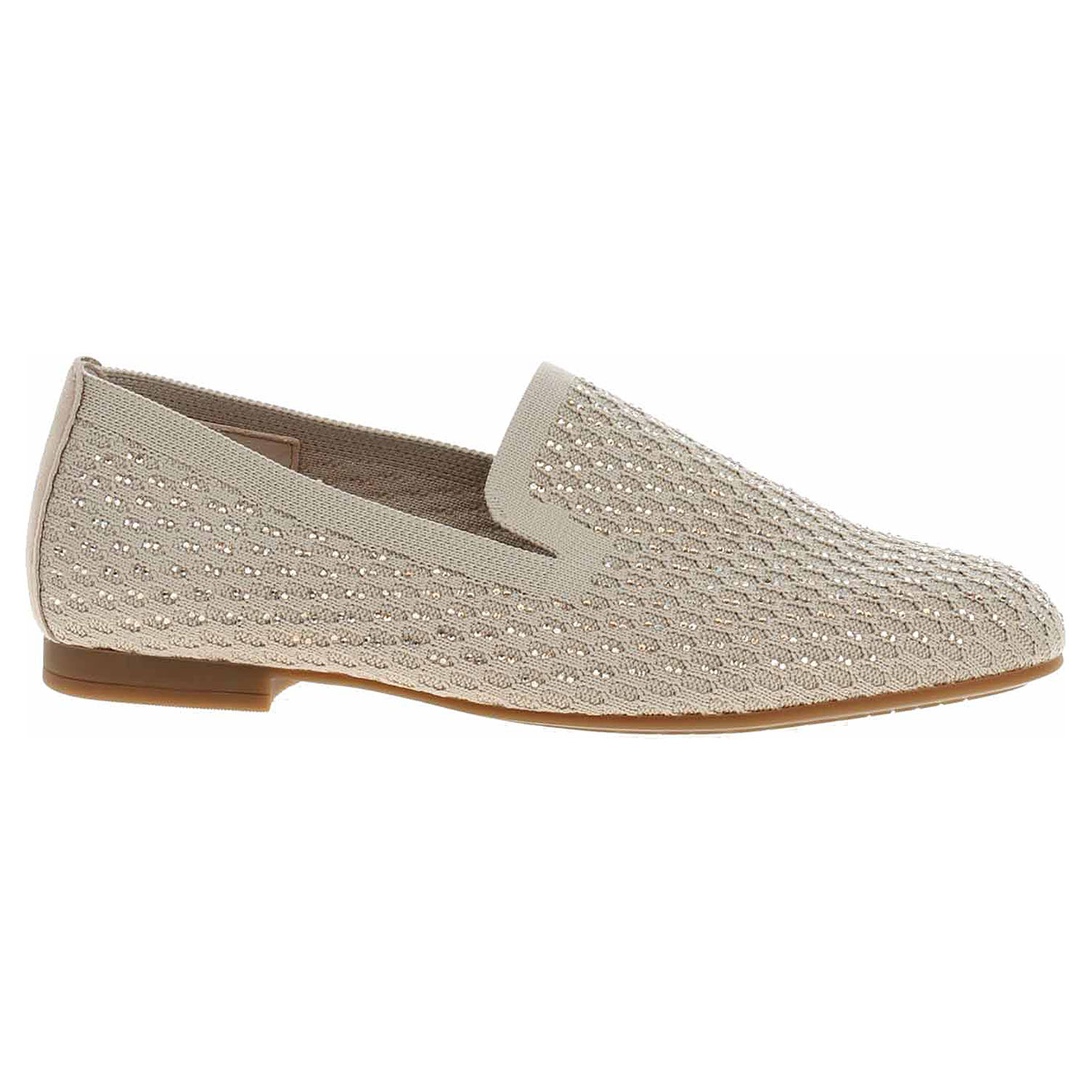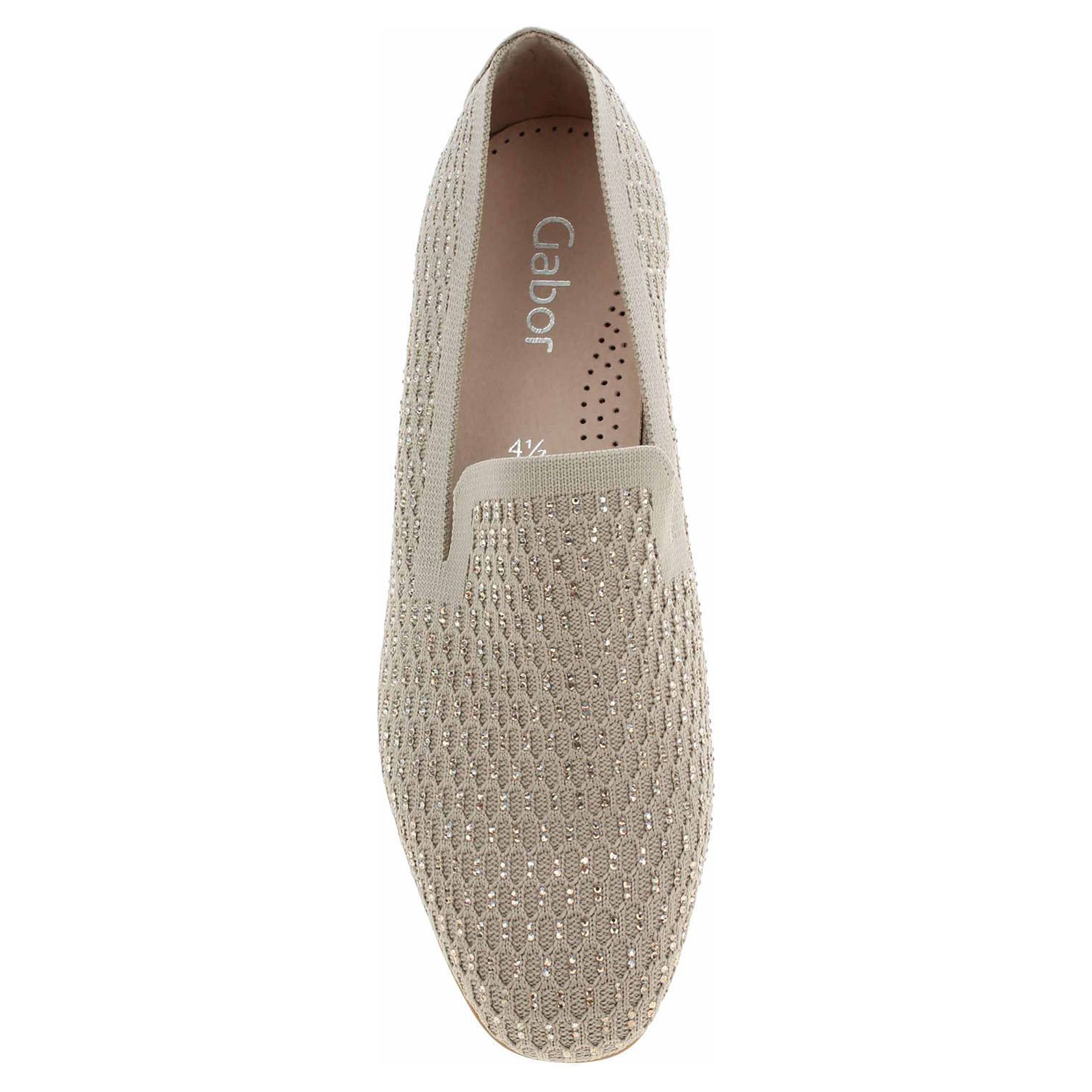 Boty Gabor - módní dámské mokasiny šíře F s prodyšným svrškem kombinovaným textil/useň a se stélkou z usně. Svršek je ozdobený kamínky. Podpatek je vysoký 1,5 cm. Módní obuv - je určena pro krátkodobé nošení v nenáročných podmínkách. Prvořadá je módnost nikoliv životnost. Obuv není vhodná pro každodenní používání.