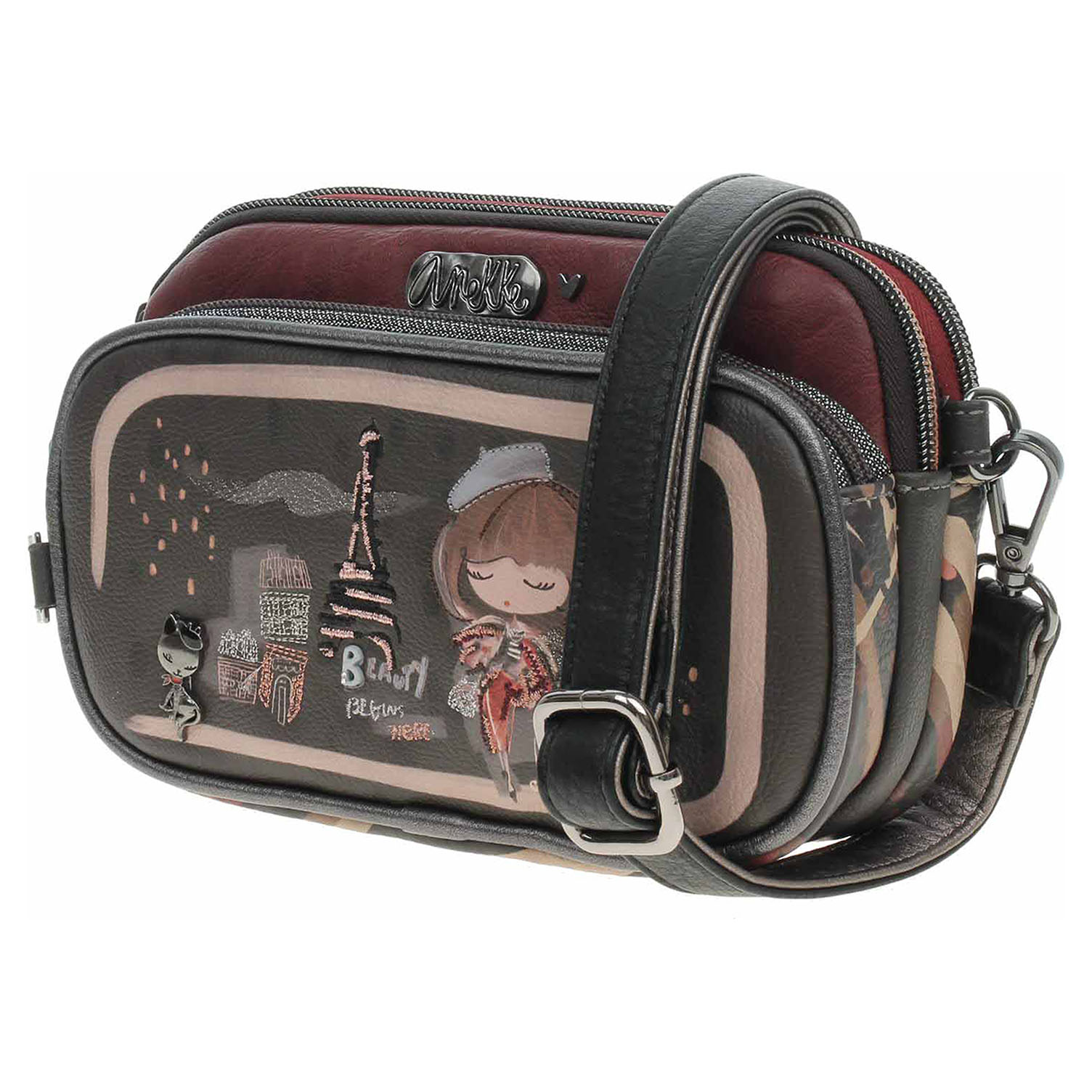 Anekke - dámská crossbosy kabelka Mademoiselle se zapínáním na zip je vyrobená ze 100% polyuretanu a podšívka je ze 100% polyesteru. Na přední i na zadní straně je kapsa se zipem. Regulovatelný popruh s karabinkami (max délka 130 cm) se dá odepnout. Formát A4 se nevejde. Rozměry: 20 x 13 x 6 cm. Vnitřní výbava: 1x kapsa se zipem. Nechybí ikonický přívěsek Anekke. Baleno v praktickém dustbagu. Anekke - I´m eco-friendly.