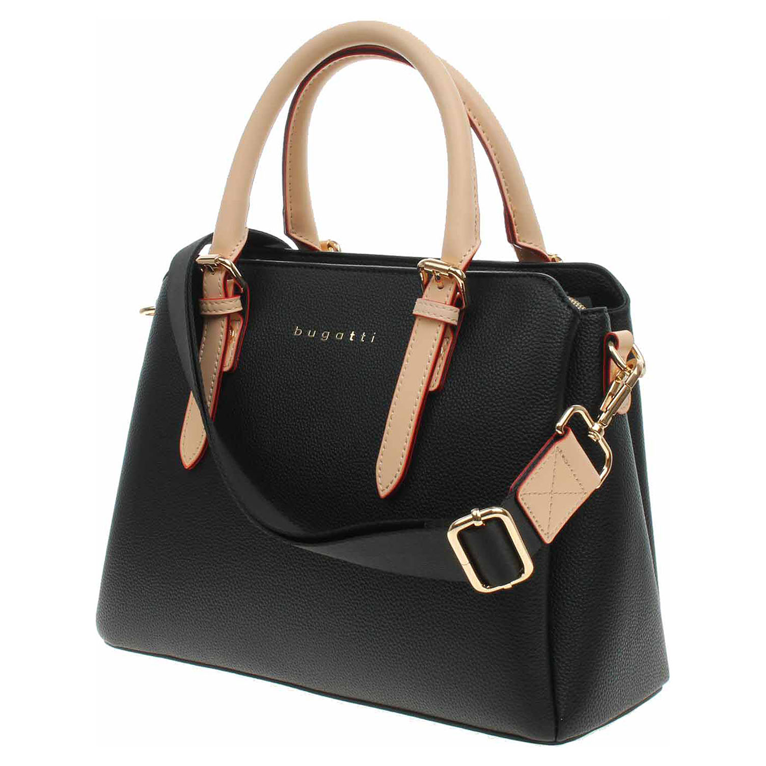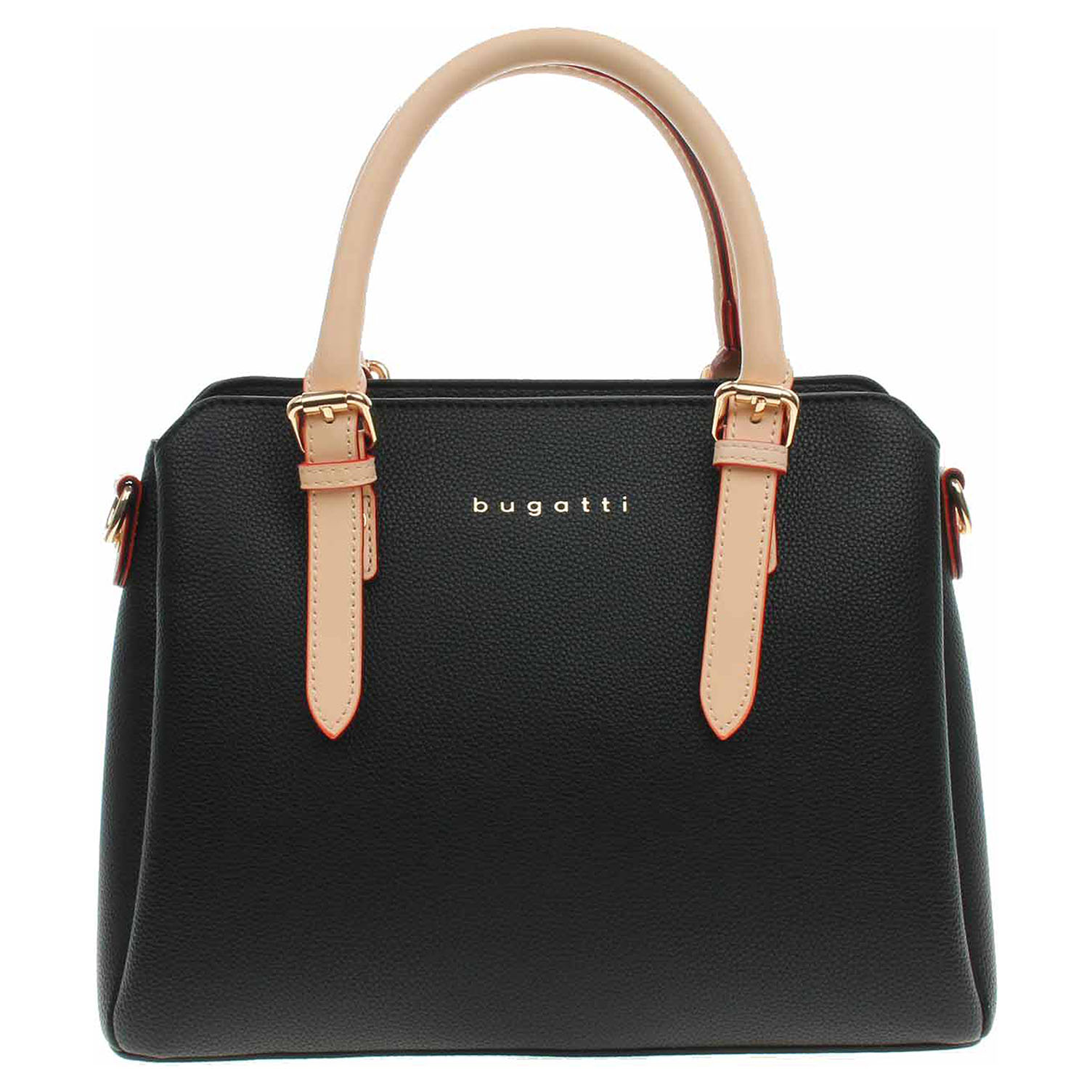 Bugatti - dámská kabelka se zapínáním na zip je vyrobená z polyuretanu a podšívka je z polyesteru. Pod zipem je na přední i na zadní straně komory kapsa bez zapínání. Kabelku je možno nosit v ruce (výška ucha 11 cm) nebo přes rameno na odepínatelném popruhu s karabinkami. Rozměry kabelky: 30 x 23 x 12 cm. Na zadní straně je kapsa se zipem. Přezky, karabinky, zipy jsou ve zlaté barvě. Vnitřní výbava: dvě kapsičky na drobnosti bez zapínání a jedna kapsa se zipem.