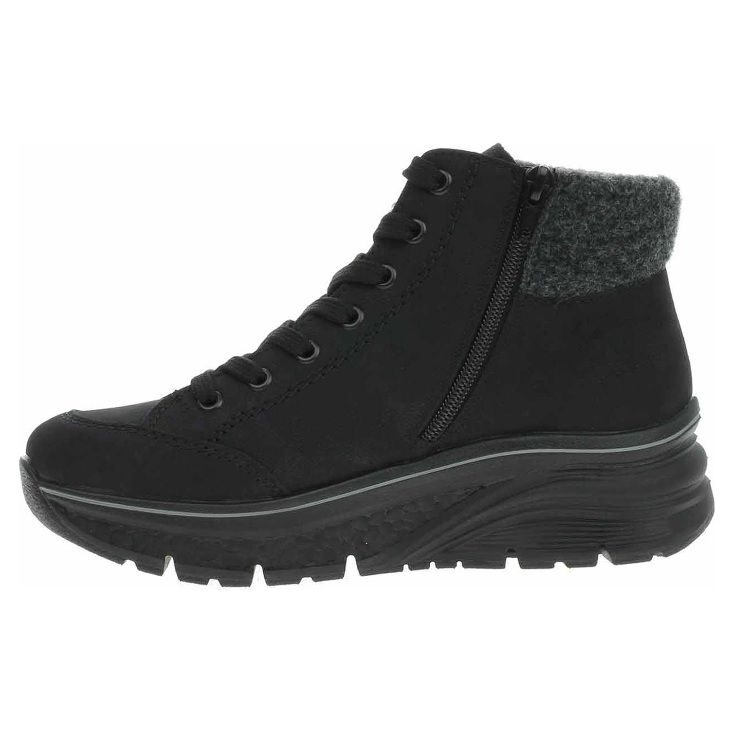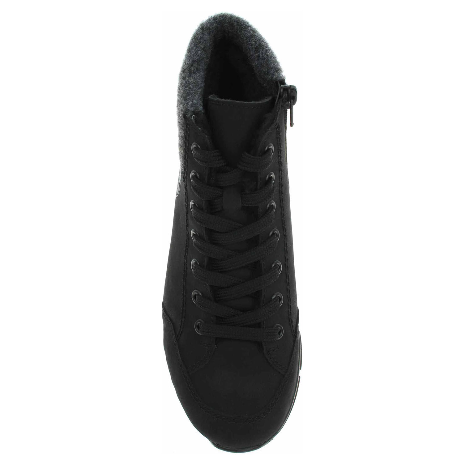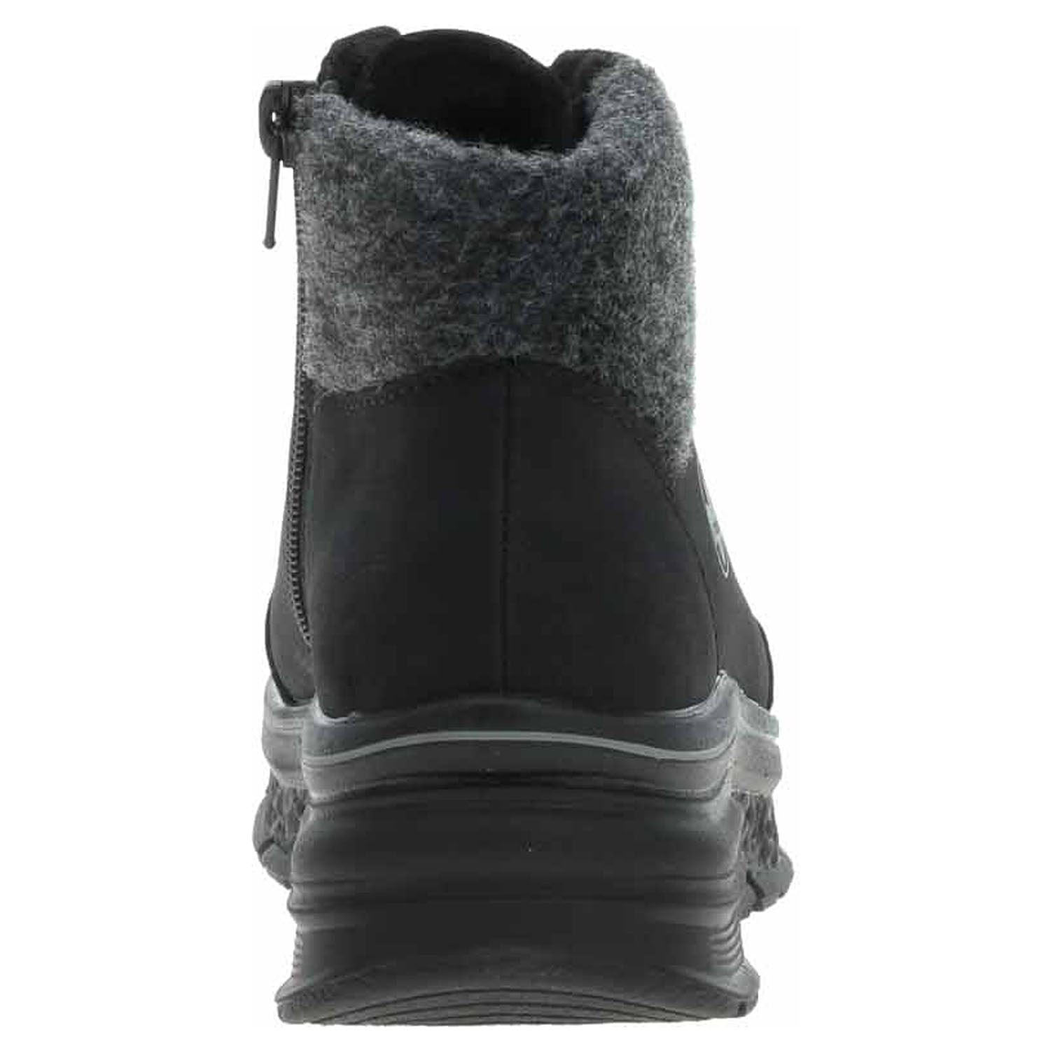 Boty Rieker - lepená dámská kotníková obuv se svrškem ze syntetiky a s textilním lemem je vyteplená textilní podšívkou a je vybavená vodoodpudivou membránou RiekerTex, ultralehkou podešví Rieker-Lite a paměťovou stélkou MemoSoft, která maximálně změkčuje došlap a zvyšuje pohodlí v obuvi. Pohodlné nazouvání zajišťuje zip na vnitřní straně a šněrování na nártu. Klínek je vysoký 4,4 cm a platrforma je vysoká 2,5 cm. Lepená obuv - pevnost lepeného spoje může být negativně ovlivněna promáčením nebo propocením, event. opakovaným používáním nedostatečně vysušené obuvi. Při neopatrné chůzi může dojít k mechanickému uvolnění lepeného spoje - ukopnutí.