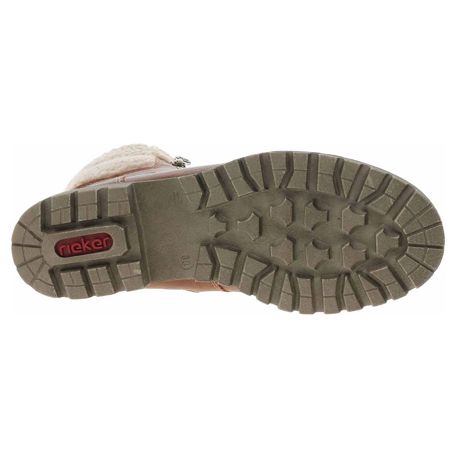 Boty Rieker - lepená dámská kotníková obuv se svrškem ze syntetiky a s textilní stélkou je vyteplená textilní podšívkou s jemným chloupkem. Obuv je vybavená vodoodpudivou membránou RiekerTex, šněrováním a zipem na vnitřní straně, který zajišťuje rychlé a pohodlné nazouvání. Zip na vnější straně má pouze ozdobnou funkci. Podpatek je vysoký 3,5 cm a platforma je vysoká 2,- cm. Podešev je flexibilní a díky systému Antistress skvěle tlumí nárazy a otřesy. Lepená obuv - pevnost lepeného spoje může být negativně ovlivněna promáčením nebo propocením, event. opakovaným používáním nedostatečně vysušené obuvi. Při neopatrné chůzi může dojít k mechanickému uvolnění lepeného spoje - ukopnutí.
