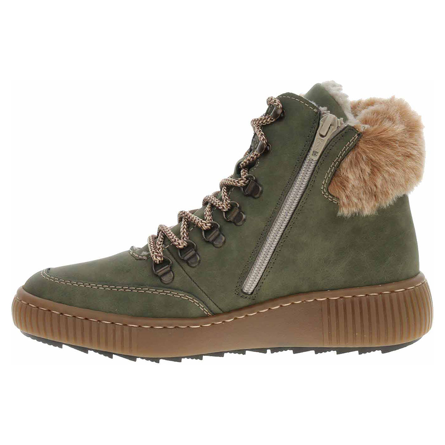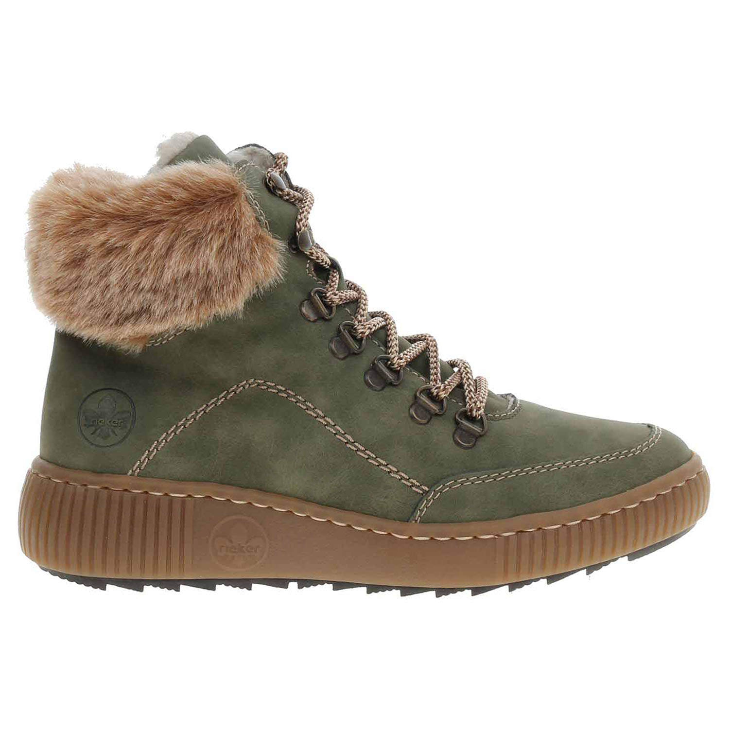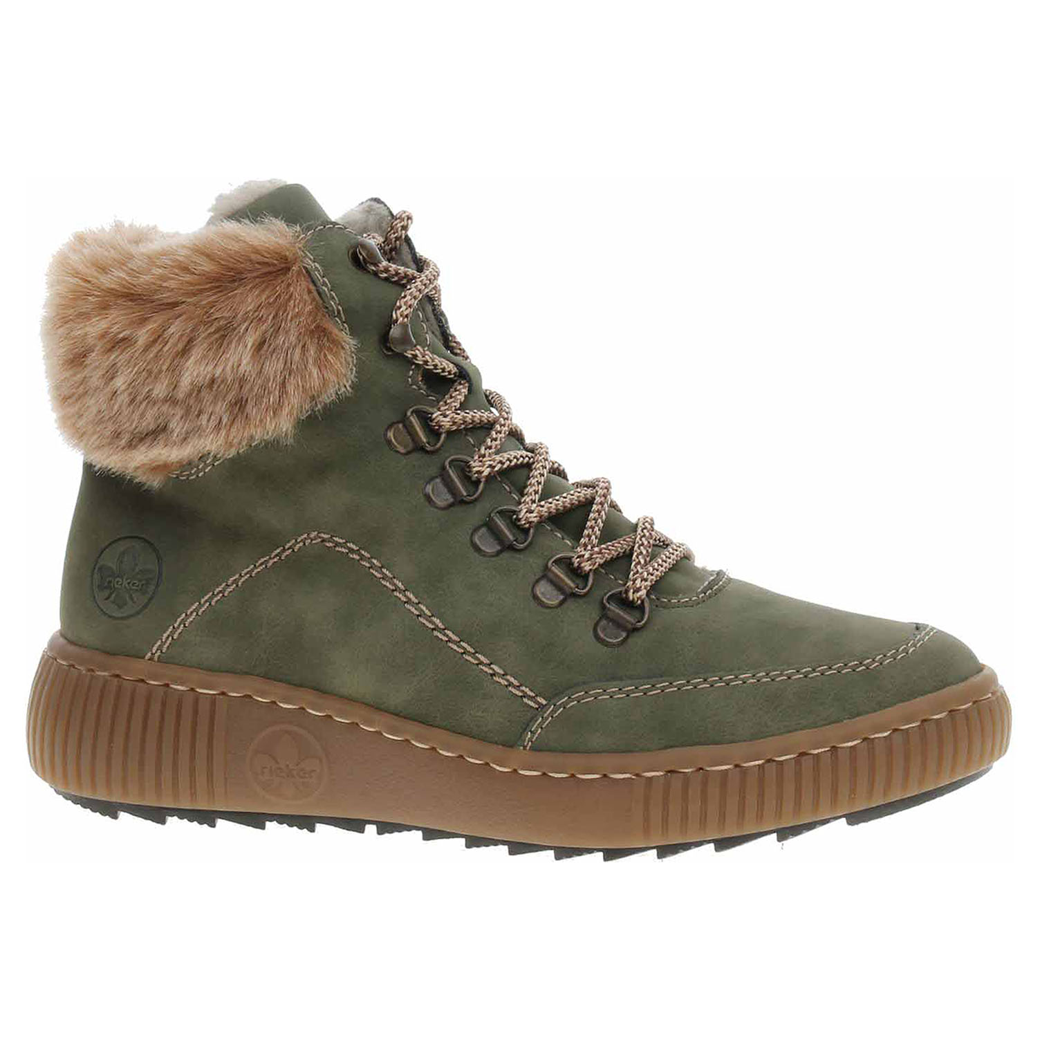 Boty Rieker - flexiblová dámská kotníková obuv se svrškem ze syntetiky a s textilní stélkou je vyteplená textilní podšívkou s jemným chloupkem. Pohodlné nazouvání zajišťuje šněrování na nártu a zip na vnitřní straně. Vyměnitelné vložky do bot je možné vyndat za účelem provětrání a omytí. Značnou výhodu nabízejí vyměnitelné vložky do bot také těm uživatelům, kteří používají ortopedické vkládací stélky. Klínek je vysoký 4,- cm a platforma je vysoká 2,- cm. Podešev je flexibilní a díky systému Antistress skvěle tlumí nárazy a otřesy. Flexiblová obuv - prošívaná podešev, obuv používejte v suchém prostředí. Při zvýšené vlhkosti může dojít k promáčení obuvi. Obuv pravidelně impregnujte nebo krémujte, zvláště pak prošívaný okraj.