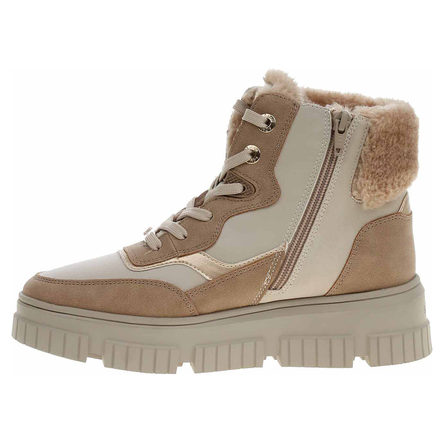 Boty s.Oliver - lepená dámská kotníková obuv se svrškem ze syntetiky je vybavená stélkou Soft Foam s textilní nášlapnou vrstvou a je vyteplená textilní podšívkou s chlupem. Pohodlné nazouvání zajišťuje šněrování a zip na vnitřní straně. Stélka Soft Foam se přizpůsobuje vašemu chodidlu a zajišťuje optimální komfort při chůzi. Obuv je 100% VEGAN = při výrobě obuvi nebyly použity žádné materiály ze zvířat. Podpatek je vysoký 5,- cm a platforma je vysoká 3,- cm. Lepená obuv - pevnost lepeného spoje může být negativně ovlivněna promáčením nebo propocením, event. opakovaným používáním nedostatečně vysušené obuvi. Při neopatrné chůzi může dojít k mechanickému uvolnění lepeného spoje - ukopnutí.