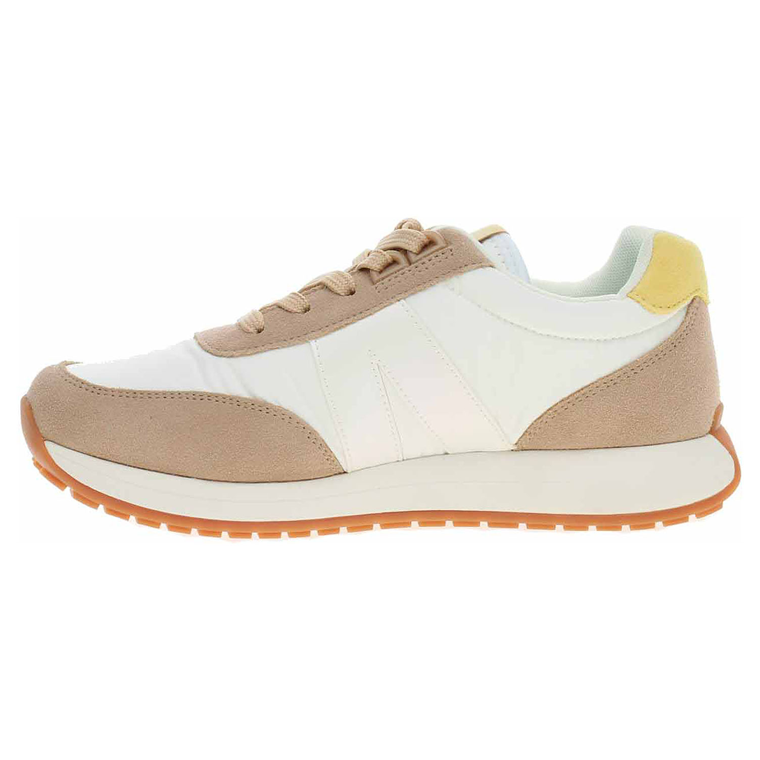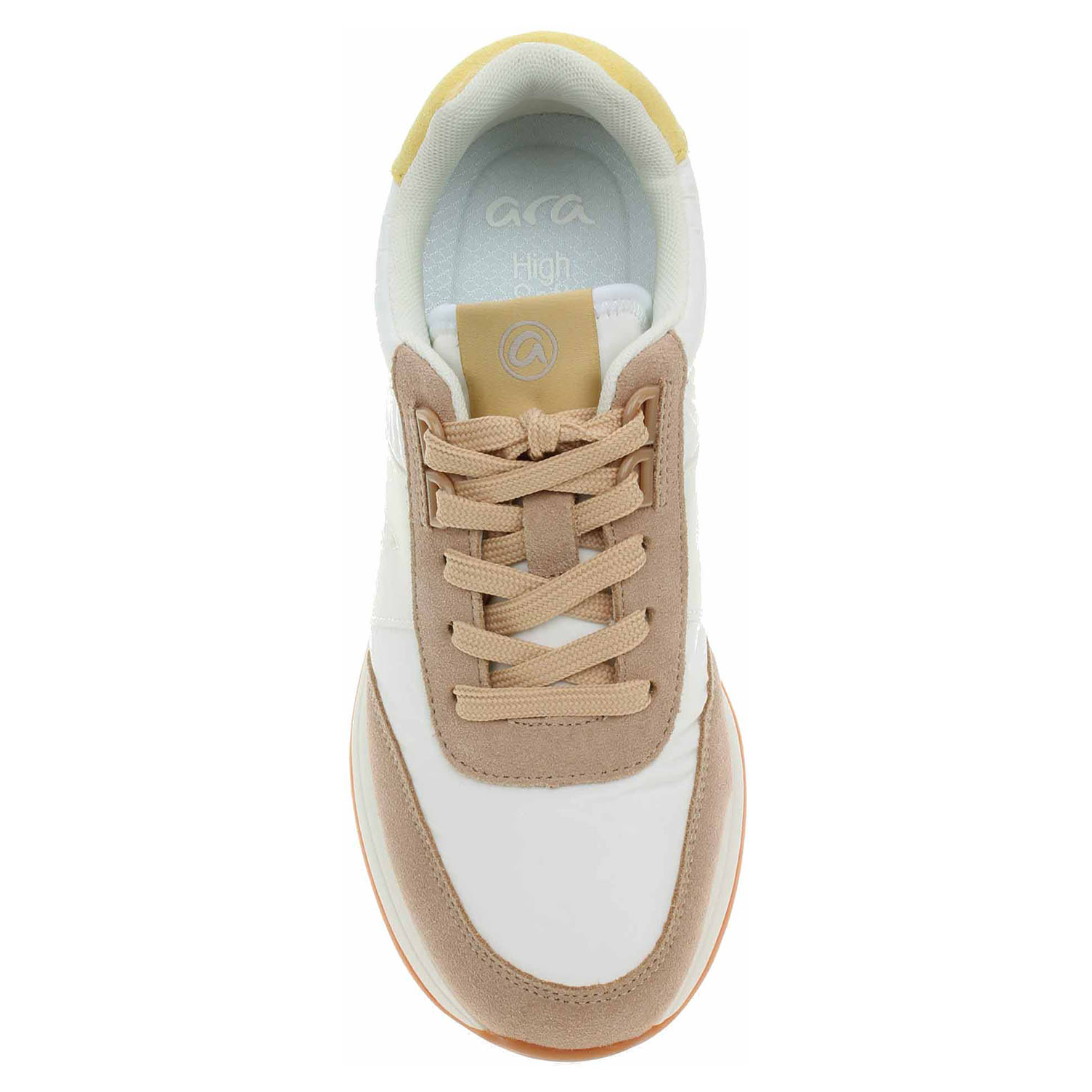 Boty Ara - lepená dámská obuv nadměrné šíře H se šněrováním má svršek kombinovaný textil/syntetický velur, textilní podšívku a je vybavená tvarovanou, vyndavací stélkou s textilní nášlapnou vrstvou. Barevná kombinace svršku: béžová - bílá - žlutá. HIGH SOFT = modelová řada, která se vyznačuje měkkým svrškem, polstrovanou stélkou a flexibilní podešví. Vyndavací stélka zajišťuje maximální komfort a pohodlnou chůzi. Anatomicky tvarované vložky do bot je možné vyndat za účelem provětrání a omytí. Značnou výhodu nabízejí vyměnitelné vložky do bot také těm uživatelům, kteří používají ortopedické vkládací stélky. Klínek je vysoký 3,- cm. Lepená obuv - pevnost lepeného spoje může být negativně ovlivněna promáčením nebo propocením, event. opakovaným používáním nedostatečně vysušené obuvi. Při neopatrné chůzi může dojít k mechanickému uvolnění lepeného spoje - ukopnutí.