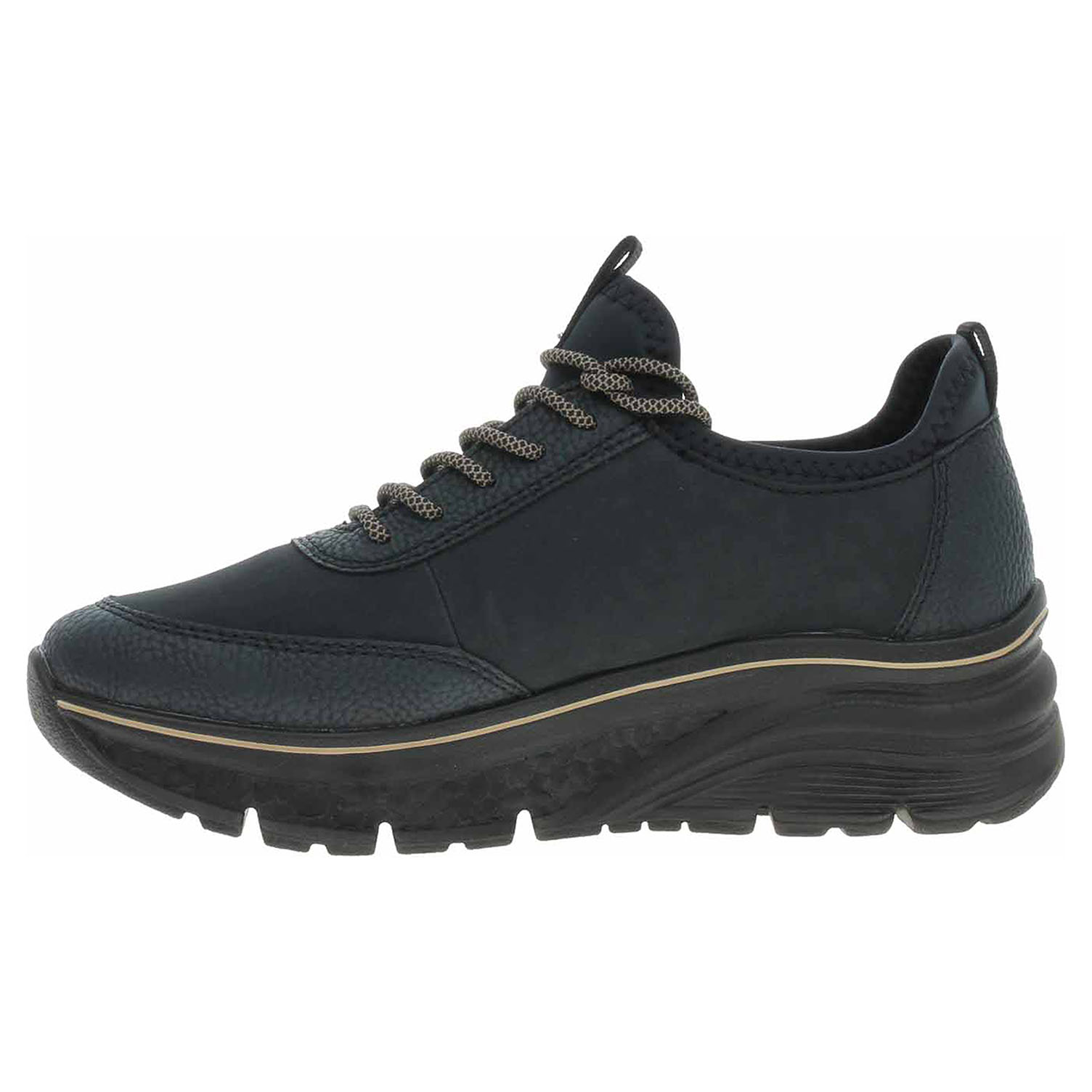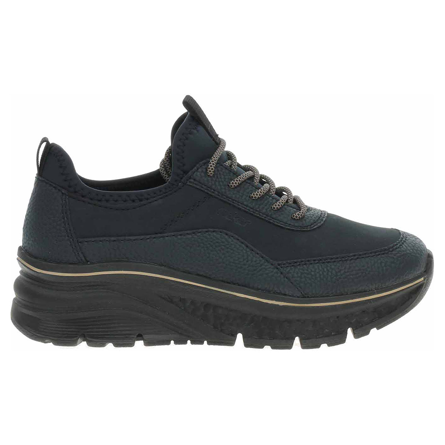Boty Rieker - lepená dámská vycházková obuv se svrškem kombinovaným syntetika/textil a s textilní podšívkou je vybavená ultralehkou podešví Rieker-Lite a paměťovou stélkou MemoSoft, která maximálně změkčuje došlap a zvyšuje pohodlí v obuvi. Pohodlné nazouvání zajišťuje textilní ponožkový nástup do obuvi. Klínek je vysoký 4,- cm a platrforma je vysoká 2,5 cm. Lepená obuv - pevnost lepeného spoje může být negativně ovlivněna promáčením nebo propocením, event. opakovaným používáním nedostatečně vysušené obuvi. Při neopatrné chůzi může dojít k mechanickému uvolnění lepeného spoje - ukopnutí.