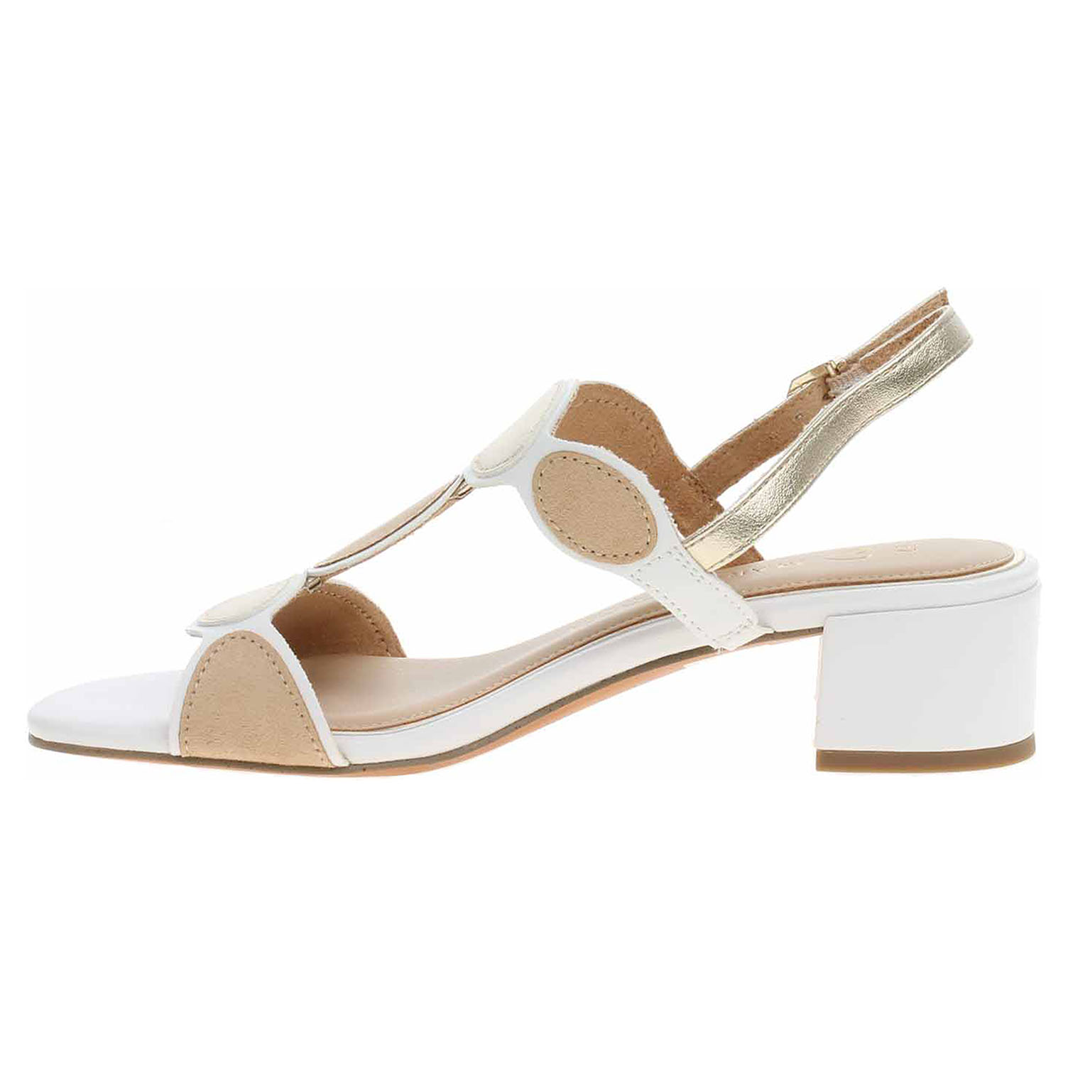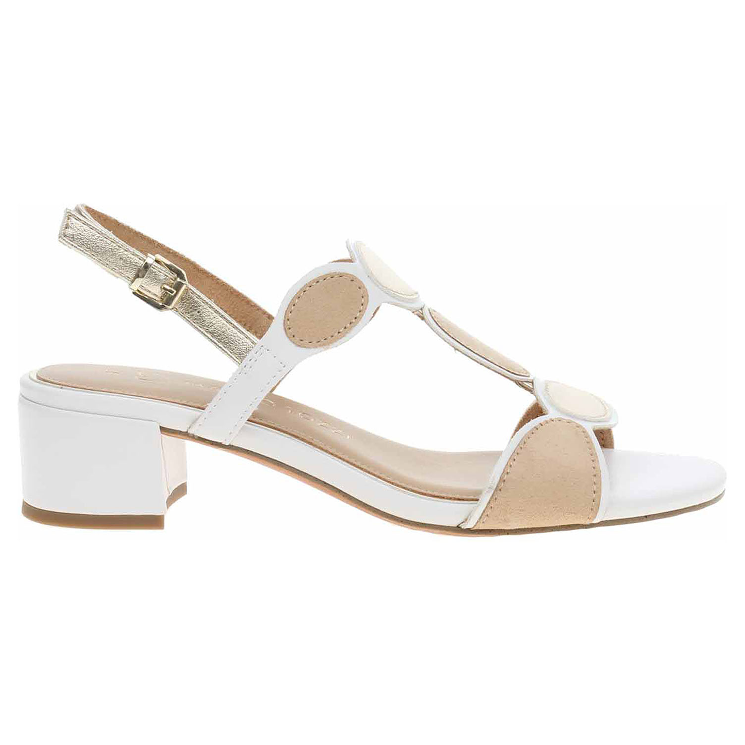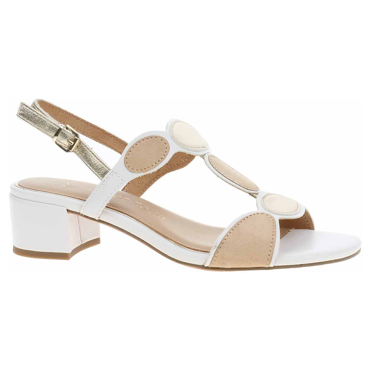 Boty Marco Tozzi - společenské dámské sandály se svrškem kombinovaným syntetika/textil a s textilní podšívkou jsou vybavené stélkou Feel me s nášlapnou vrstvou kombinovanou syntetika/textil, která se přizpůsobuje vašemu chodidlu a zajišťuje optimální komfort při chůzi. Pásek přes patu se zapíná na přezku. Podpatek je vysoký 4,5 cm. Obuv je 100% VEGAN = při výrobě obuvi nebyly použity žádné materiály ze zvířat. Společenská obuv - vhodná ke krátkodobému nošení v interiérech. Obuv nevystavujte vlhkosti.