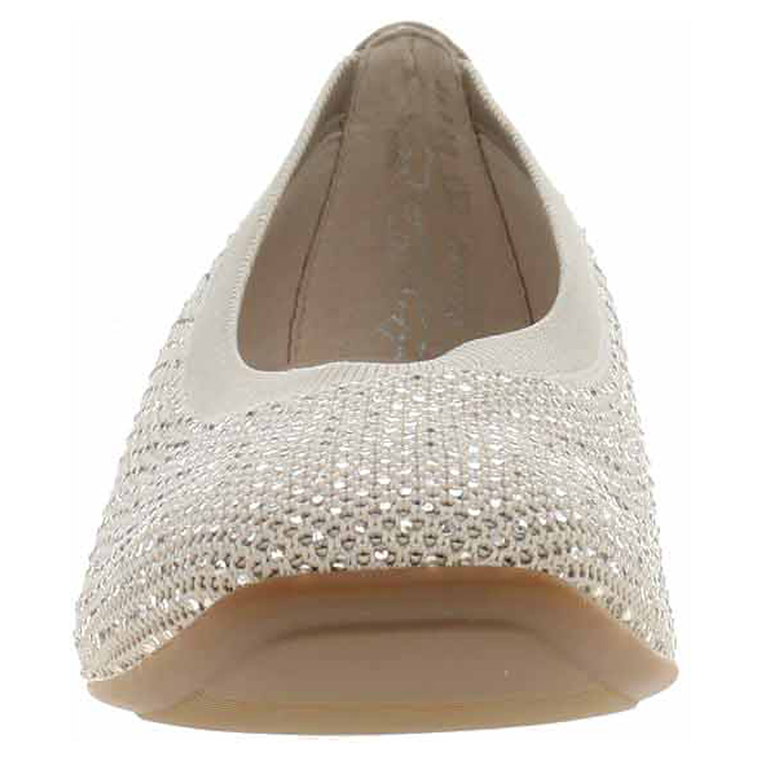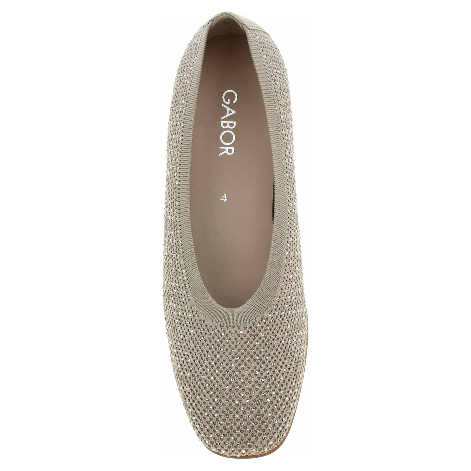 Boty Gabor - módní dámské baleriny se svrškem ze strečové textilie ozdobené třpytivými kamínky a s patním dílem z usně mají textilní podšívku a jsou vybavené vyměkčenou stélkou s nášlapnou vrstvou z usně. Pružný lem kolem nástupu do obuvi zajiští dobré padnutí. Podpatek je vysoký 1,- cm. Módní obuv - je určena pro krátkodobé nošení v nenáročných podmínkách. Prvořadá je módnost nikoliv životnost. Obuv není vhodná pro každodenní používání.