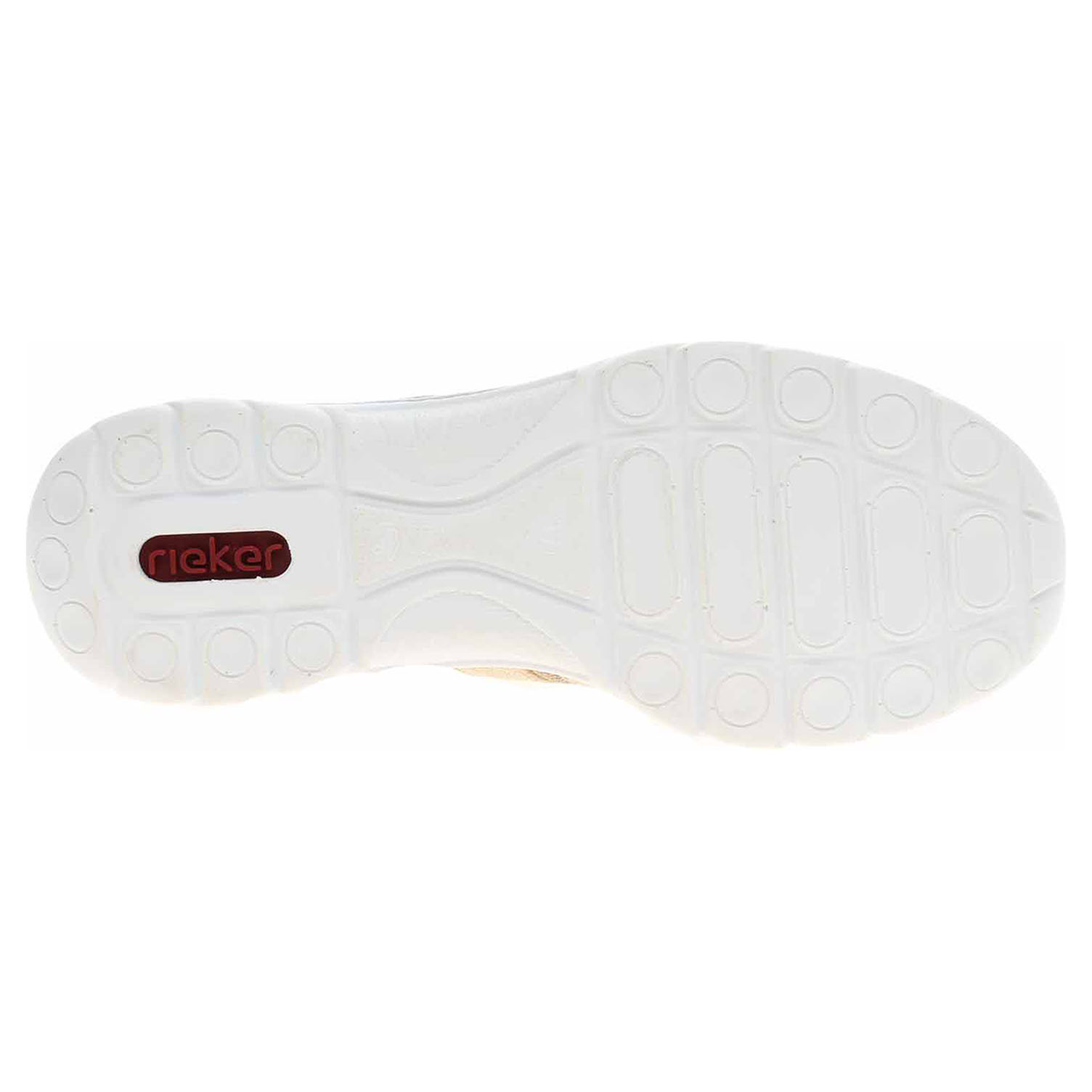 Boty Rieker - flexiblové dámské baleriny se svrškem kombinovaným textil/syntetika a s textilní podšívkou jsou vybavené paměťovou stélkou MemoSoft, která maximálně změkčuje došlap a zvyšuje pohodlí v obuvi. Pohodlné nazouvání a stabilitu nohy v obuvi zajišťují dva elastické pásky přes nárt. Klínek je vysoký 3,7 cm. Podešev je flexibilní a díky systému Antistress (lehkost, pružnost, prostornost a vynikající absorpce nárazů) Vám obuv zajistí pohodlí při každém kroku. Flexiblová obuv - prošívaná podešev, obuv používejte v suchém prostředí. Při zvýšené vlhkosti může dojít k promáčení obuvi. Obuv pravidelně impregnujte nebo krémujte, zvláště pak prošívaný okraj.