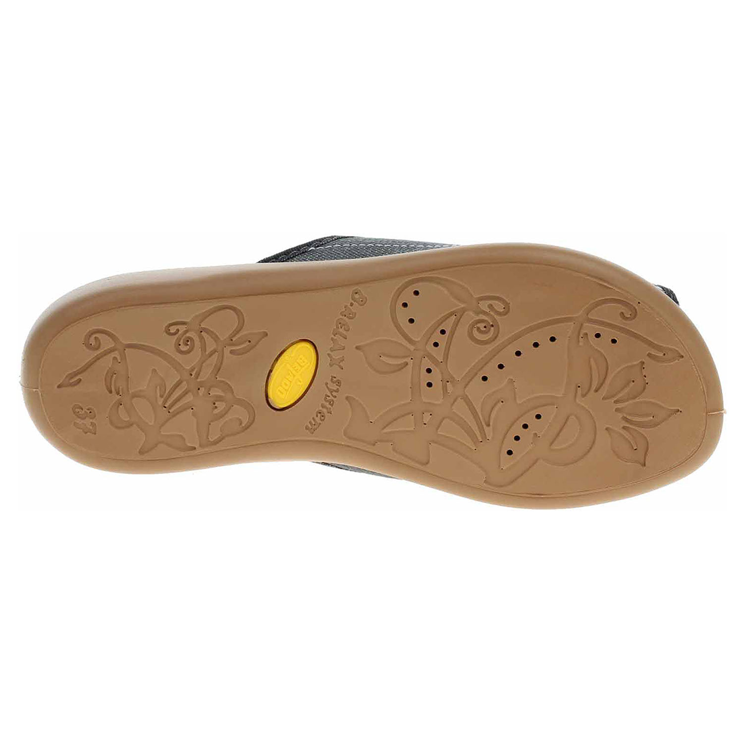 Popis:Boty Befado - dámské domácí pantofle s otevřenou špičkou na klínku vysokém 2,- cm. Svršek, podšívka i stélka jsou textilní.