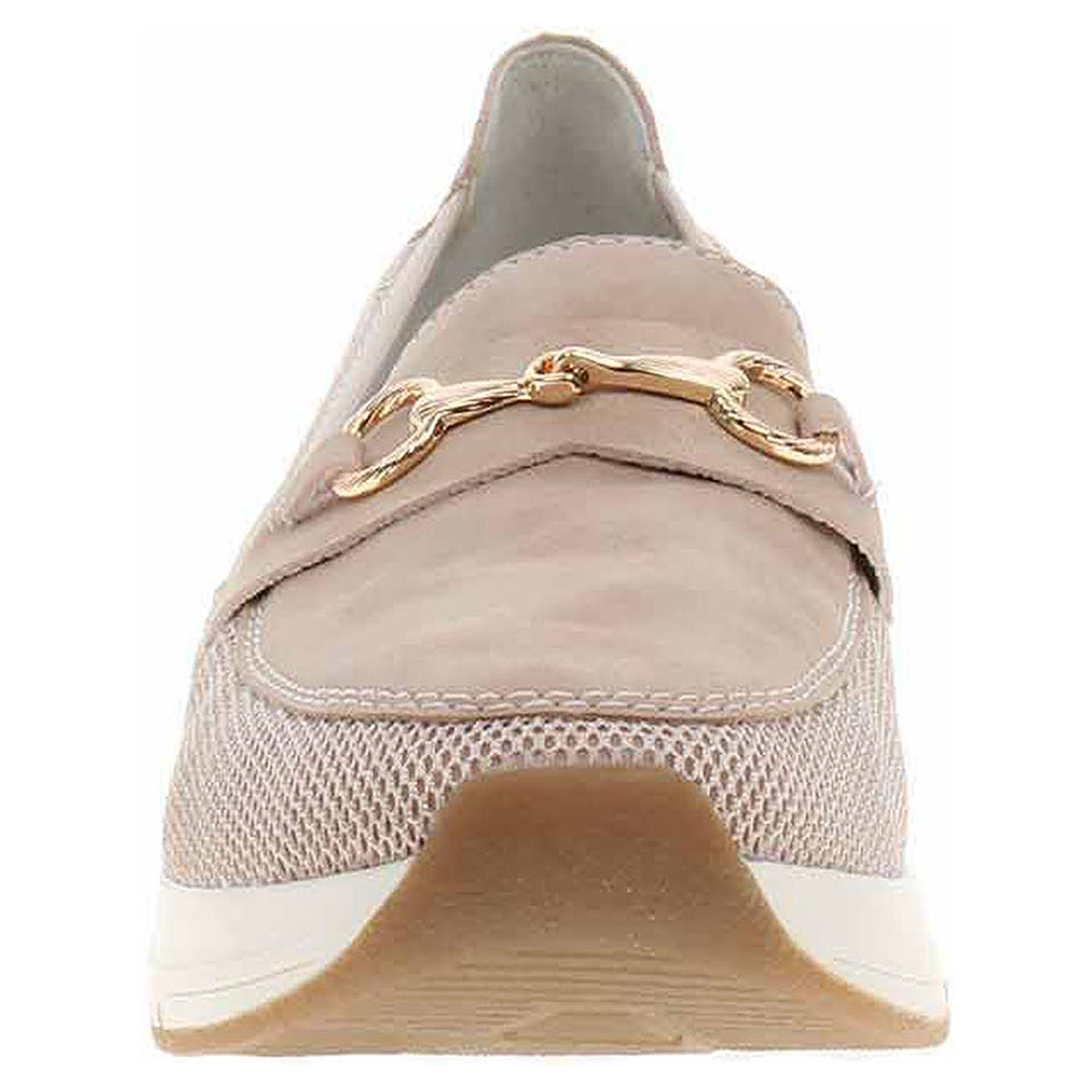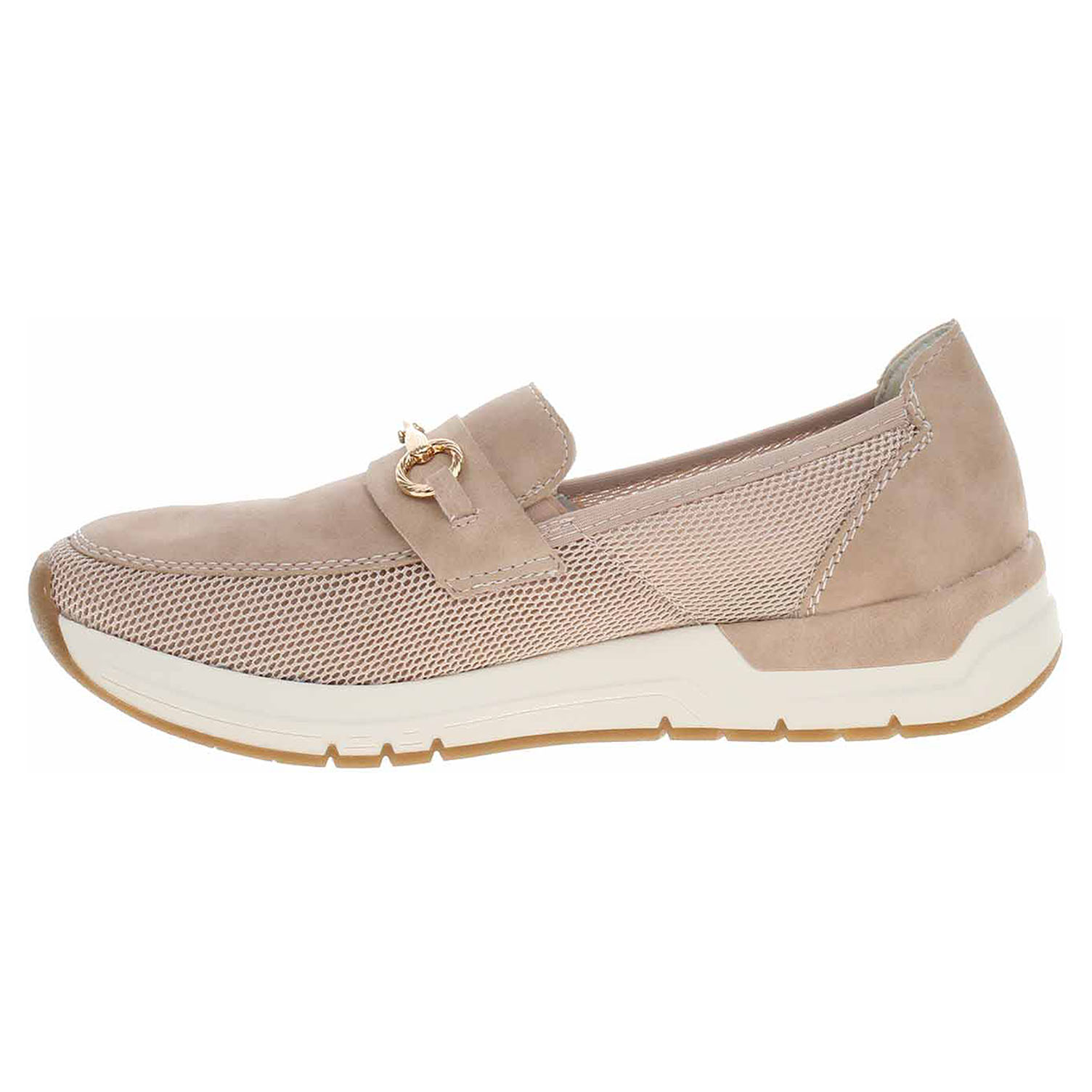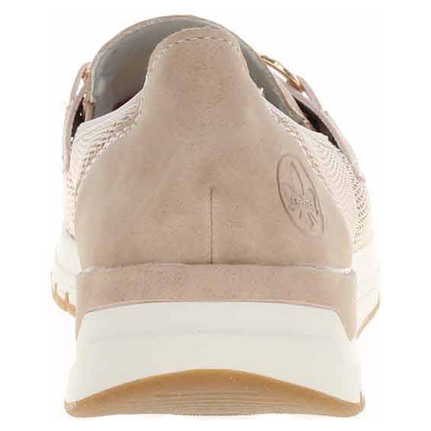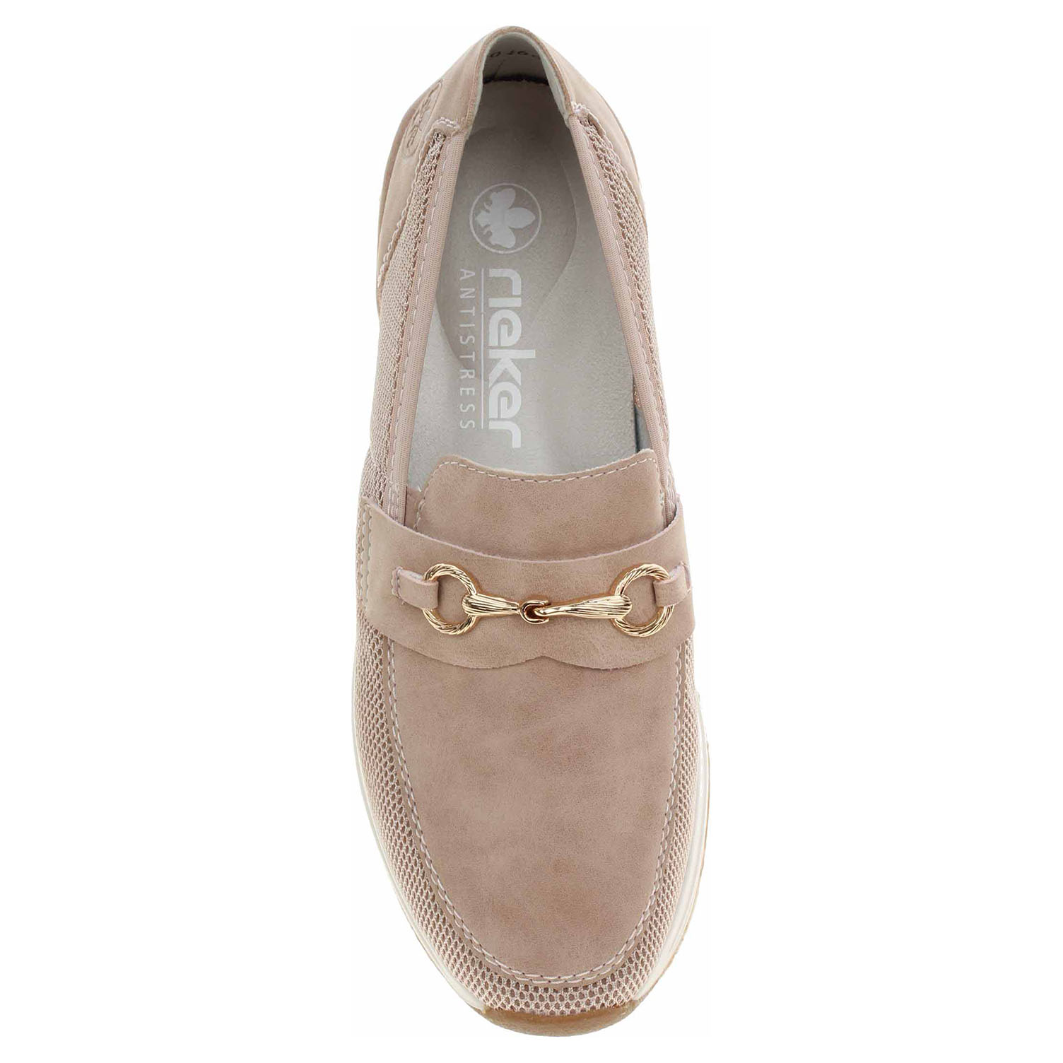Boty Rieker - lepené dámské mokasiny se zlatou ozdobou na nártu mají svršek kombinovaný textil/syntetika a jsou vybavené vyndavací paměťovou stélkou RiekerSoft s textilní nášlapnou vrstvou, která maximálně změkčuje došlap a zvyšuje pohodlí v obuvi. Pohodlné nazouvání zajišťují vsazené gumičky na nártu. Vyměnitelné vložky do bot je možné vyndat za účelem provětrání a omytí. Značnou výhodu nabízejí vyměnitelné vložky do bot také těm uživatelům, kteří používají ortopedické vkládací stélky. Klínek je vysoký 3,2 cm. Podešev je flexibilní a díky systému Antistress skvěle tlumí nárazy a otřesy. Obuv je 100% VEGAN = při výrobě obuvi nebyly použity žádné materiály ze zvířat. Lepená obuv - pevnost lepeného spoje může být negativně ovlivněna promáčením nebo propocením, event. opakovaným používáním nedostatečně vysušené obuvi. Při neopatrné chůzi může dojít k mechanickému uvolnění lepeného spoje - ukopnutí.