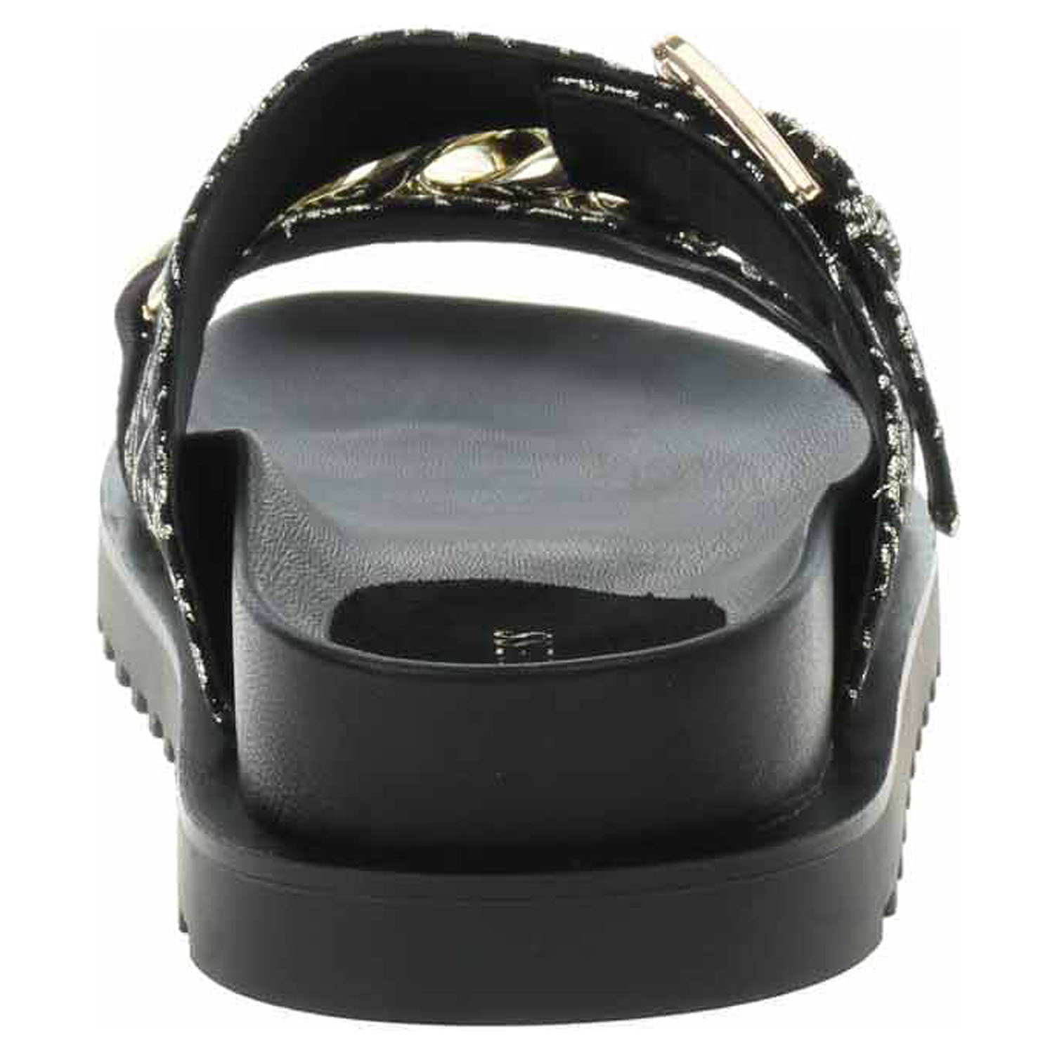 Guess - módní dámské pantofle s textilním svrškem ozdobeným zlatým řetízkem a s podšívkou i stélkou ze syntetiky. Klínek je vysoký 3,- cm. Módní obuv - je určena pro krátkodobé nošení v nenáročných podmínkách. Prvořadá je módnost nikoliv životnost. Obuv není vhodná pro každodenní používání.