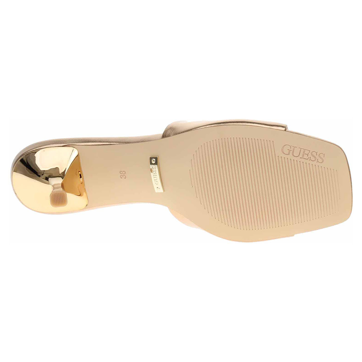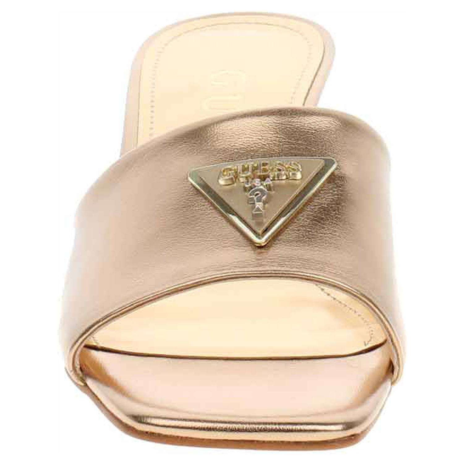 Boty Guess - módní dámské pantofle se svrškem ze syntetiky ozdobeným logem v trojúhelníku má podšívku i stélku ze syntetiky. Podpatek je vysoký 5,7 cm. Módní obuv - je určena pro krátkodobé nošení v nenáročných podmínkách. Prvořadá je módnost nikoliv životnost. Obuv není vhodná pro každodenní používání.