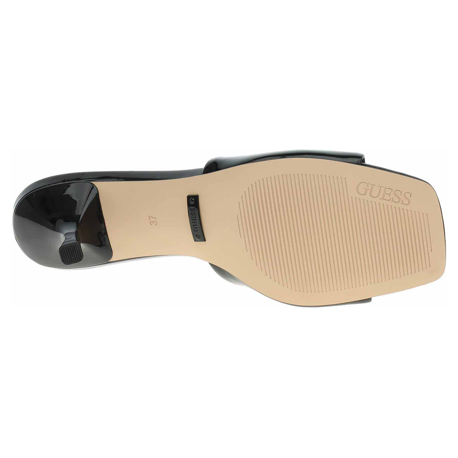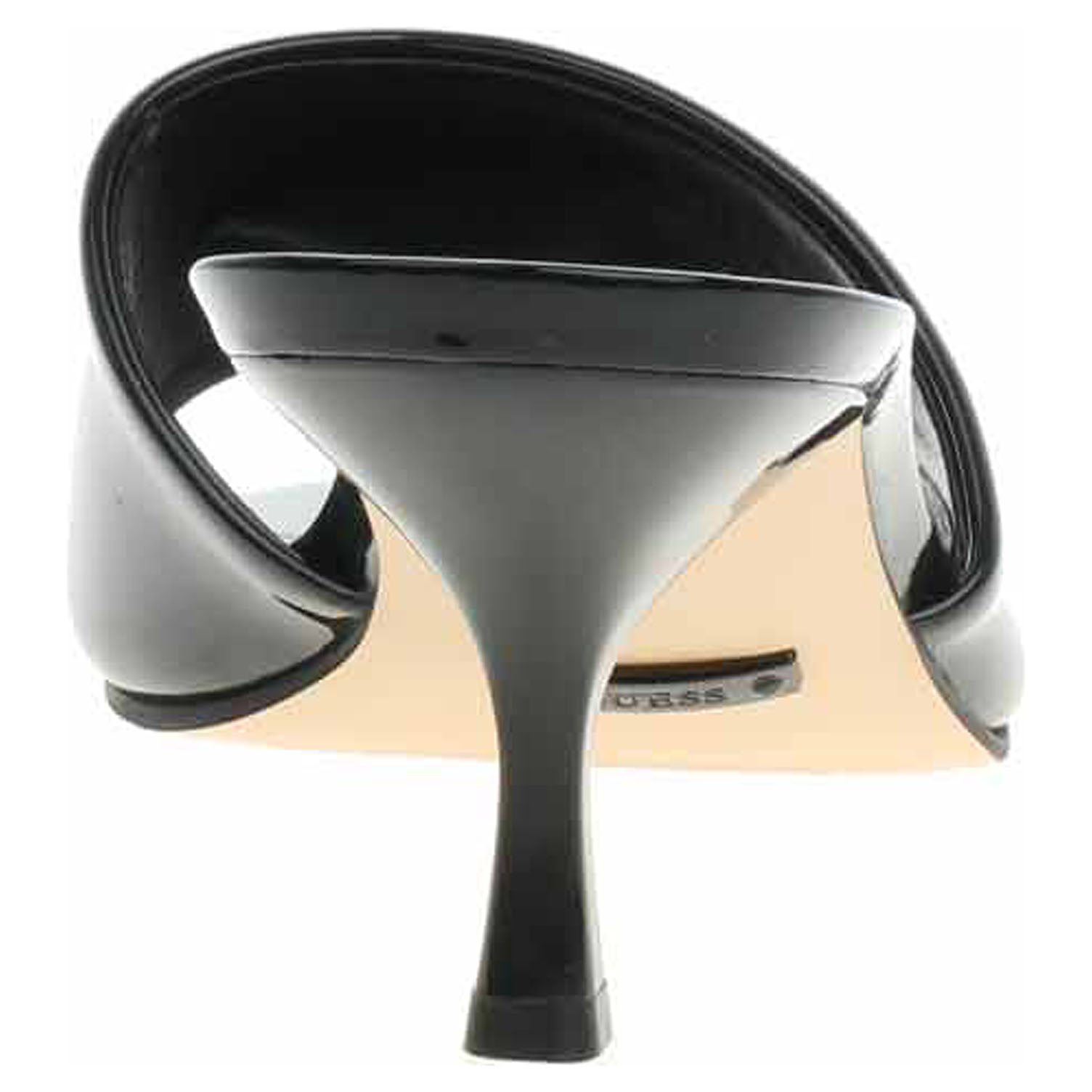 Boty Guess - módní dámské pantofle se zlatým logem v trojúhelníku na nártu mají svršek z lakované syntetiky (100% polyuretan) a podšívku i stélku ze swyntetiky. Podpatek je vysoký 5,7 cm. Módní obuv - je určena pro krátkodobé nošení v nenáročných podmínkách. Prvořadá je módnost nikoliv životnost. Obuv není vhodná pro každodenní používání.