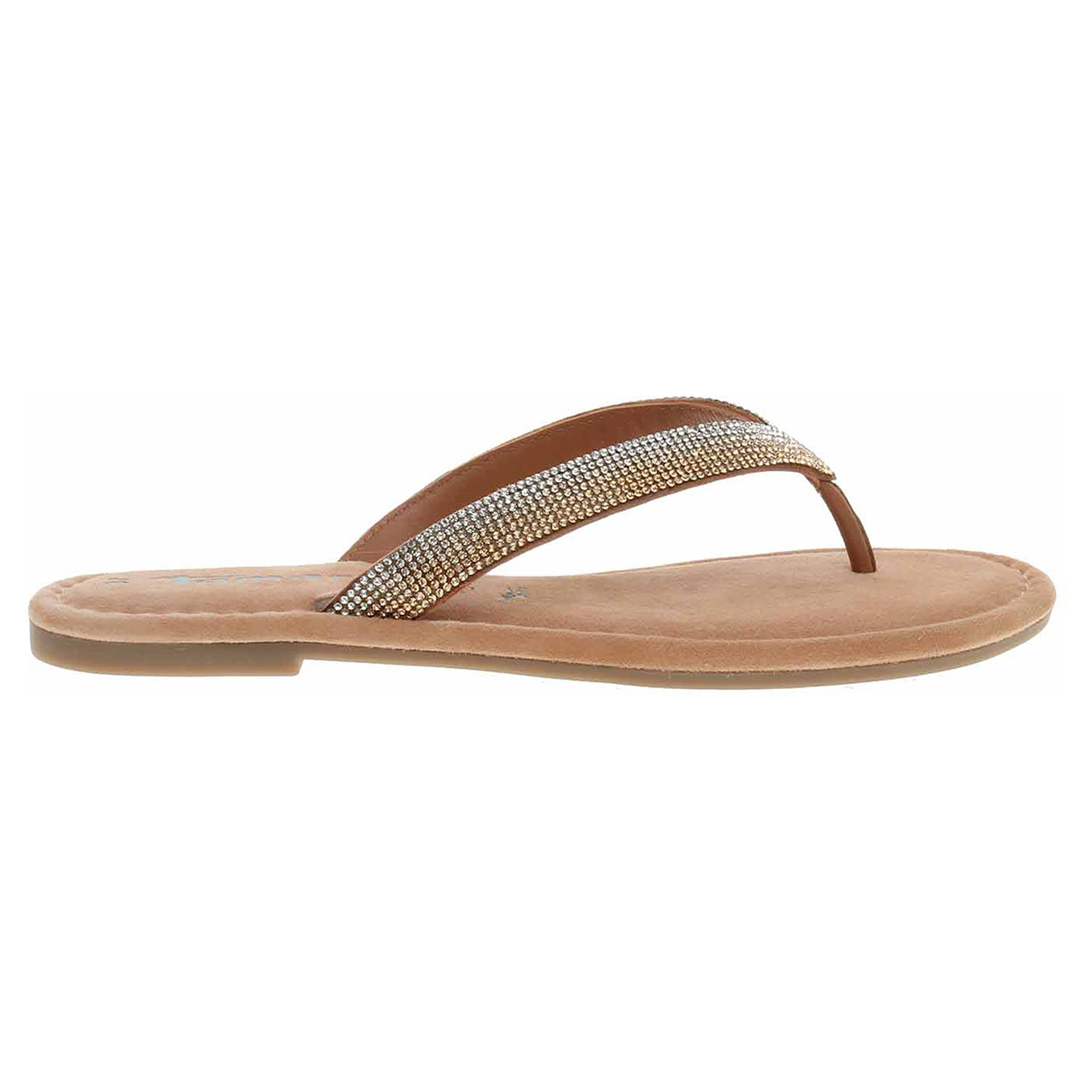 Boty Tamaris - dámské pantofle mezi prsty se svrškem, podšívkou i stélkou z usně. Svršek obuvi je ozdobený kamínky. Obuv je vybavená paměťovou stélkou Touch it, která se přizpůsobuje vašemu chodidlu a zajišťuje při chůzi optimální komfort. Podpatek je vysoký 1,- cm.
