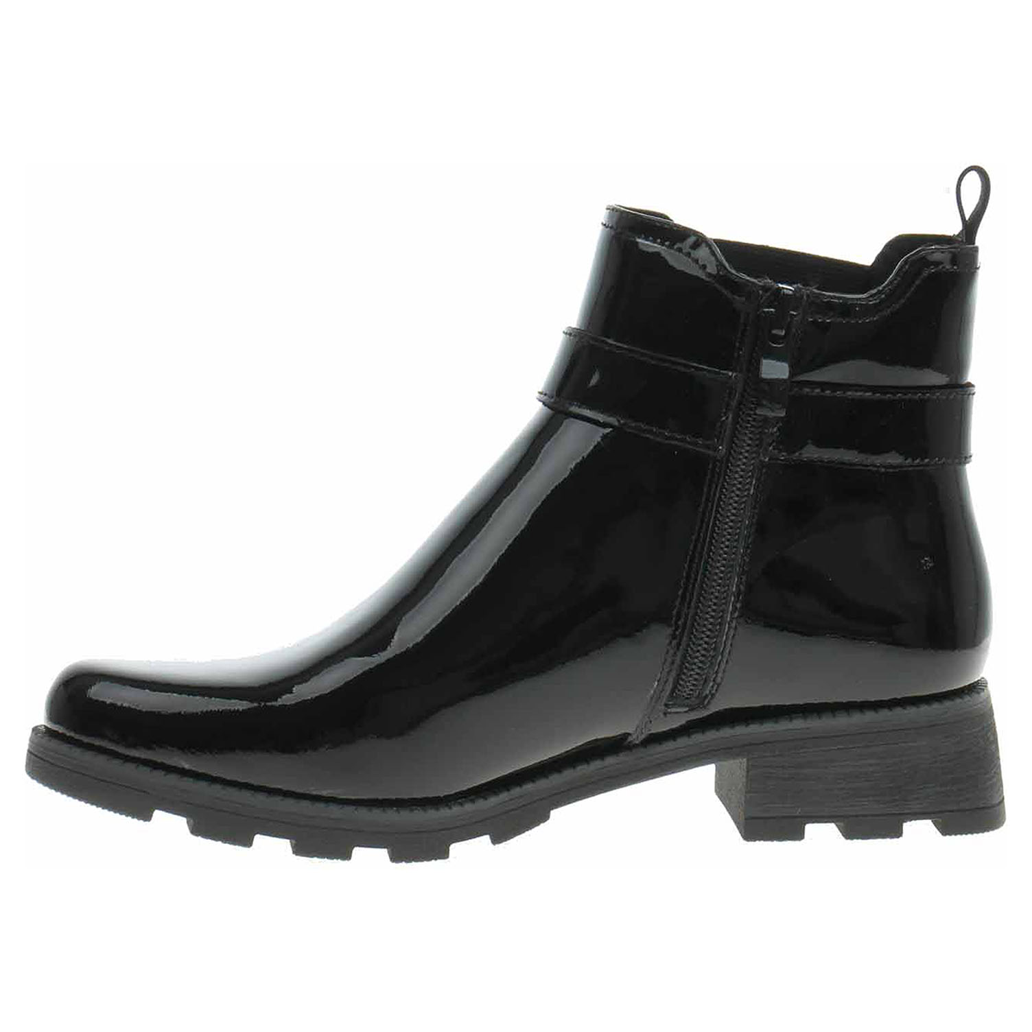 Boty Caprice - lakovaná dámská kotníková obuv se svrškem z usně je vyteplená textilní podšívkou s jemným chloupkem a je vybavená vyndavací stélkou Airmotion s textilní nášlapnou vrstvou. AIRMOTION je zkratka pro AIR a MOTION. Až 300 vzduchem plněných hemisfér v každé CAPRICE AIRMOTION zajišťuje pohodlnou cirkulaci vzduchu a tlumení nárazů. AIRMOTION zabraňuje únavě a poskytuje příjemné klima uvnitř vaší boty. Pohodlné nazouvání zajišťuje zip na vnitřní straně kotníku a vsazená gumička na straně vnější. Podpatek je vysoký 3,5 cm. Lakovaná obuv - hladký, lesklý povrch je docílen lakovou úpravou. Povrch je choulostivý na mechanické poškození, rozmáčení a mráz. Ošetřujte prostředky na lakové usně.