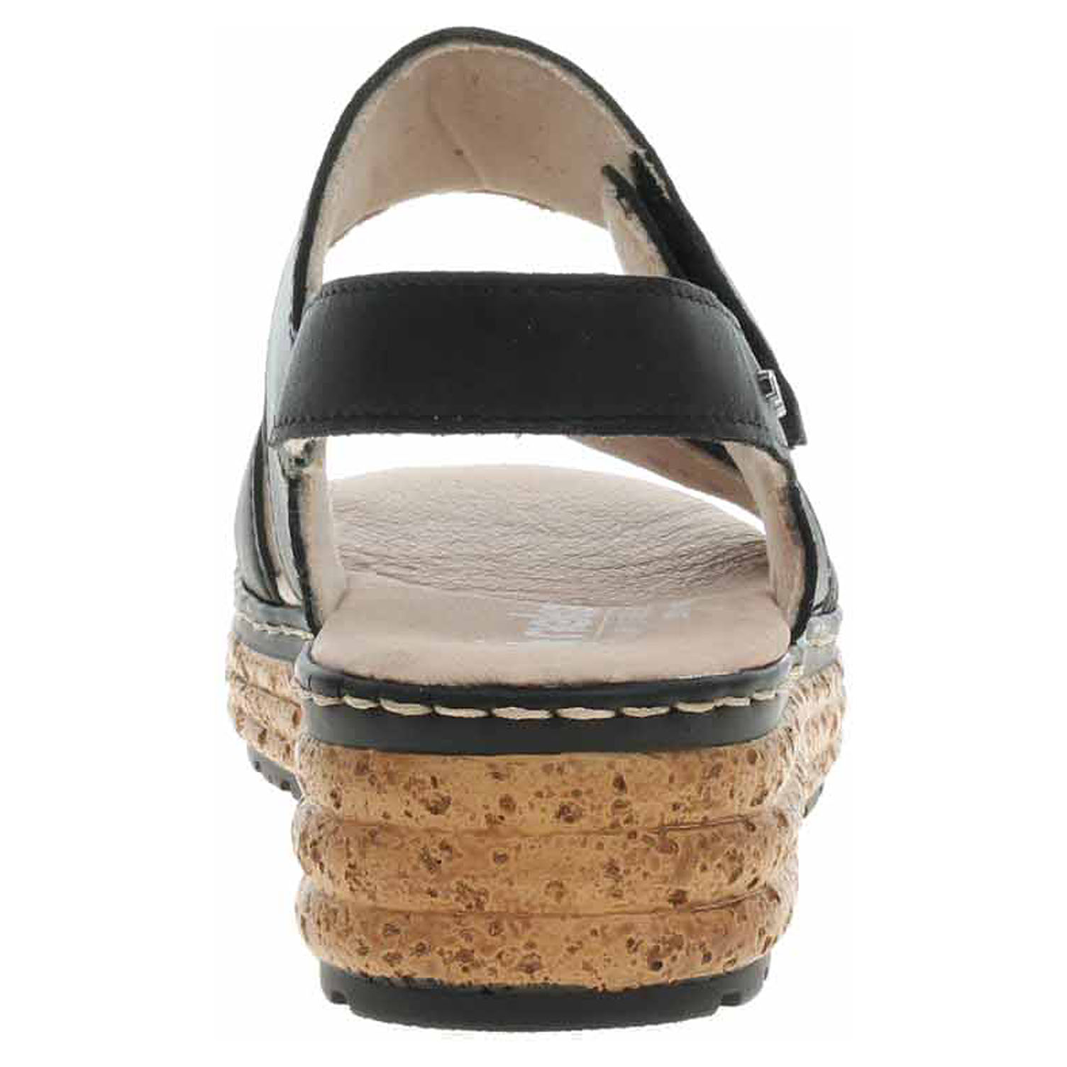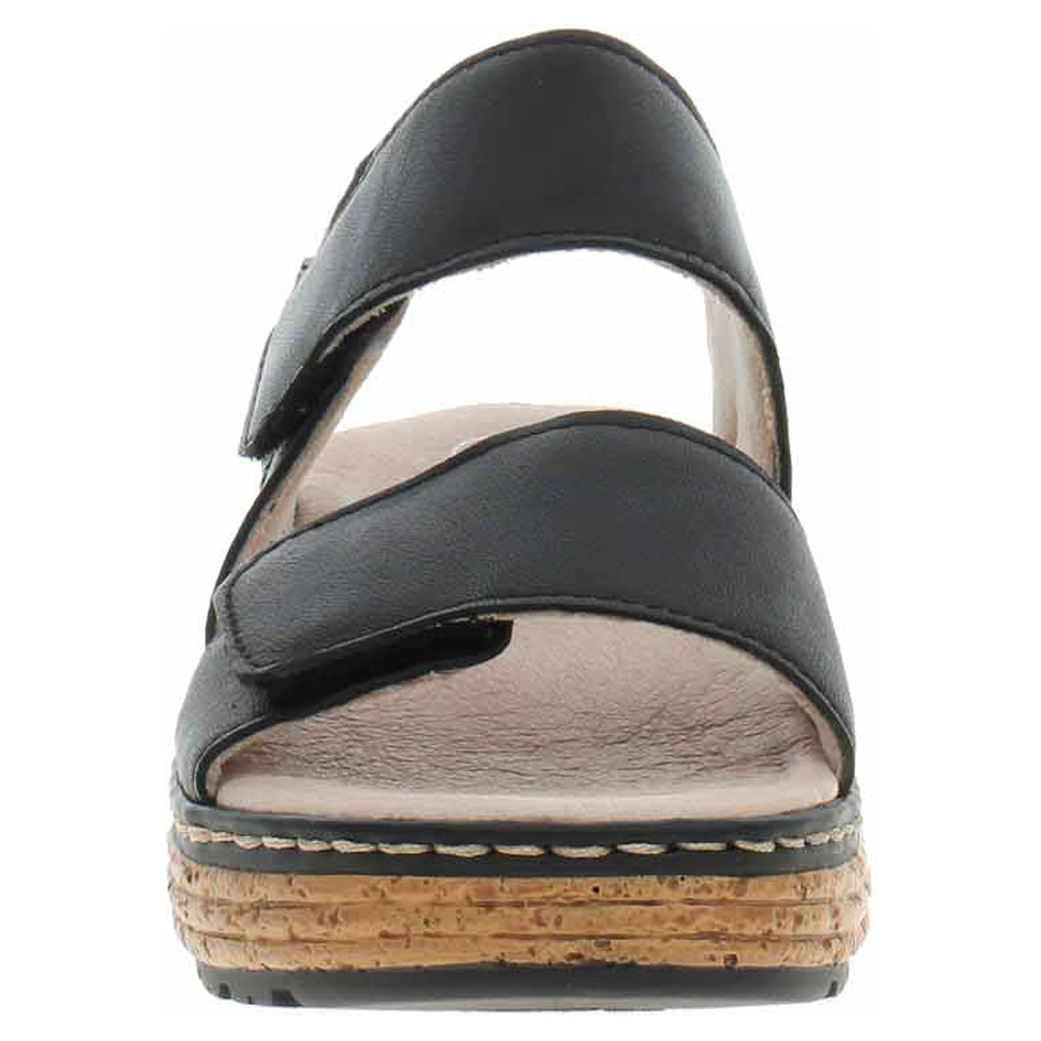 Boty Rieker - dámské sandály nadměrné šíře H se svrškem z usně a s textilní podšívkou jsou vybavené vyměkčenou stélkou s nášlapnou vrstvou z usně. Pásky přes špičku přes nárt se zapínají na suchý zip. Pásek přes patu je vybavený vsazenou gumičkou. Podešev je flexibilní a díky systému Antistress skvěle tlumí nárazy a otřesy. Klínek je vysoký 4,4 cm a platforma je vysoká 2,5 cm. Podešev je flexibilní a díky systému Antistress (lehkost, pružnost, prostornost a vynikající absorpce nárazů) Vám obuv zajistí pohodlí při každém kroku.
