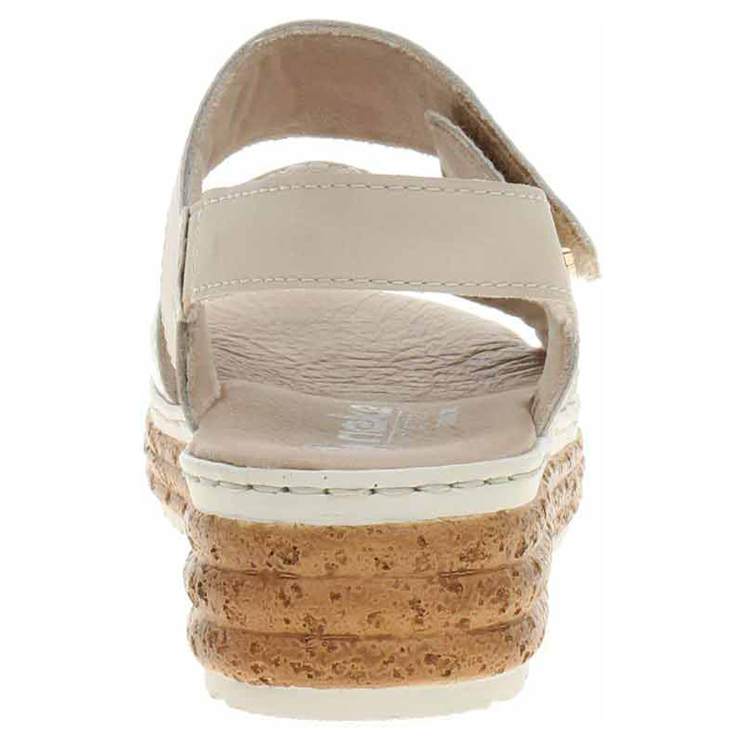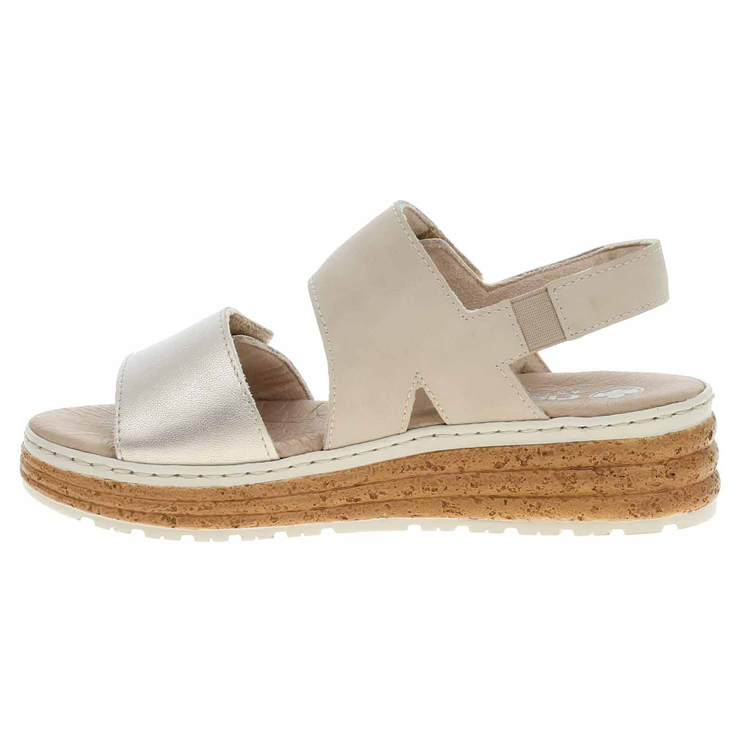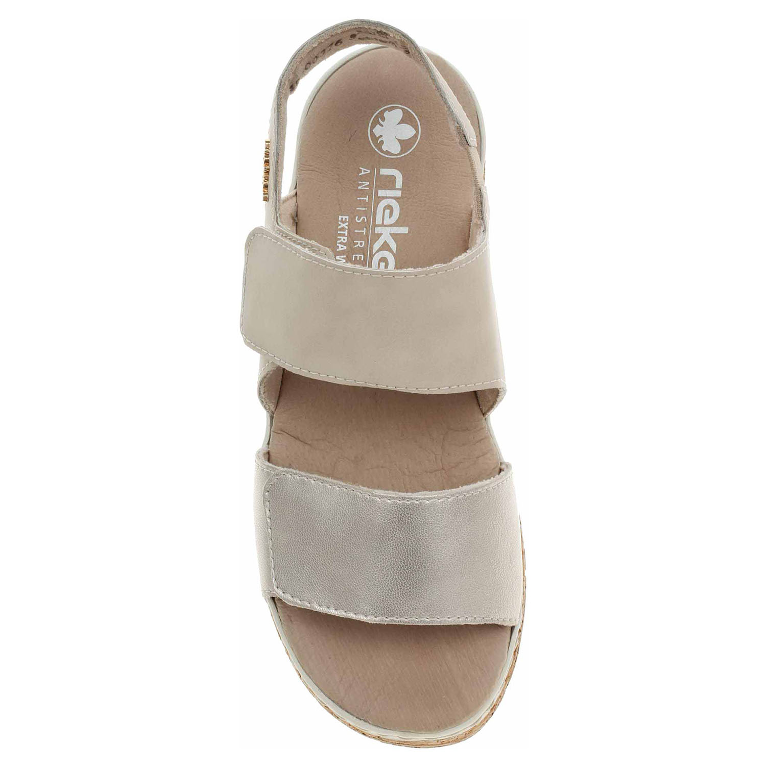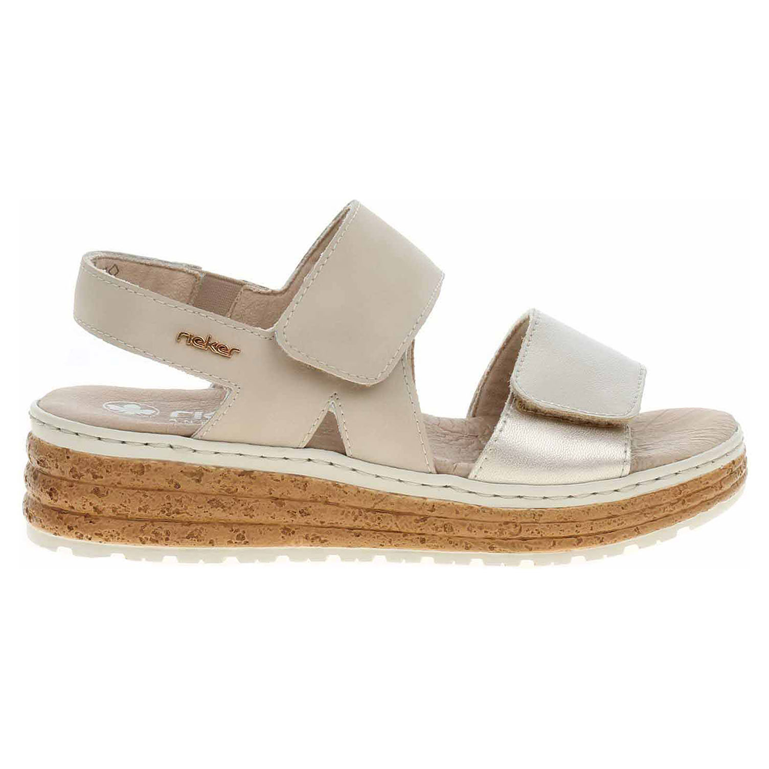 Boty Rieker - dámské béžové sandály se zlatým páskem na nártu nadměrné šíře H se svrškem z usně a s textilní podšívkou jsou vybavené vyměkčenou stélkou s nášlapnou vrstvou z usně. Pásky přes špičku přes nárt se zapínají na suchý zip. Pásek přes patu je vybavený vsazenou gumičkou. Podešev je flexibilní a díky systému Antistress skvěle tlumí nárazy a otřesy. Klínek je vysoký 4,4 cm a platforma je vysoká 2,5 cm. Podešev je flexibilní a díky systému Antistress (lehkost, pružnost, prostornost a vynikající absorpce nárazů) Vám obuv zajistí pohodlí při každém kroku.
