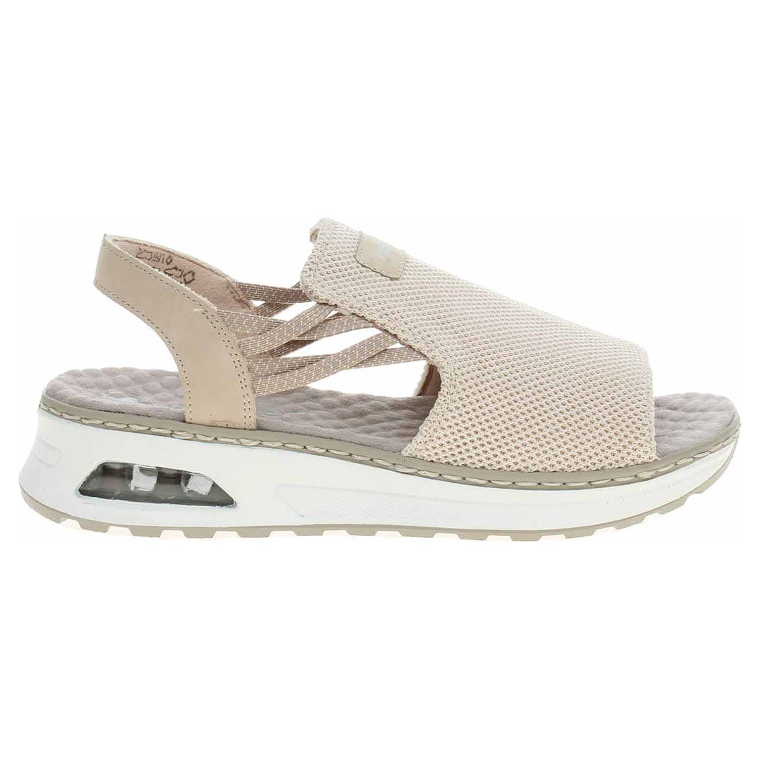 Boty Rieker - dámské sandály nadměrné šíře se svrškem kombinovaným syntetika/textil a s textilní podšívkou i stélkou mají klínek se vzduchovým polštářem vysoký 4,- cm a platformu 2,- cm. Speciální masážní stélka vám poskytne příjemný pocit při každém kroku. Gumičky na vnější i na vnitřní straně kotníku umožňují pohodlné nazouvání a zajišťují vyšší stabilitu nohy v obuvi. Podešev je flexibilní a díky systému Antistress (lehkost, pružnost, prostornost a vynikající absorpce nárazů) Vám obuv zajistí pohodlí při každém kroku. Obuv je 100% VEGAN = při výrobě obuvi nebyly použity žádné materiály ze zvířat.