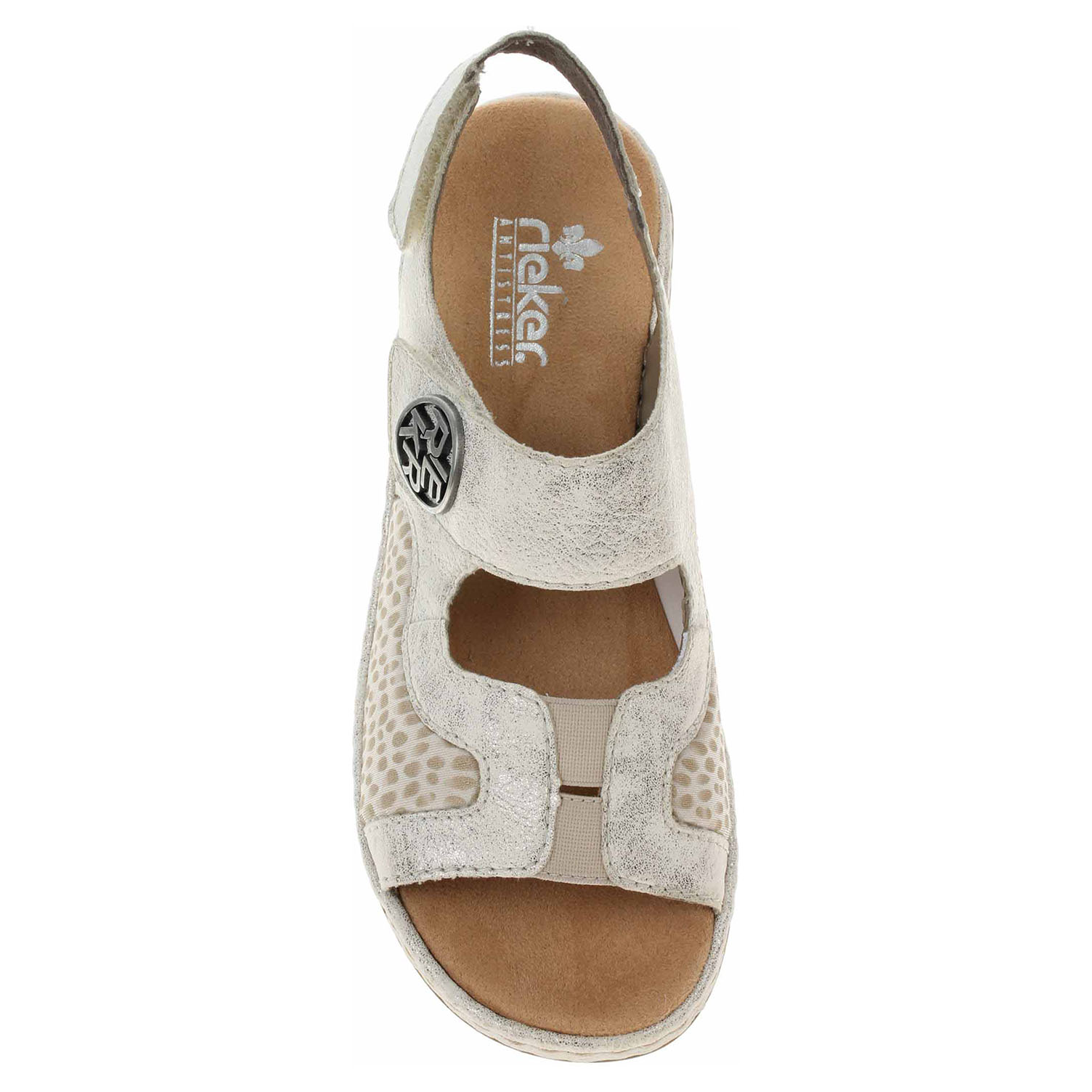 Boty Rieker - dámské sandály se svrškem kombinovaným syntetika/textil, s podšívkou ze syntetiky a s textilní stélkou mají klínek vysoký 3,- cm. Obuv je na špičce vybavená vsazenými gumičkami, které umožňují částečné zvětšení objemu. Pásky přes nárt i přes patu se zapínají na suchý zip. Podešev je flexibilní a díky systému Antistress skvěle tlumí nárazy a otřesy.