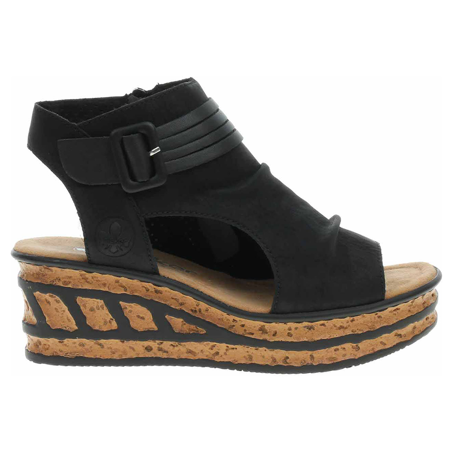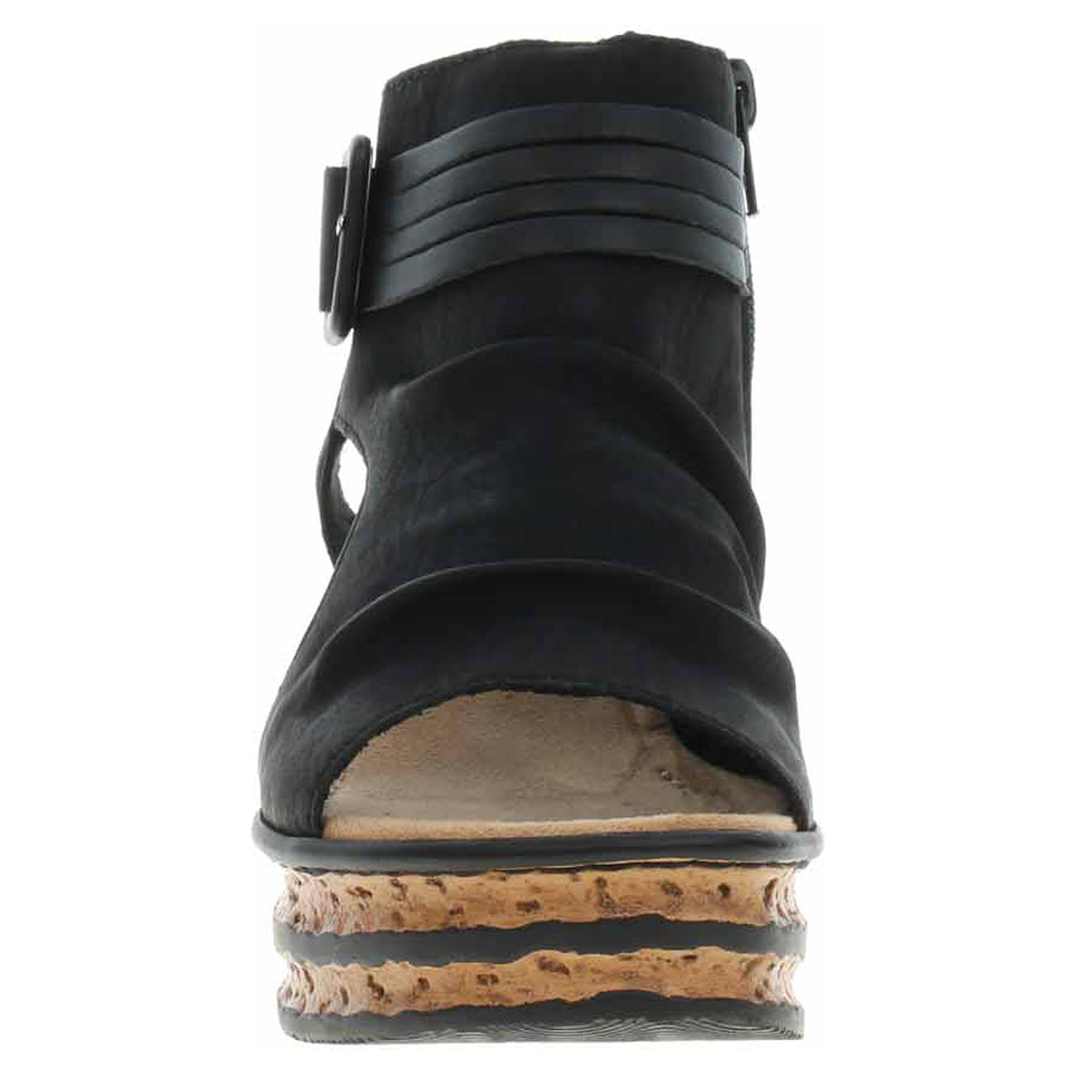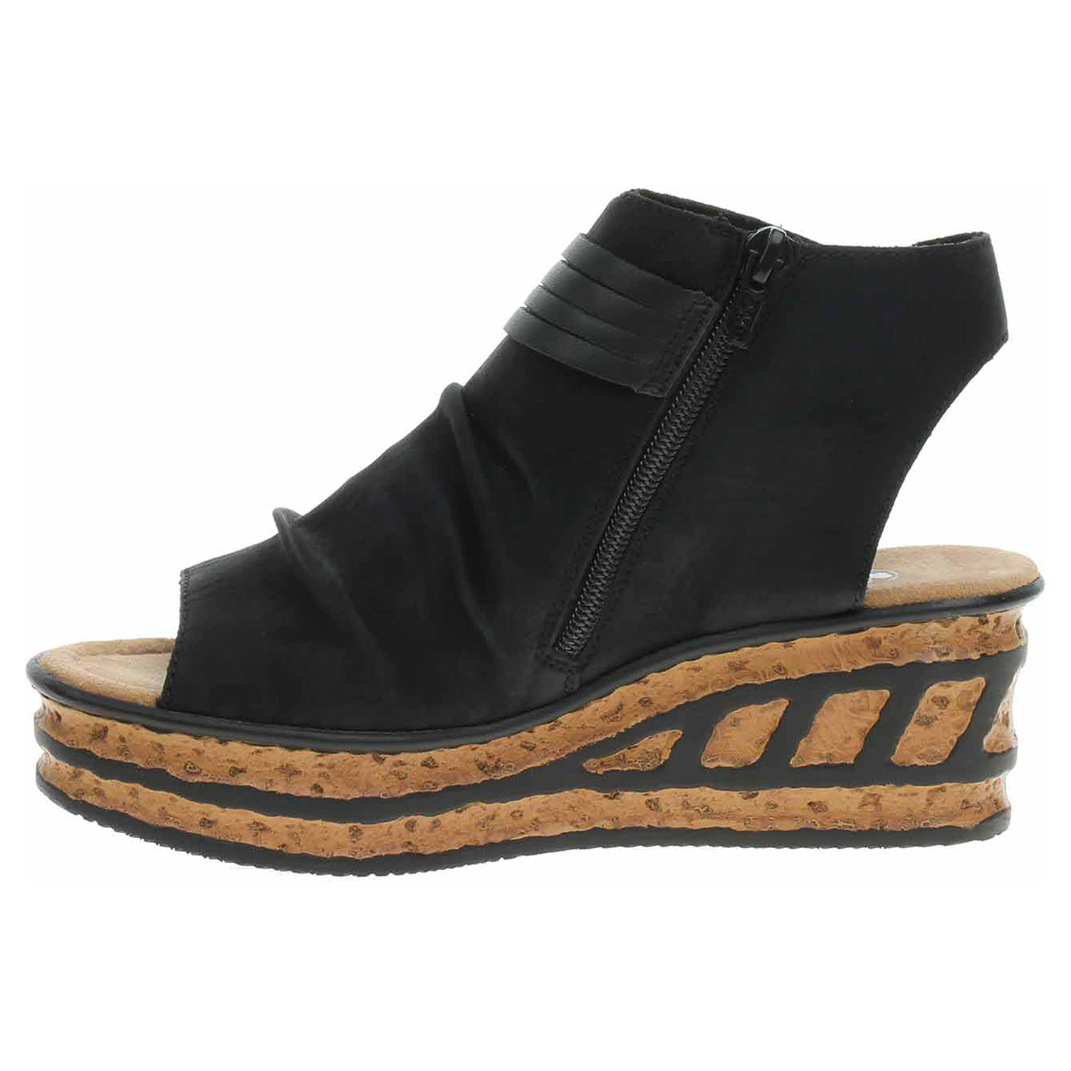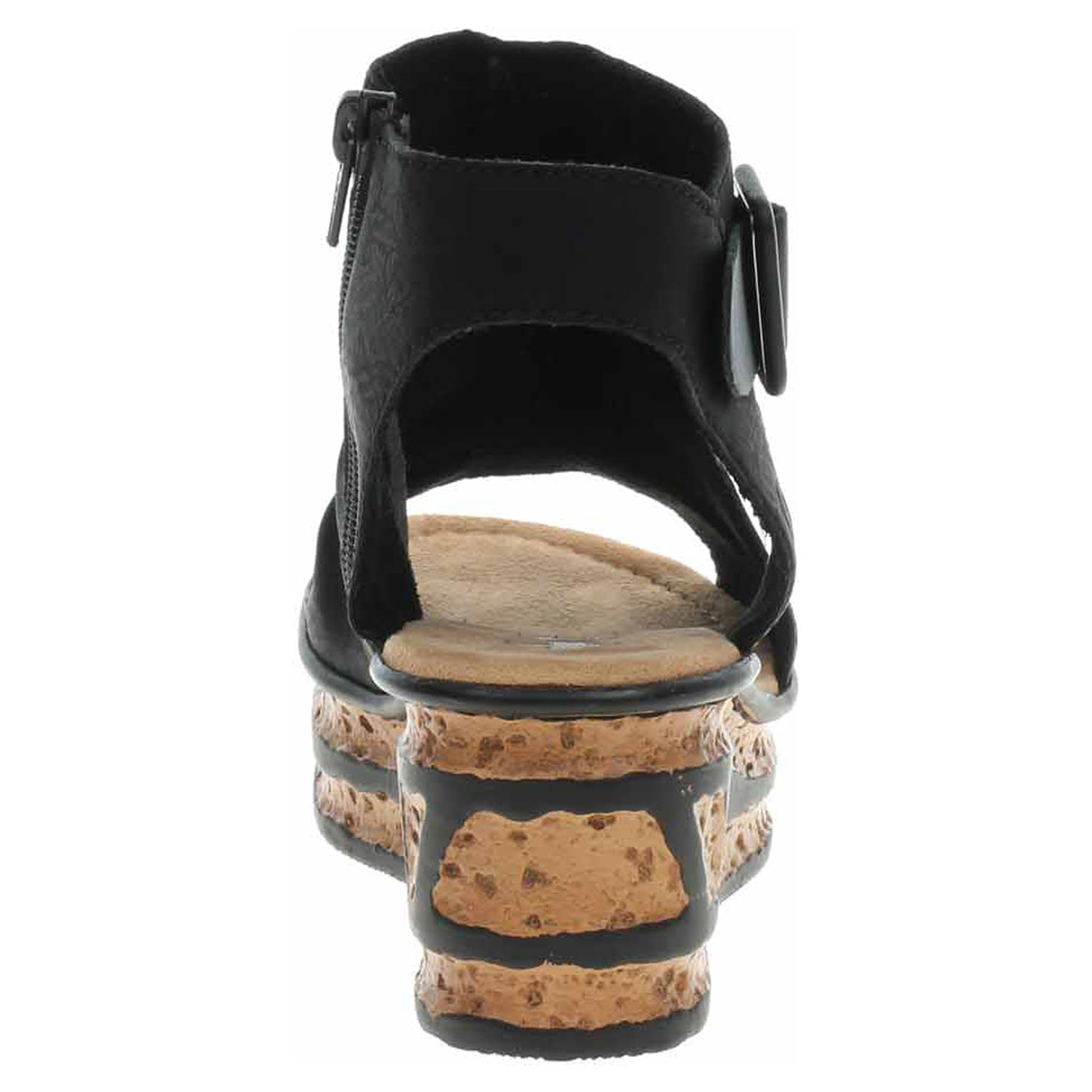 Boty Rieker - dámské sandály se svrškem ze syntetiky a s textilní podšívkou mají vyměkčenou stélku s textilní nášlapnou vrstvou. Klínek je vysoký 6,- cm a platforma je vysoká 3,- cm. Pohodlné nazouvání zajišťuje zip na vnitřní straně. Přezka na vnější straně má pouze ozdobnou funkci. Podešev je flexibilní a díky systému Antistress (lehkost, pružnost, prostornost a vynikající absorpce nárazů) Vám obuv zajistí pohodlí při každém kroku.