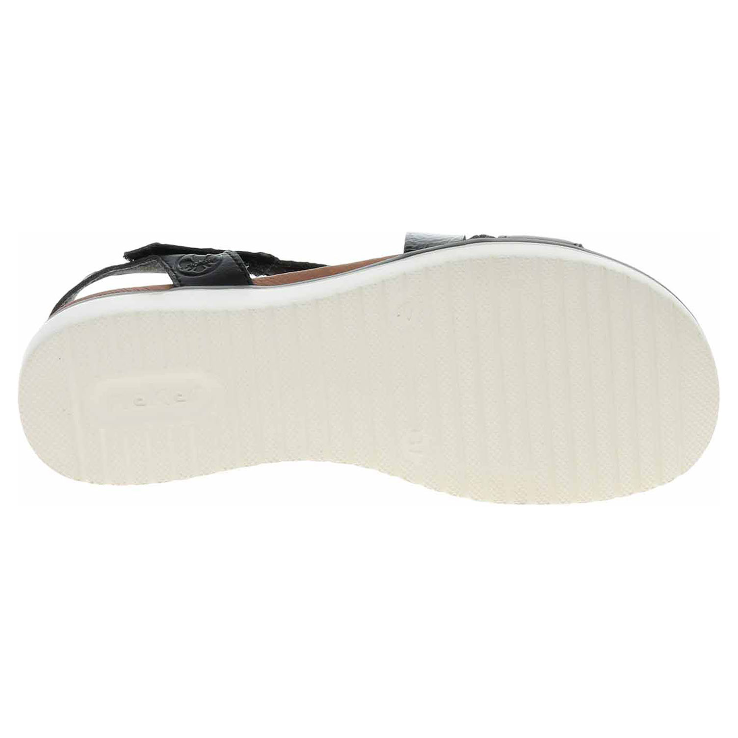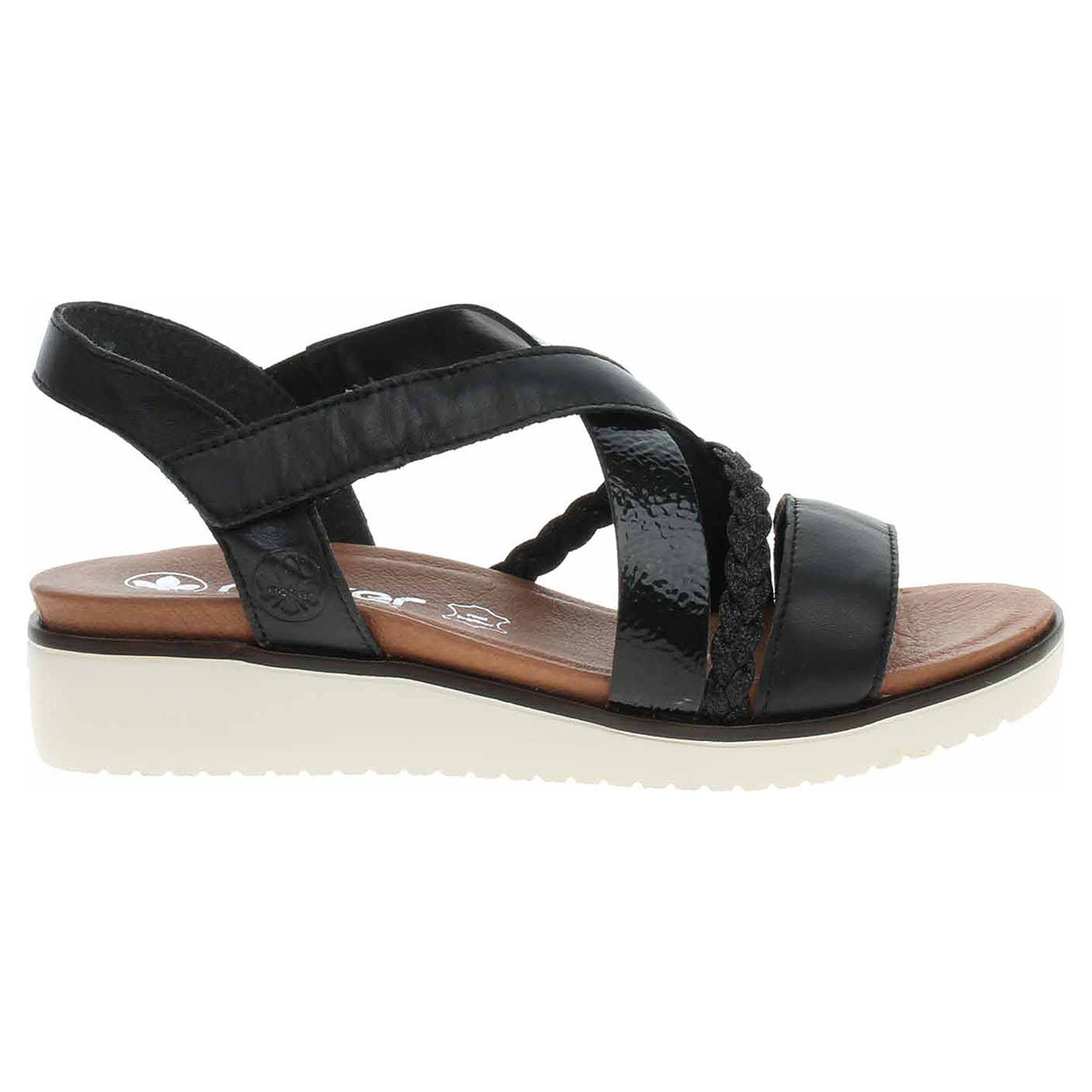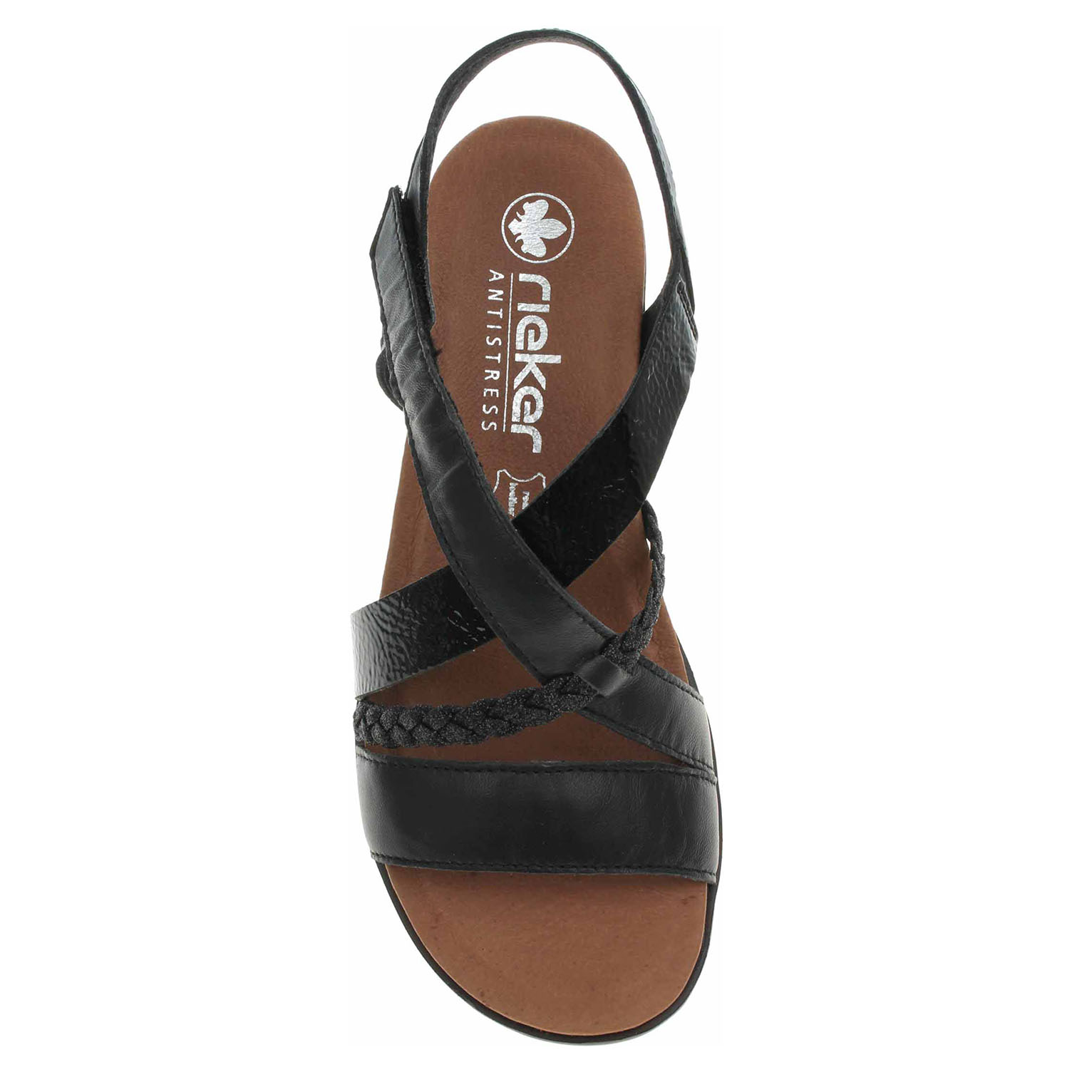 Boty Rieker - dámské sandály se svrškem kombinovaným useň/syntetika a s podšívkou ze syntetiky jsou vybavené vyměkčenou stélkou s nášlapnou vrstvou z usně. Pohodlné nazouvání zajišťují překřížené pásky přes nárt, kdy horní se zapíná na vnější straně na suchý zip a spodní je vybavený na vnitřní straně vsazenou gumičkou. Podešev je flexibilní a díky systému Antistress skvěle tlumí nárazy a otřesy. Klínek je vysoký 4,- cm.
