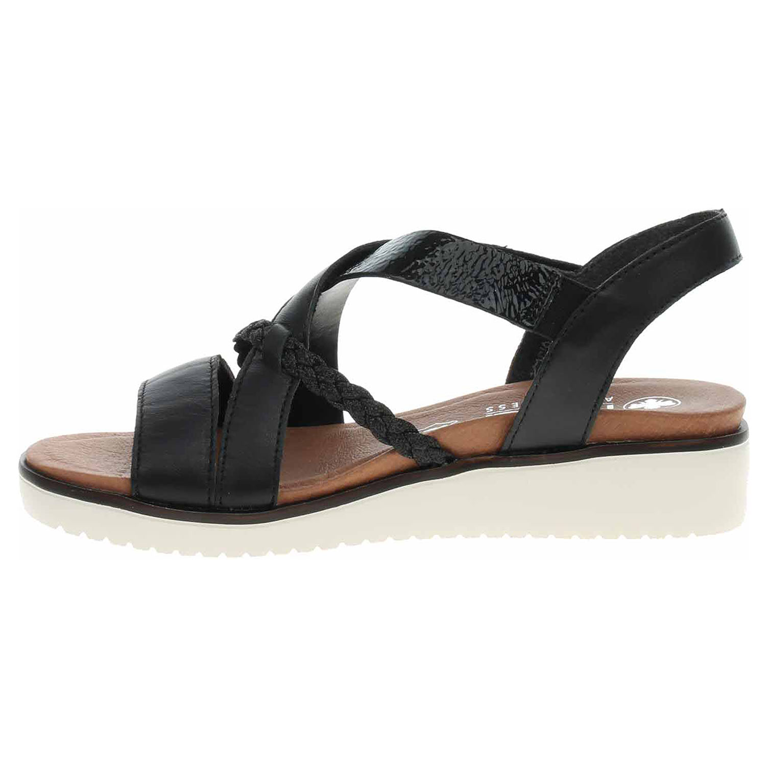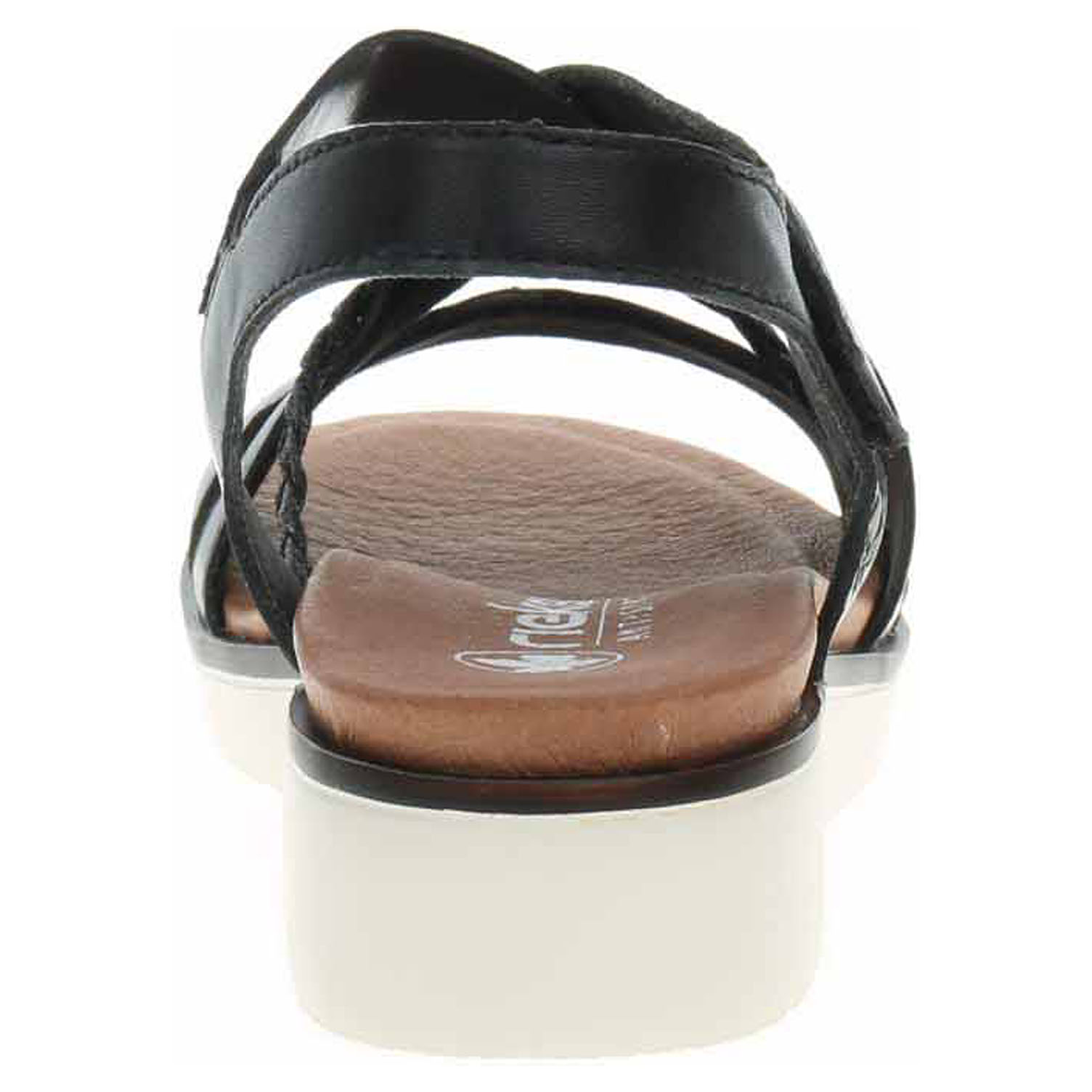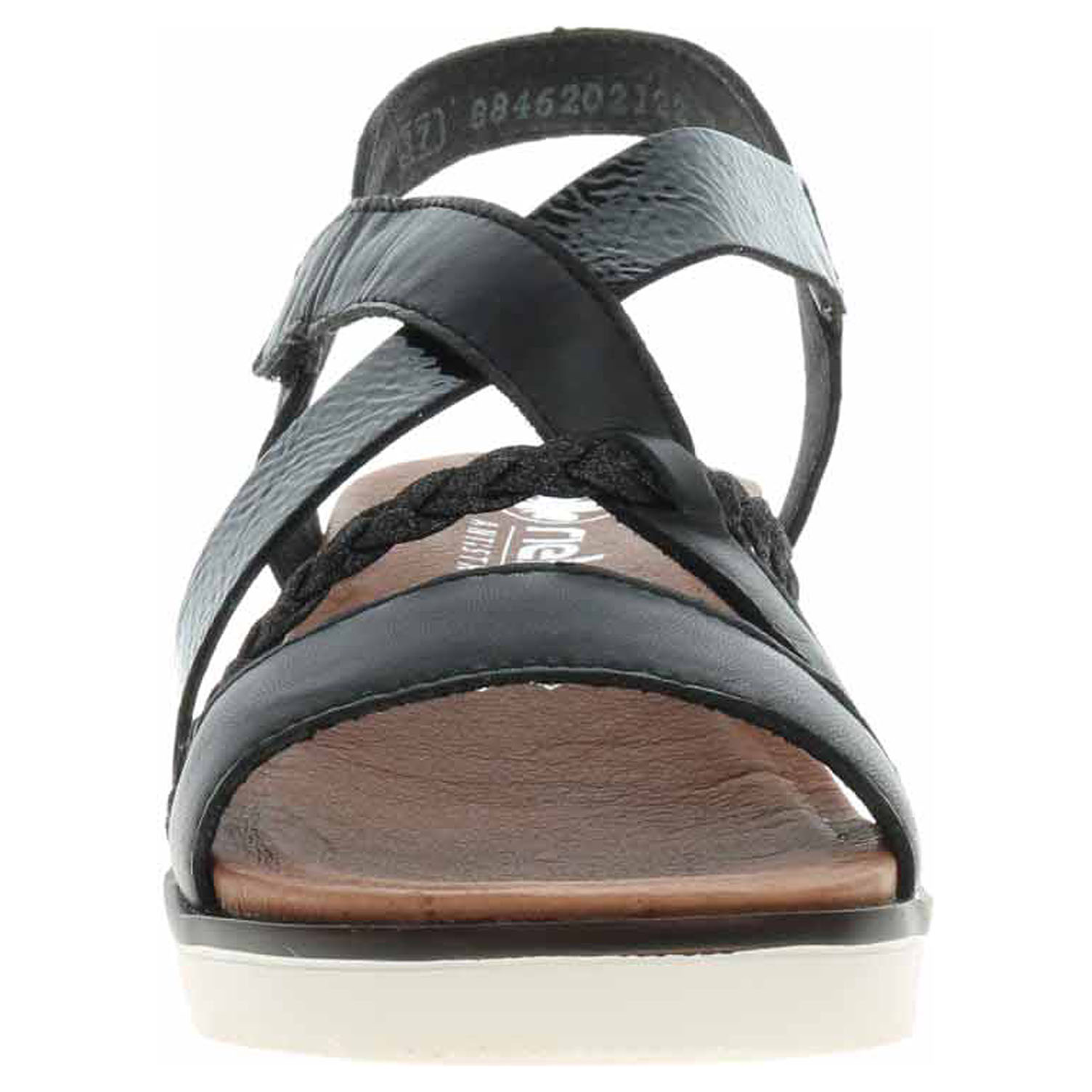 Boty Rieker - dámské sandály se svrškem kombinovaným useň/syntetika a s podšívkou ze syntetiky jsou vybavené vyměkčenou stélkou s nášlapnou vrstvou z usně. Pohodlné nazouvání zajišťují překřížené pásky přes nárt, kdy horní se zapíná na vnější straně na suchý zip a spodní je vybavený na vnitřní straně vsazenou gumičkou. Podešev je flexibilní a díky systému Antistress skvěle tlumí nárazy a otřesy. Klínek je vysoký 4,- cm.