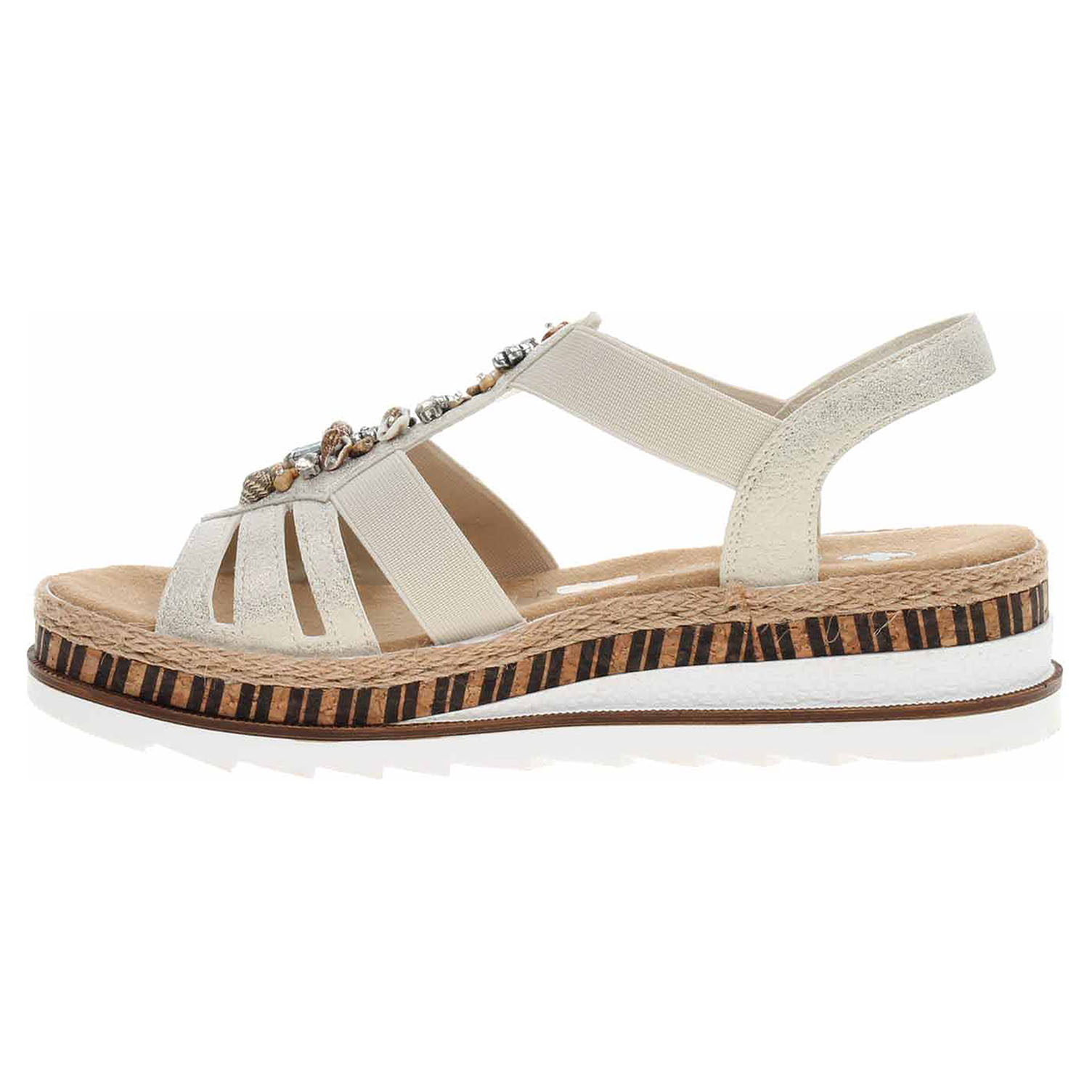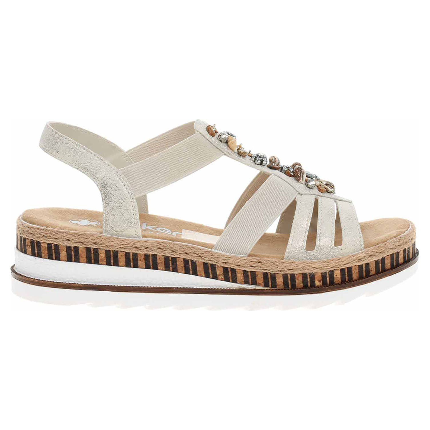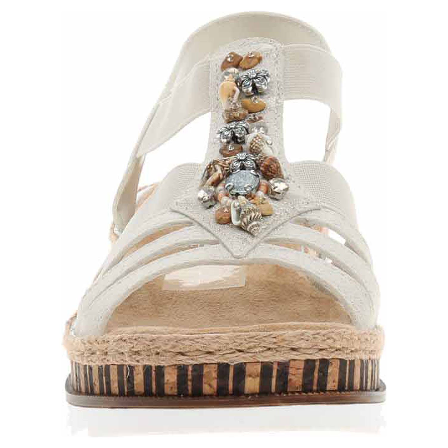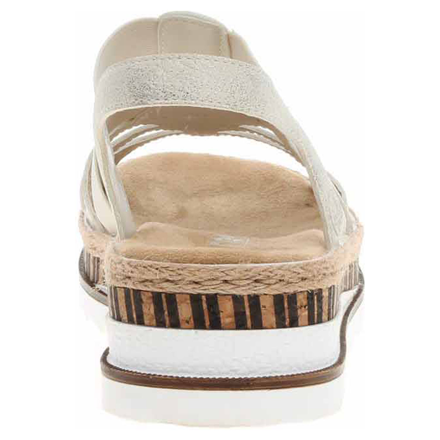Boty Rieker - dámské sandály se svrškem i podšívkou ze syntetiky a s textilní, vyměkčenou stélkou mají klínek vysoký 4,4 cm a platformu 2,5 cm. Gumičky na vnější i na vnitřní straně nártu a na kotníku umožňují pohodlné nazouvání a zajišťují vyšší stabilitu nohy v obuvi. Podešev je flexibilní a díky systému Antistress (lehkost, pružnost, prostornost a vynikající absorpce nárazů) Vám obuv zajistí pohodlí při každém kroku.