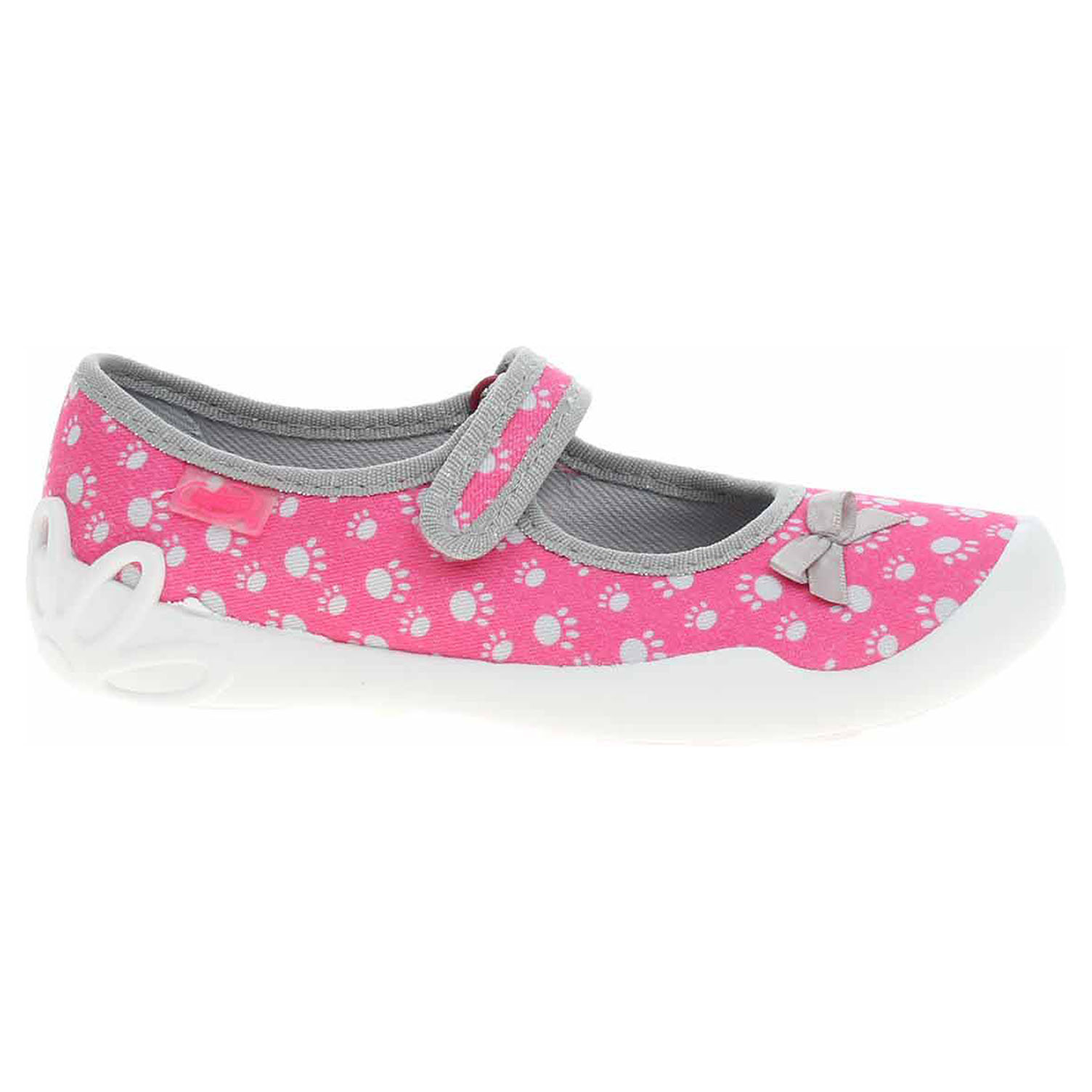 Boty Befado - dívčí domácí bačkory s textilním svrškem, podšívkou i stélkou jsou vybavené dýchající podešví. Pásek přes nárt, který se zapíná na suchý zip, zajišťuje pohodlné nazouvání a stabilitu nohy v obuvi. Dětská obuv - je vzhledem ke způsobu užívání vystavena většímu mechanickému poškození - okopání. Mechanické poškození není důvodem k reklamaci.