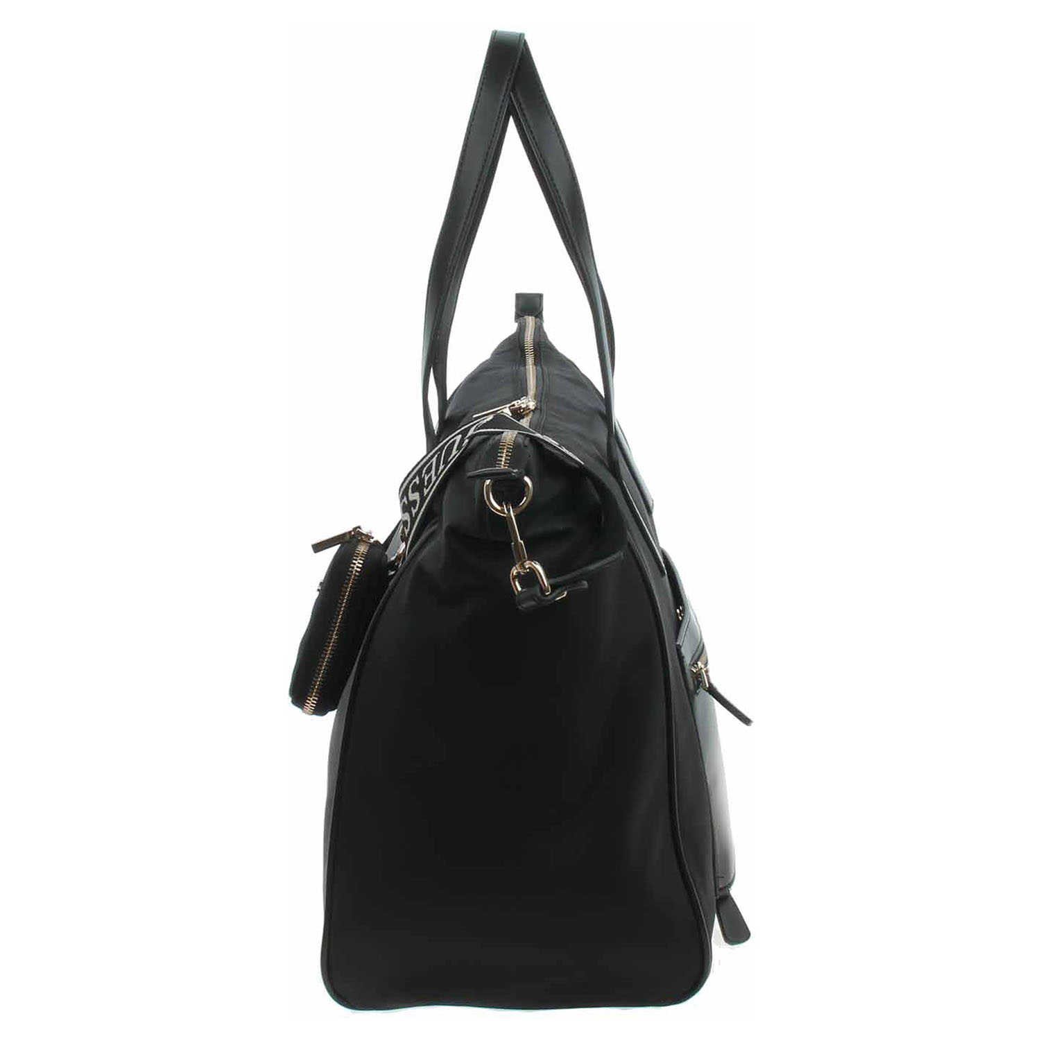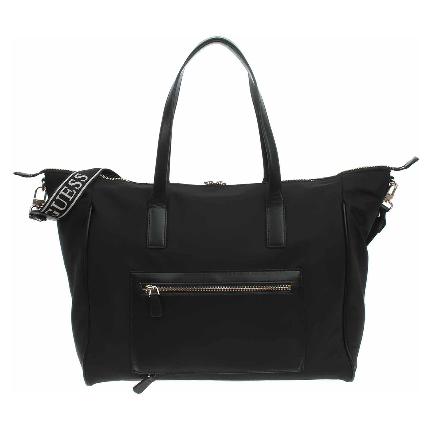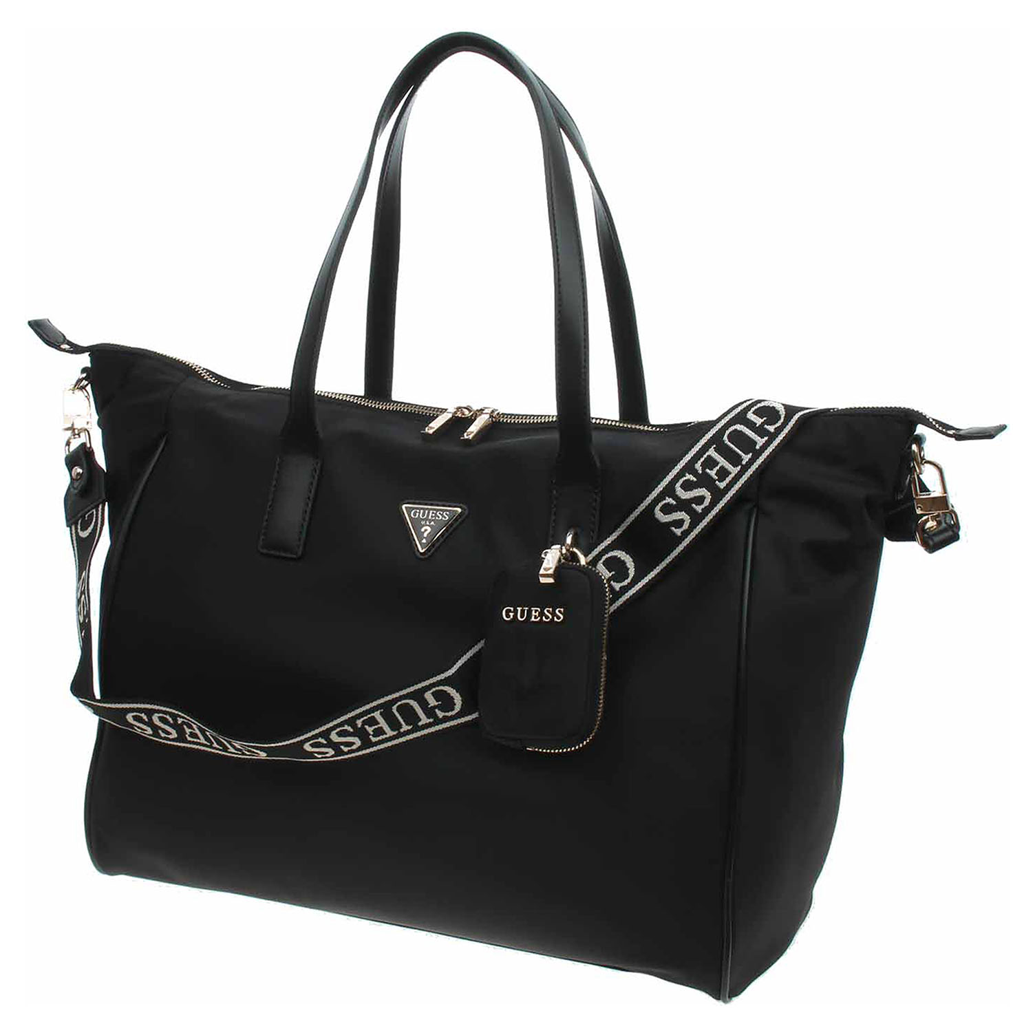 Guess - prostorná cestovní taška s logem trojúhelníku na přední straně je ideální na stylové víkendové cestování. Je vyrobena z nylonu s podšívkou z polyesteru a zapíná se na dvoucestný zip. Tašku se zlatým kováním je možno nosit za ucha v ruce nebo na regulovatelném ramenním popruhu, který se dá odepnout. Taška je na přední straně vybavená pohotovostní kapsičkou se zipem, která se dá odepnot. Rozměry: 40 x 33 x 20 cm.Dno tašky je opatřeno kovovými nožičkami. Vnitřní výbava: 2x otevřená kapsička na mobil apod., 1x zipová kapsa na cennosti.