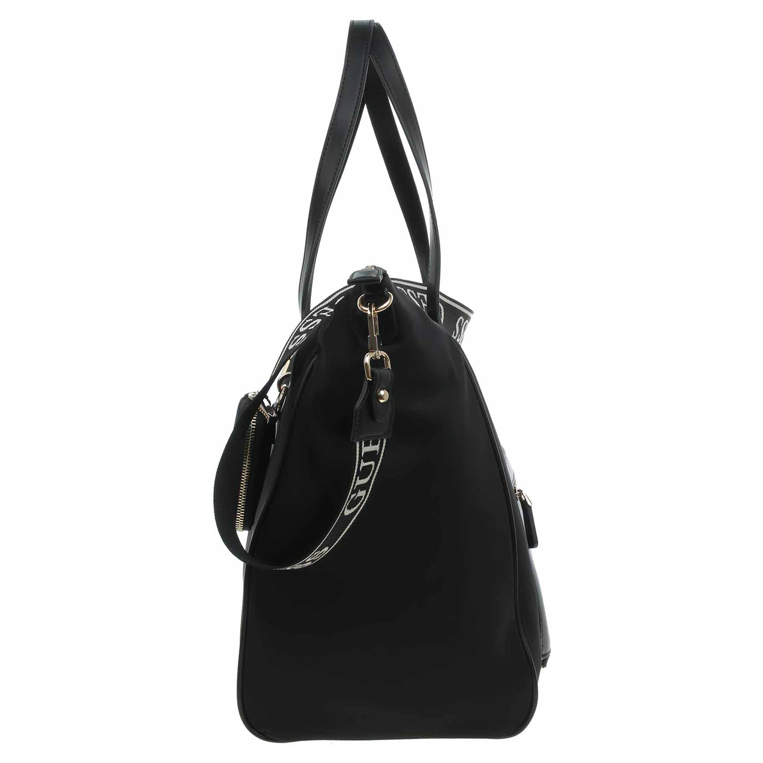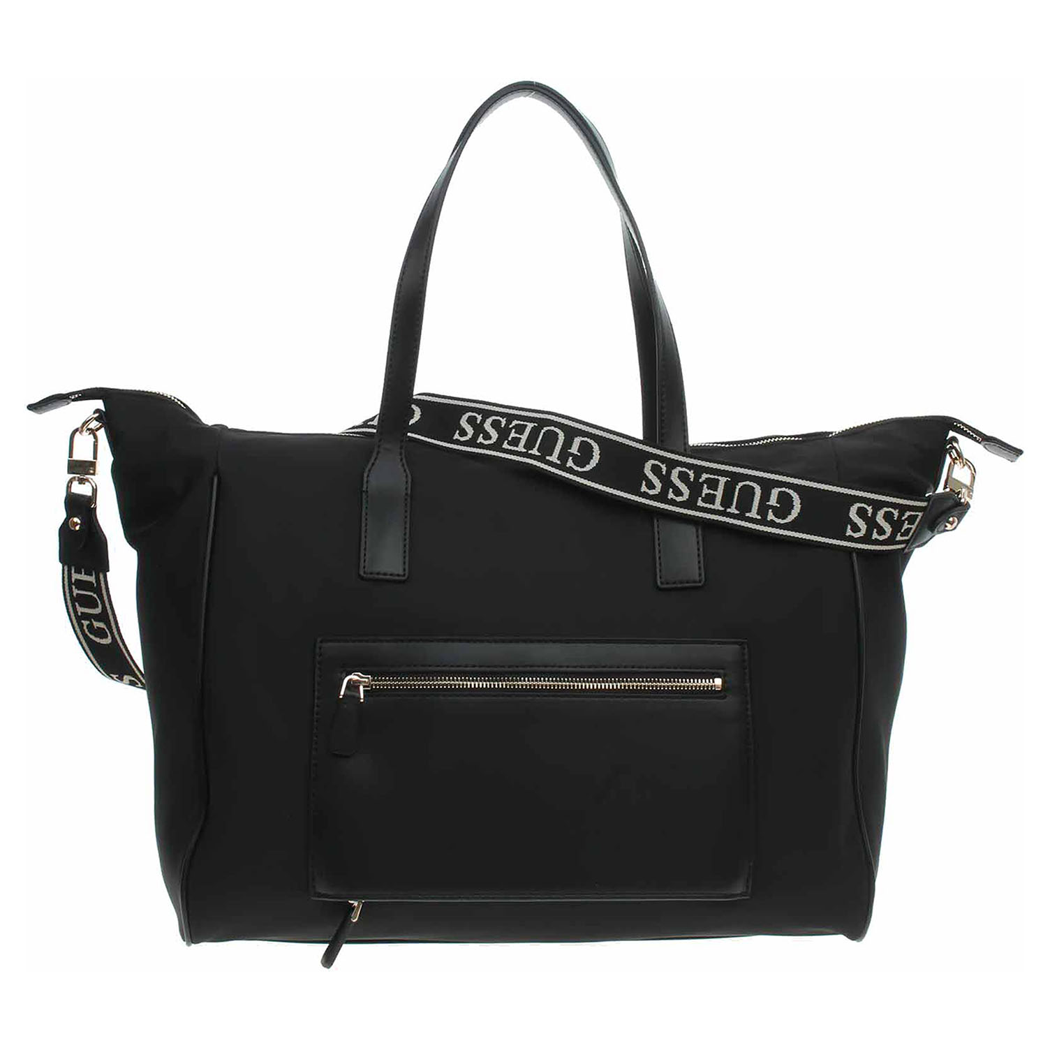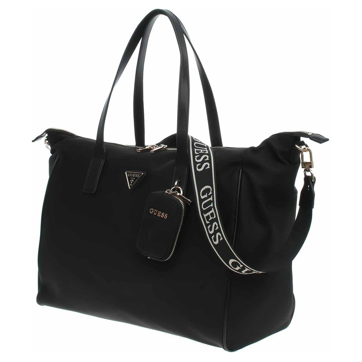 Guess - prostorná cestovní taška s logem trojúhelníku na přední straně je ideální na stylové víkendové cestování. Je vyrobena z nylonu s podšívkou z polyesteru a zapíná se na dvoucestný zip. Tašku se zlatým kováním je možno nosit za ucha v ruce nebo na regulovatelném ramenním popruhu, který se dá odepnout. Taška je na přední straně vybavená pohotovostní kapsičkou se zipem, která se dá odepnot. Rozměry: 40 x 35 x 20 cm.Dno tašky je opatřeno kovovými nožičkami. Vnitřní výbava: 2x otevřená kapsička na mobil apod., 1x zipová kapsa na cennosti.