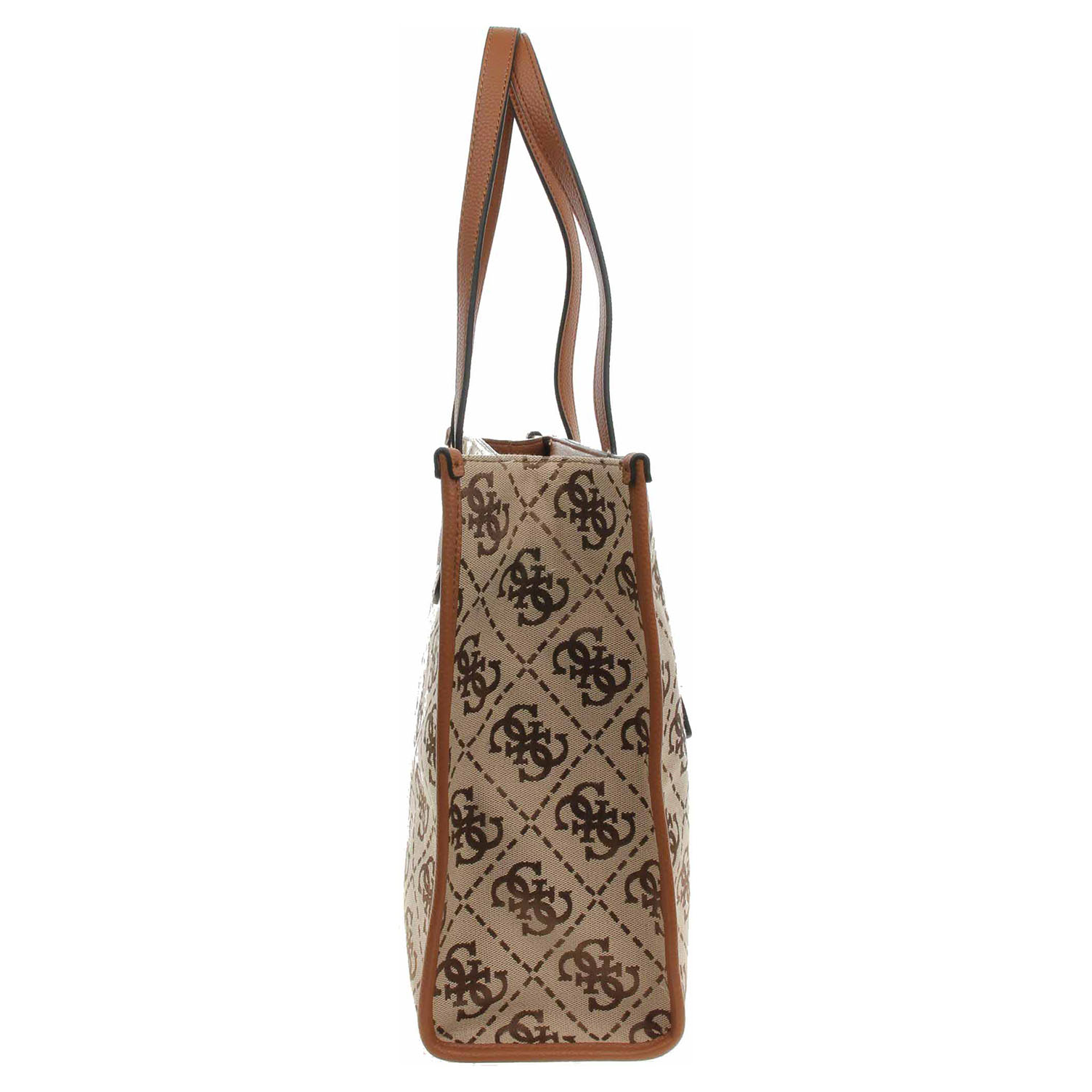 Guess - dámská kabelka se zapínáním na zip je vyrobená ze 100% polyesteru s potiskem loga 4G (podšívka 100% polyester) a na zadní straně je vybavená kapsou se zipem. Rozměry: - 40 x 33 x 14 cm. Zip, logo, nýtky, kroužky i kovové nožičky jsou z leštěného kovu zlaté barvy. Kabelku je možno nosit v ruce (výška ucha 13 cm). Vnitřní výbava: 1x kapsa se zipem, 2x kapsička bez zapínání. Součástí balení je praktický dustbag pro uložení kabelky.