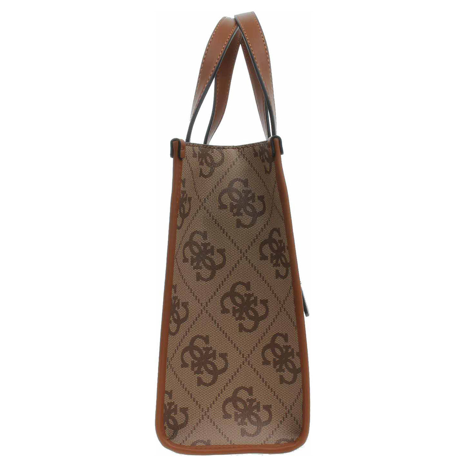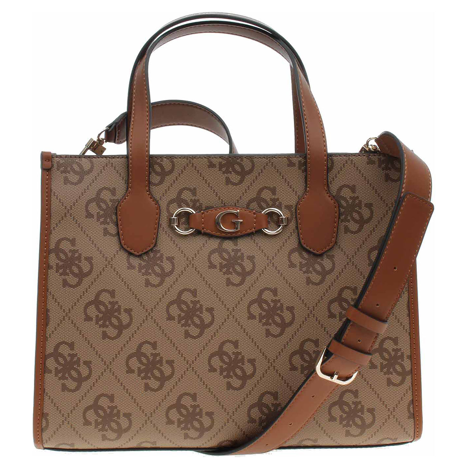 Guess - dámská dvoukomorová kabelka se zapínáním na zip je vyrobená ze 100% polyuretanu (podšívka 100% polyester) na zadní straně je vybavená kapsou se zipem. Rozměry: - 34 x 26 x 13 cm. Zip, logo, nýtky, kroužky i kovové nožičky jsou z leštěného kovu zlaté barvy. Kabelku je možno nosit v ruce (výška ucha 13 cm) nebo přes rameno na regulovatelném popruhu, který je možno odepnout (délka cca. 110-130 cm). Vnitřní výbava: 1x kapsa se zipem, 2x kapsička bez zapínání. Součástí balení je praktický dustbag pro uložení kabelky.