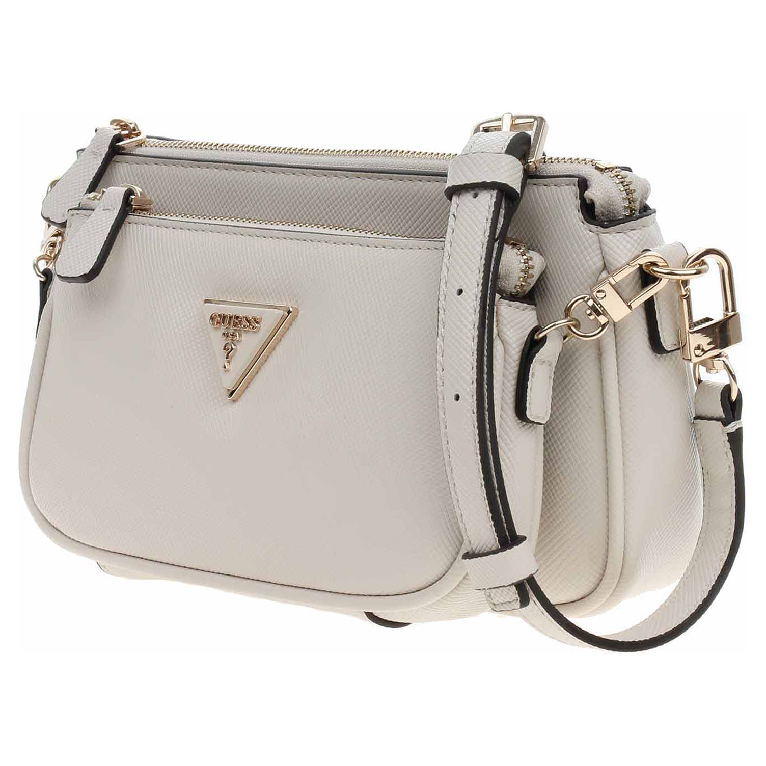 Guess - dámská crossbody kabelka Noelle ze 100% polyuretanu s textilní podšívkou z polyesteru se zapíná na zip a má rozměry 23 x 14 x 5 cm. Kabelku je možno nosit přes rameno nebo crossbody na regulovatelném popruhu, který se dá odepnout. Nebo po odepnutí pásku se dá kabelka nosit jen v ruce. Na přední straně je kabelka vybavená kapsou se zipem, která se po odepnutí karabinek dá nosit samostatně jako psaníčko. Vnitřní výbava: 1x kapsa se zipem, 3 x kapsička na drobnosti. Kabelku neumývejte. Otírejte suchým, čistým hadříkem. Dodržujte pokyny pro péči na štítku.
