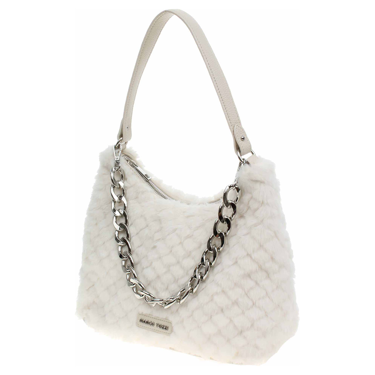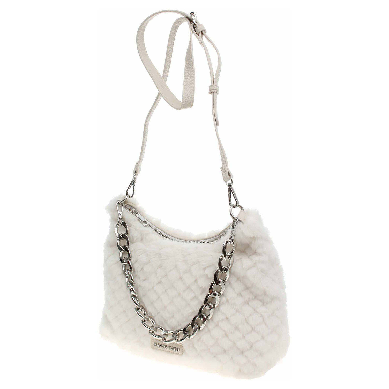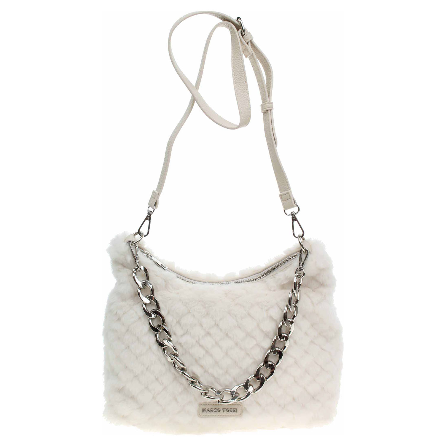 Marco Tozzi - dámská kabelka ozdobená řetízkem, který se dá odepnout, se zapíná na zip a má rozměry 20 x 29 x 11 cm. Kabelka je vyrobená v kombinaci polyester/polyuretan s podšívkou z polyesteru. Kabelku je možno nosit jen v ruce za odepínatelné ucho (výška 19 cm) nebo přes rameno na regulovatelném popruhu s karabinkami. Formát A4 se nevejde. Vnitřní výbava: 1x kapsa se zipem, 2x kapsička bez zapínání.