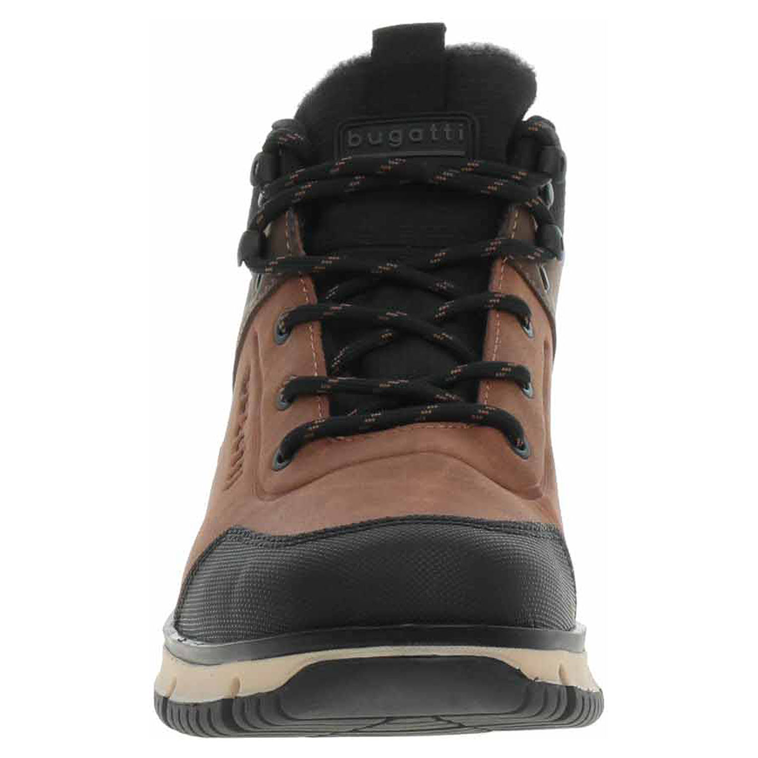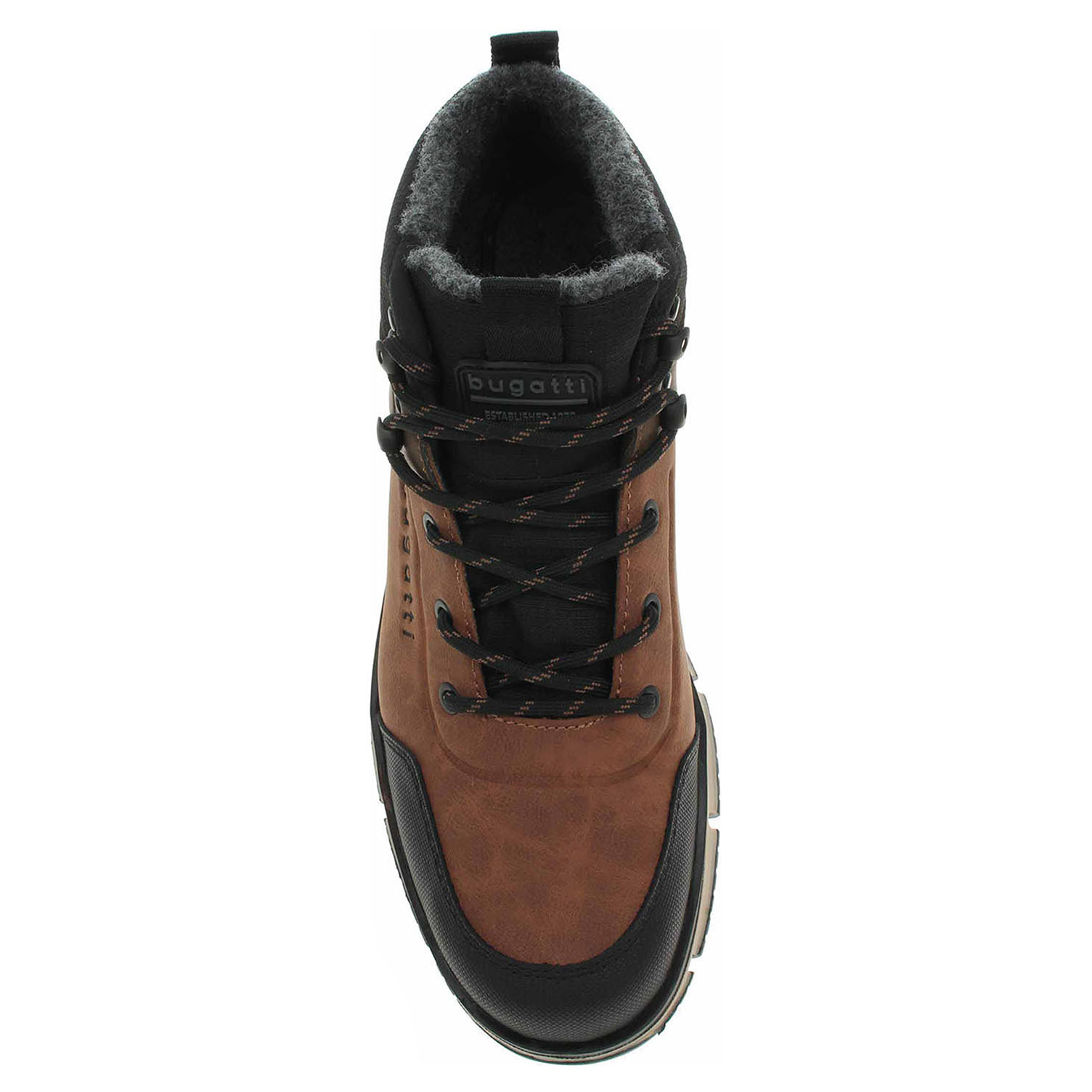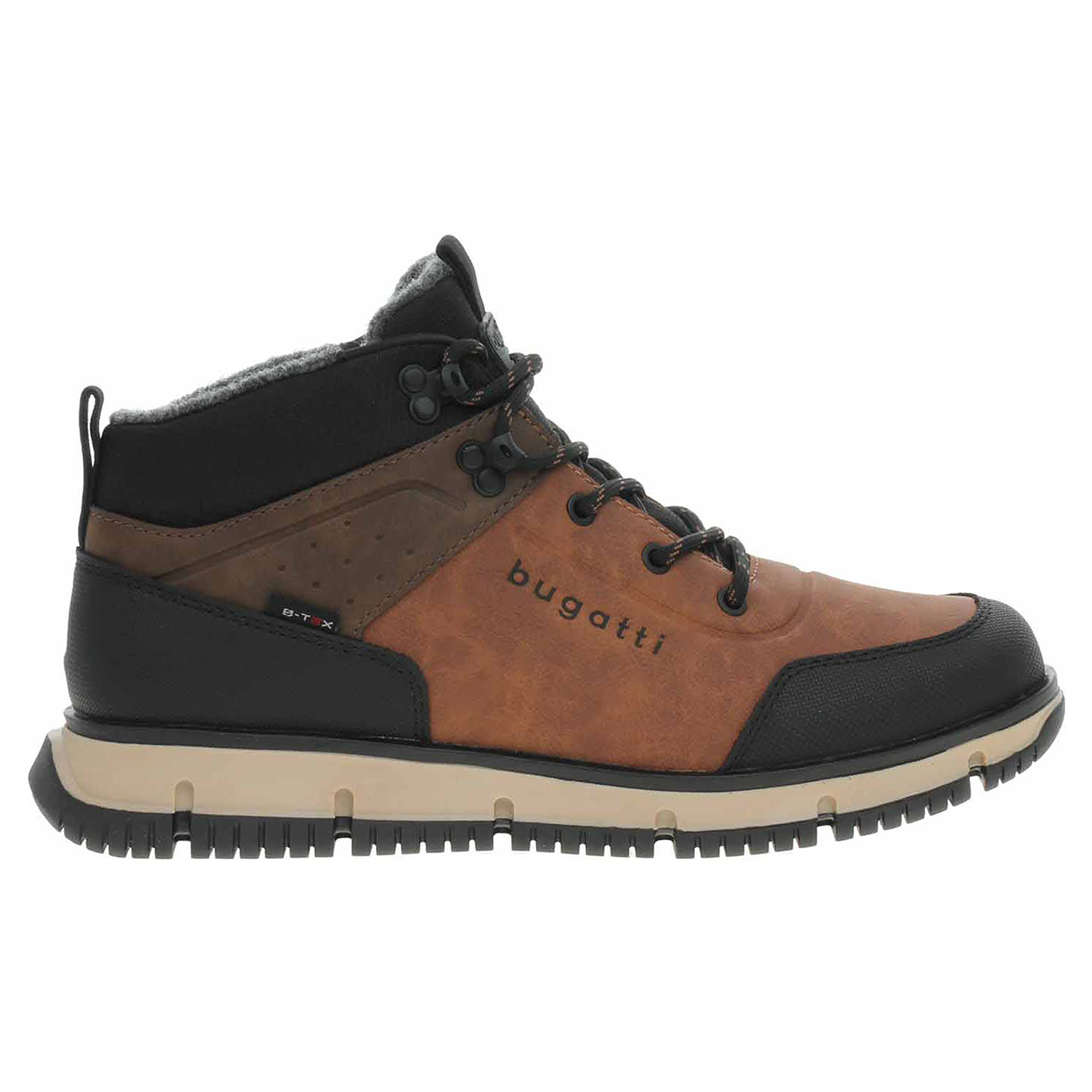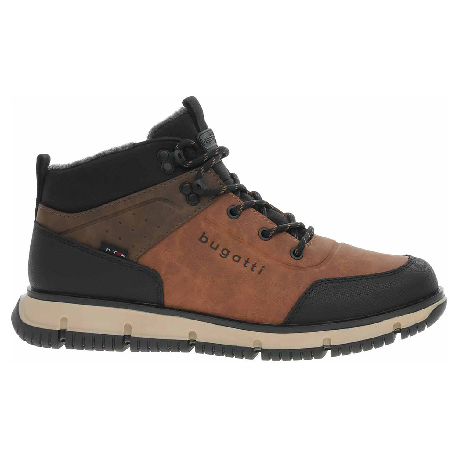Boty Bugatti - lepená pánská kotníková obuv se šněrováním má svršek ze syntetiky s textilní lemem kotníku, textilní stélku a je vyteplená textilní podšívkou (100% polyester). Obuv je vybavená vodoodpudivou Tex membránou. Klínek je vysoký 4,- cm a plarforma je vysoká 2,5 cm. Lepená obuv - pevnost lepeného spoje může být negativně ovlivněna promáčením nebo propocením, event. opakovaným používáním nedostatečně vysušené obuvi. Při neopatrné chůzi může dojít k mechanickému uvolnění lepeného spoje - ukopnutí.