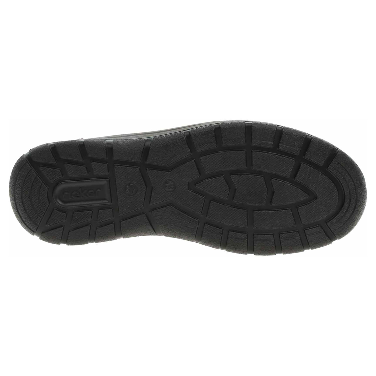 Boty Rieker - lepená pánská kotníková obuv nadměrné šíře se svrškem kombinovaným useň/syntetika a s vypolstrovaným lemem okolo kotníku je vyteplená textilní podšívkou s jemným, chlupem a je vybavená vodoodpudivou membránou RiekerTex a vyndavací stélkou s textilní nášlapnou vrstvou. Vyměnitelné vložky do bot je možné vyndat za účelem provětrání a omytí. Značnou výhodu nabízejí vyměnitelné vložky do bot také těm uživatelům, kteří používají ortopedické vkládací stélky. Pohodlné nazouvání zajišťuje šněrování na nártu a zip na vnitřní straně. Klínek je vysoký 3,2 cm a platforma je vysoká 2,- cm. Podešev je flexibilní a díky systému Antistress skvěle tlumí nárazy a otřesy. Lepená obuv - pevnost lepeného spoje může být negativně ovlivněna promáčením nebo propocením, event. opakovaným používáním nedostatečně vysušené obuvi. Při neopatrné chůzi může dojít k mechanickému uvolnění lepeného spoje - ukopnutí.