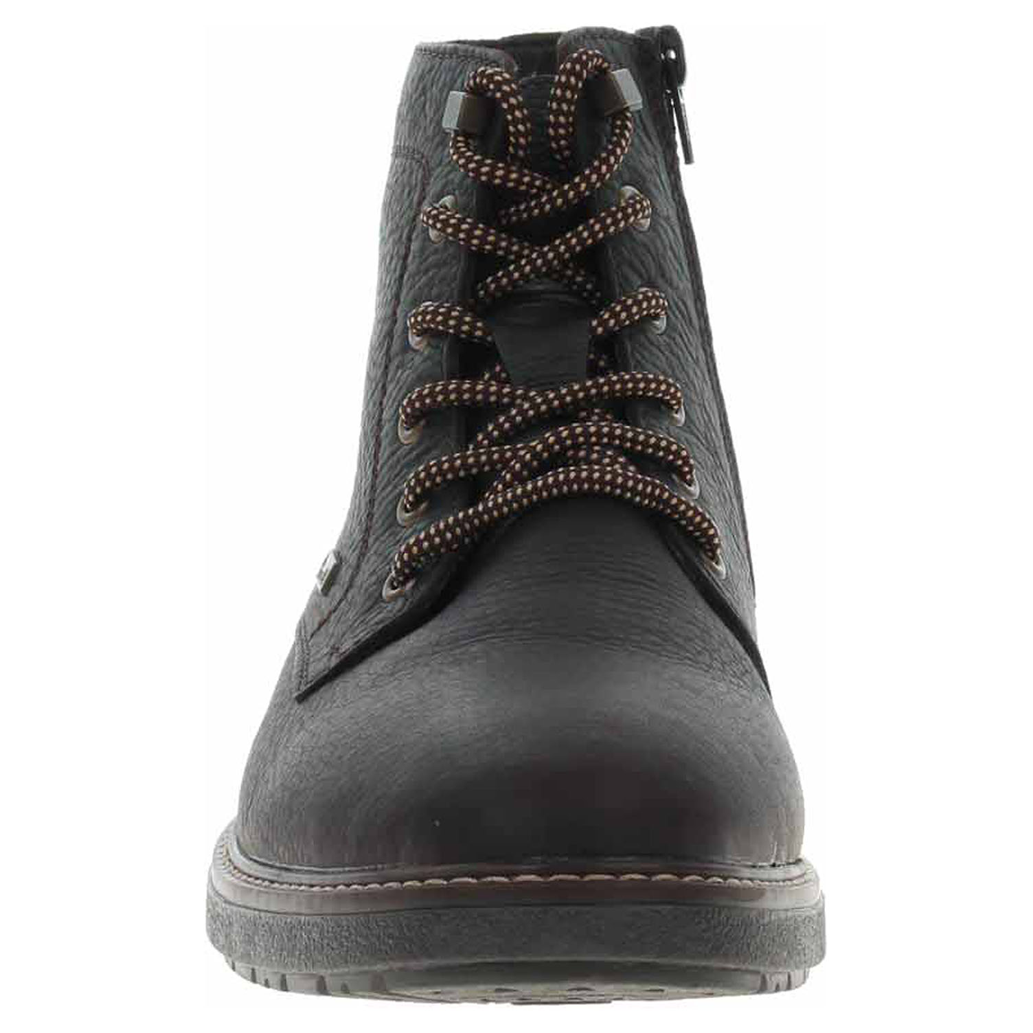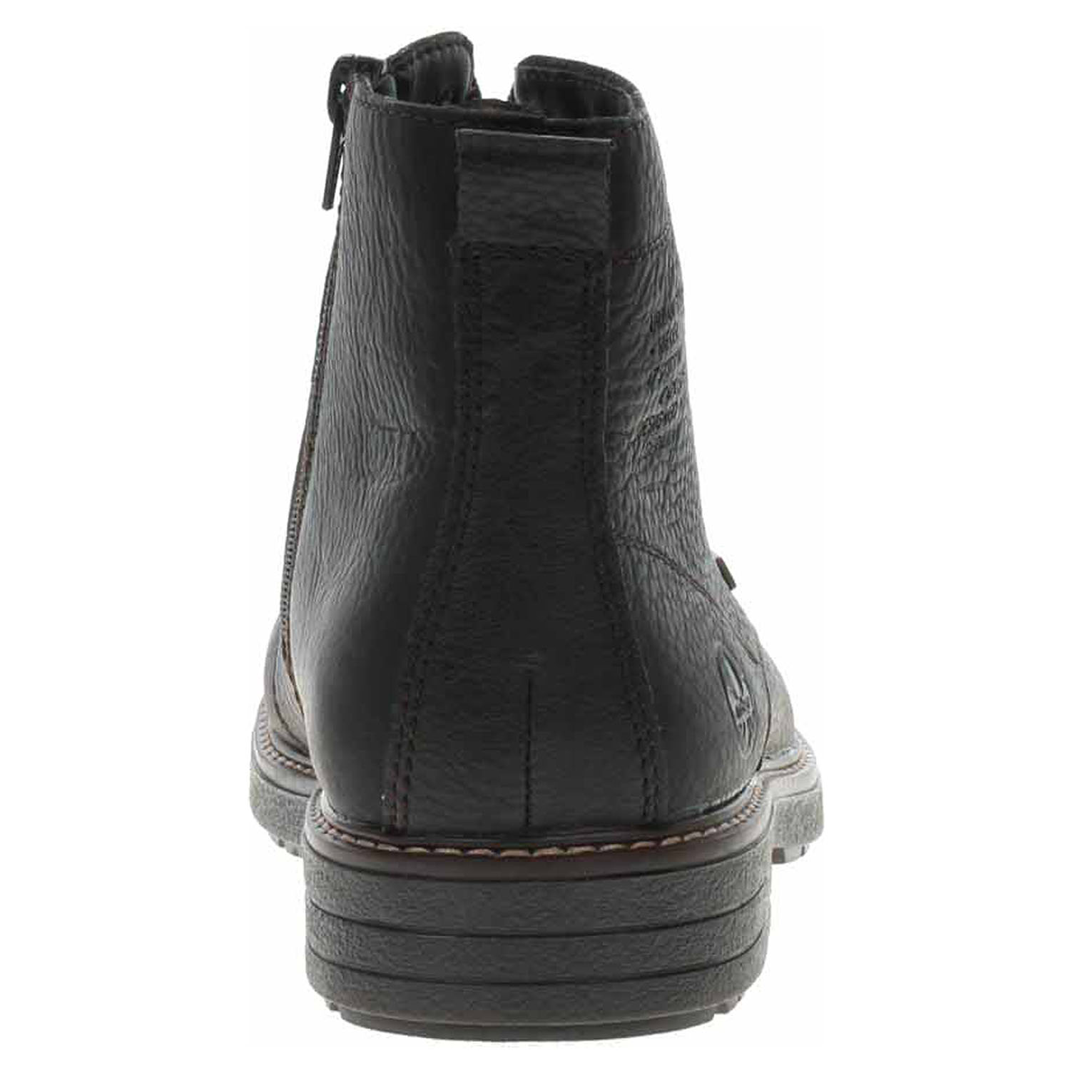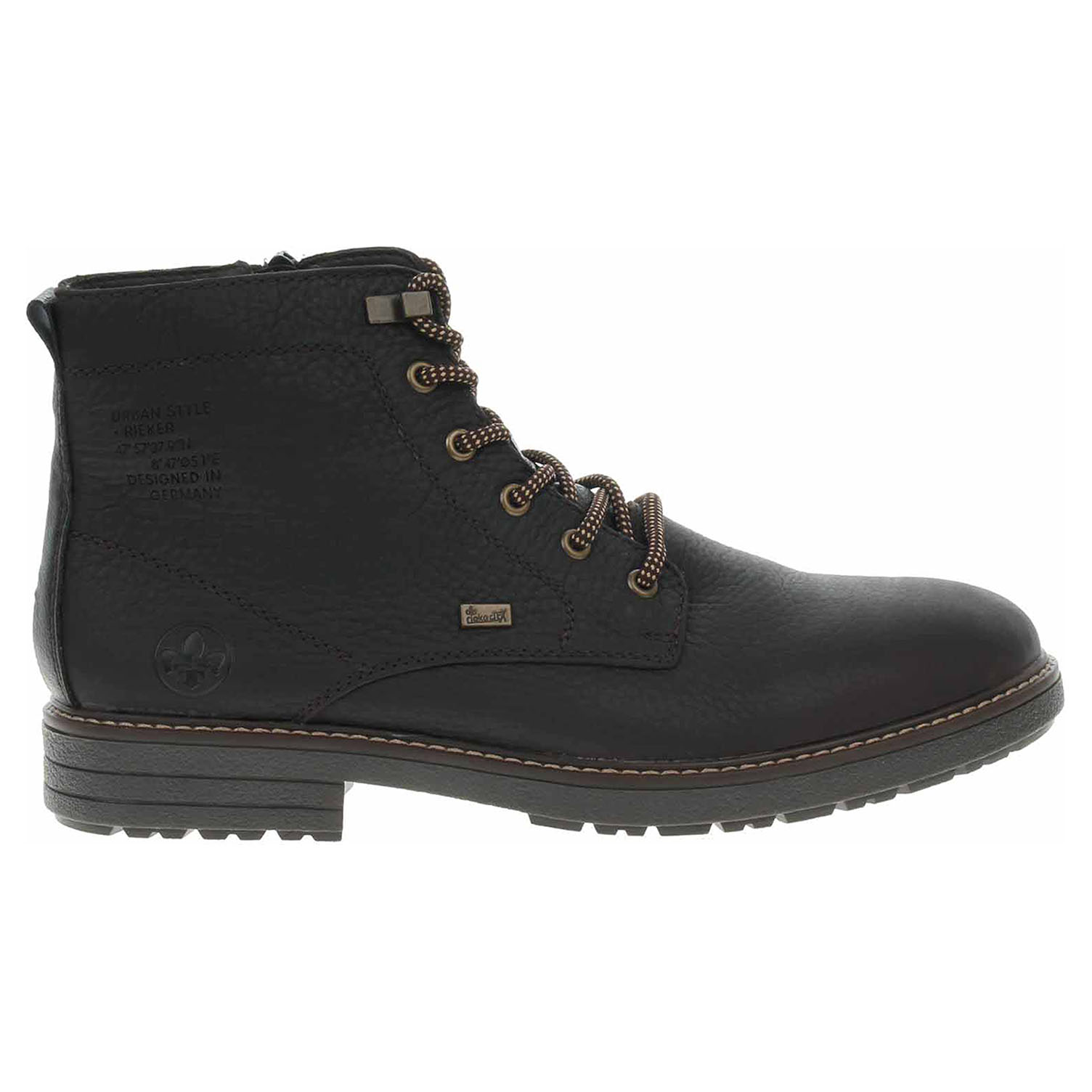 Boty Rieker - lepená pánská kotníková obuv se svrškem z usně a s vyndavací stélkou je vyteplená podšívkou z pravé jehněčí kožešiny a je vybavená vodoodpudivou membránou RiekerTex. Vyměkčené vložky do bot s textilní nášlapnou vrstvou je možné vyndat za účelem provětrání a omytí. Značnou výhodu nabízejí vyměnitelné vložky do bot také těm uživatelům, kteří používají ortopedické vkládací stélky. Pohodlné nazouvání zajišťuje šněrování a zip na vnitřní straně. Podpatek je vysoký 3,5 cm. Podešev je flexibilní a díky systému Antistress skvěle tlumí nárazy a otřesy. Lepená obuv - pevnost lepeného spoje může být negativně ovlivněna promáčením nebo propocením, event. opakovaným používáním nedostatečně vysušené obuvi. Při neopatrné chůzi může dojít k mechanickému uvolnění lepeného spoje - ukopnutí.
