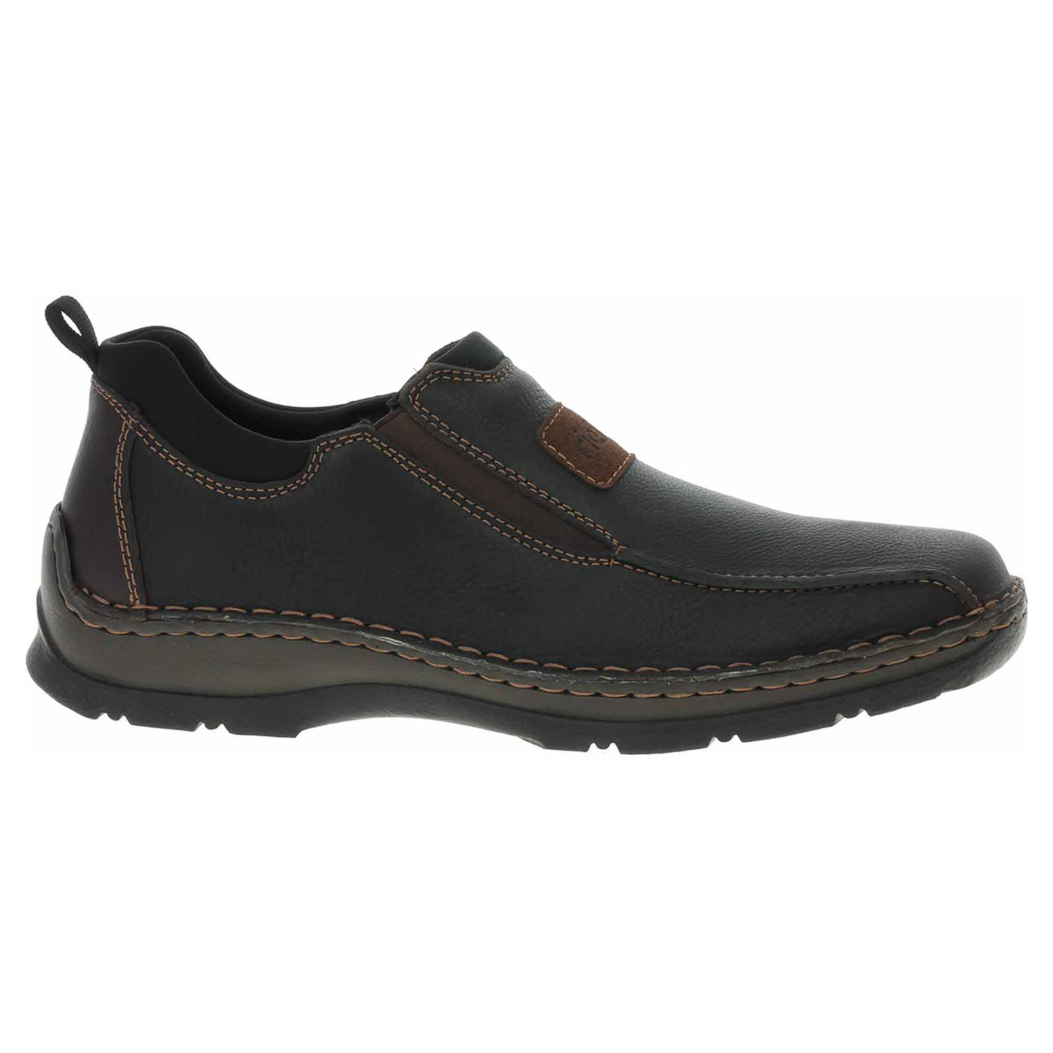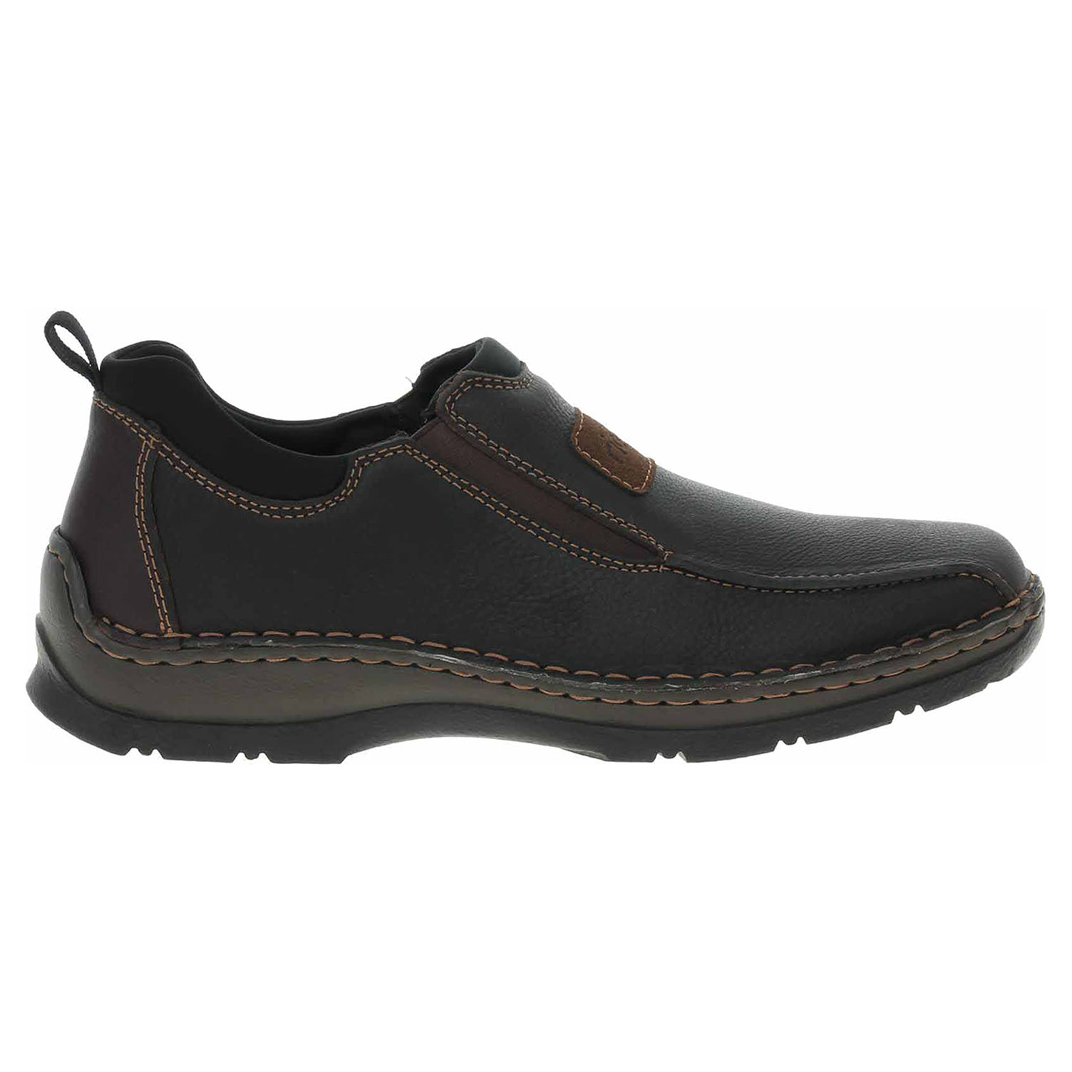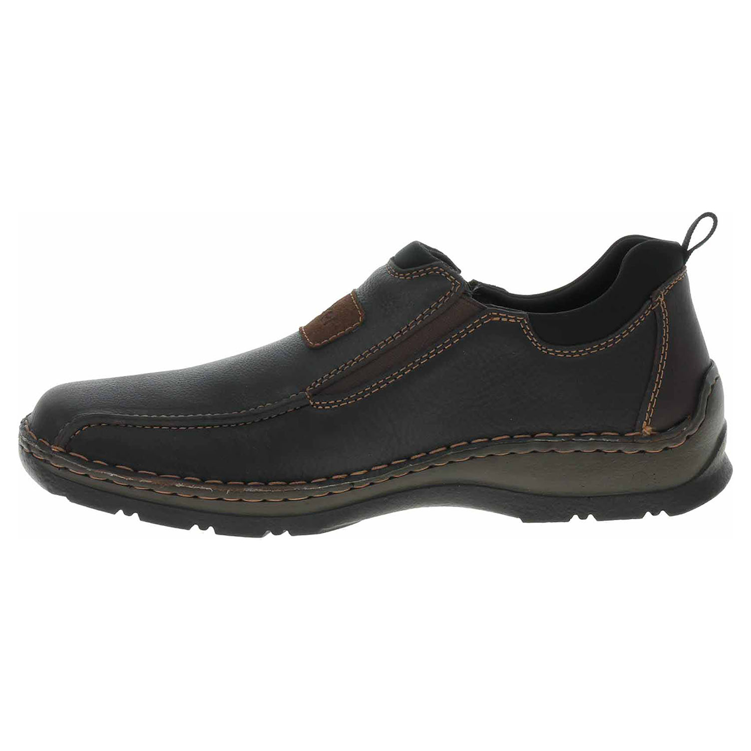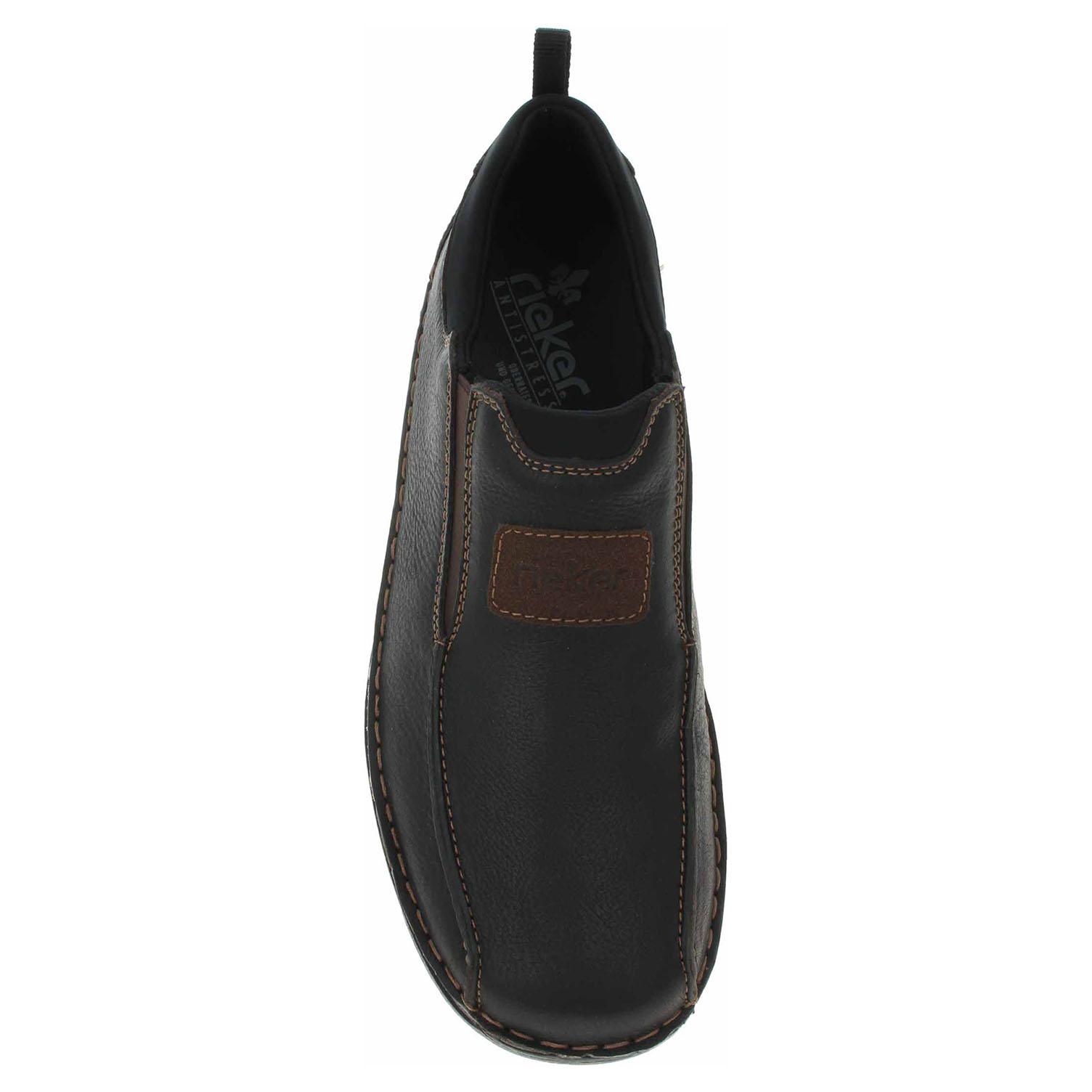 Boty Rieker - flexiblové pánské mokasiny nadměrné šíře mají svršek i stélku z usně a podšívku textilní. Pohodlné nazouvání zajišťují vsazené gumičky na vnitřní i vnější straně nártu. Podešev je flexibilní a díky systému Antistress skvěle tlumí nárazy a otřesy. Flexiblová obuv - prošívaná podešev, obuv používejte v suchém prostředí. Při zvýšené vlhkosti může dojít k promáčení obuvi. Obuv pravidelně impregnujte nebo krémujte, zvláště pak prošívaný okraj.