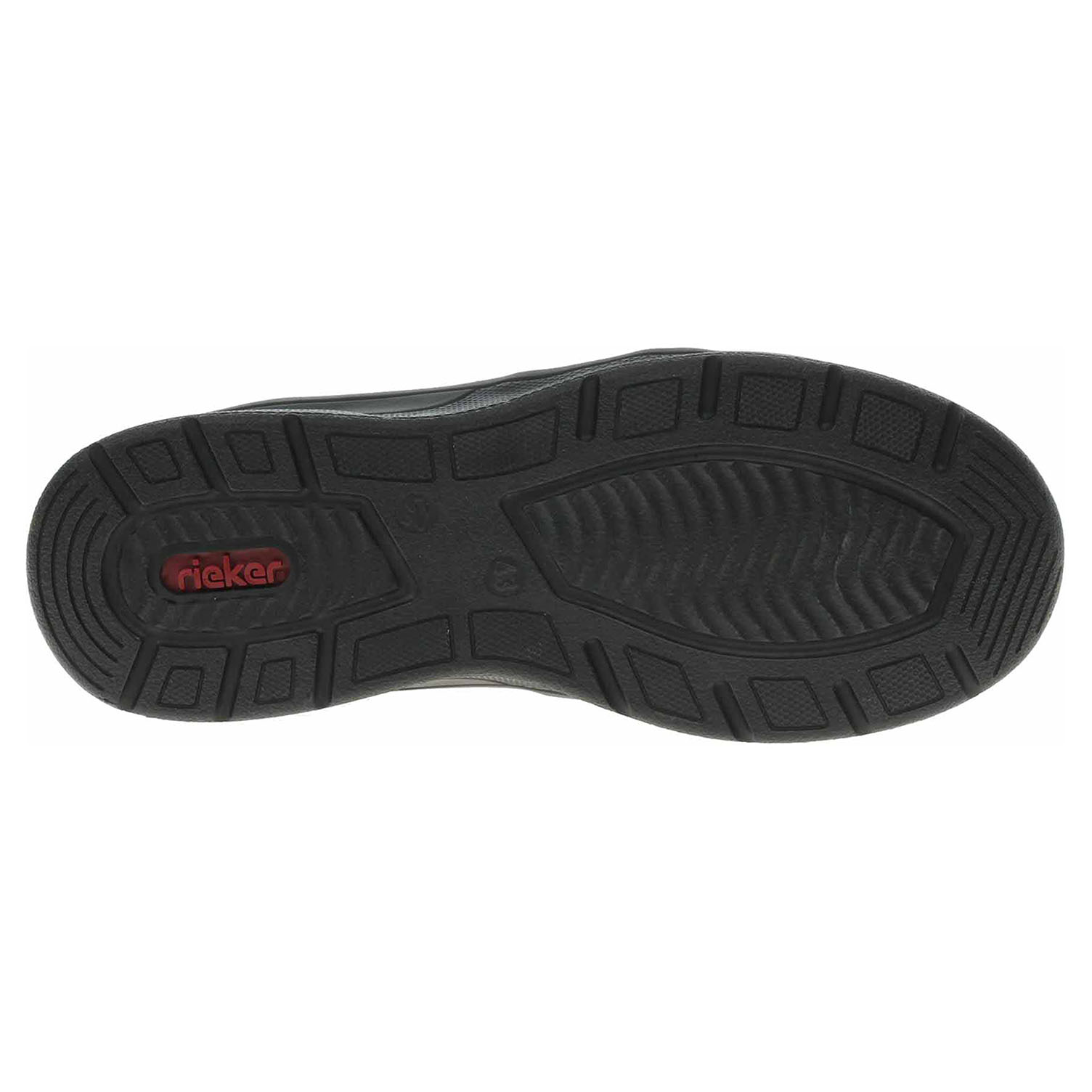 Boty Rieker - lepené pánské mokasiny nadměrné šíře se svrškem kombinovaným useň/syntetika a s textilní podšívkou i stélkou jsou vybavené vodoodpudivou membránou RiekerTex. Vyndavací stélky do bot je možné vyndat za účelem provětrání a omytí. Značnou výhodu nabízejí vyměnitelné vložky do bot také těm uživatelům, kteří používají ortopedické vkládací stélky. Obuv má pro pohodlné nazouvání na vnitřní i vnější straně nártu vsazené gumičky. Podešev je flexibilní a díky systému Antistress skvěle tlumí nárazy a otřesy. Klínek je vysoký 3,5 cm. Lepená obuv - pevnost lepeného spoje může být negativně ovlivněna promáčením nebo propocením, event. opakovaným používáním nedostatečně vysušené obuvi. Při neopatrné chůzi může dojít k mechanickému uvolnění lepeného spoje - ukopnutí.