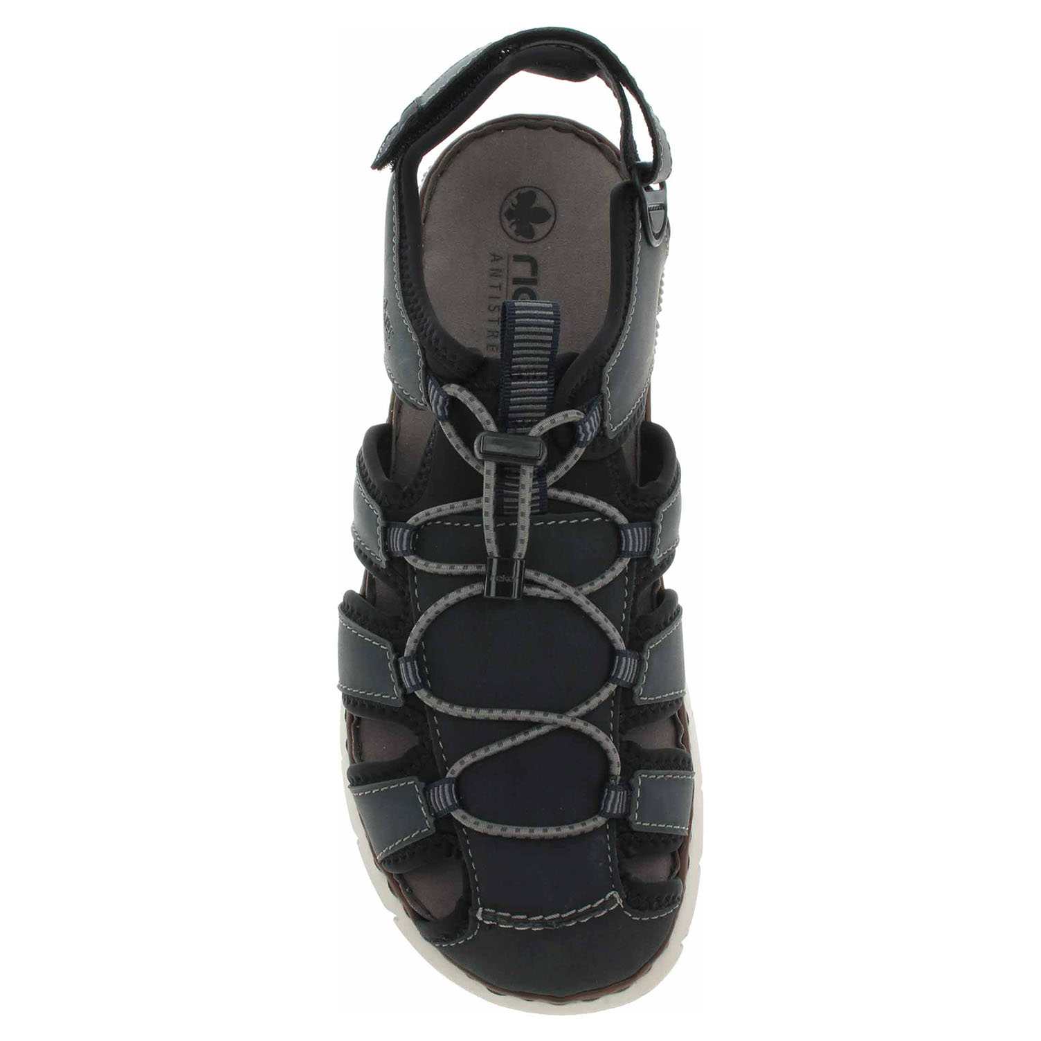 Boty Rieker - pánské uzavřené sandály mají svršek kombinovaný syntetika/textil, textilní podšívku a vyměkčenou stélku s textilní nášlapnou vrstvou. Šněrováním je provlečená nekonečná gumička s brzdičkou. Pohodlné nazouvání zajištuje pásek na patě, který se zapíná na suchý zip. Klínek je vysoký 2,9 cm. Podešev je flexibilní a díky systému Antistress skvěle tlumí nárazy a otřesy.