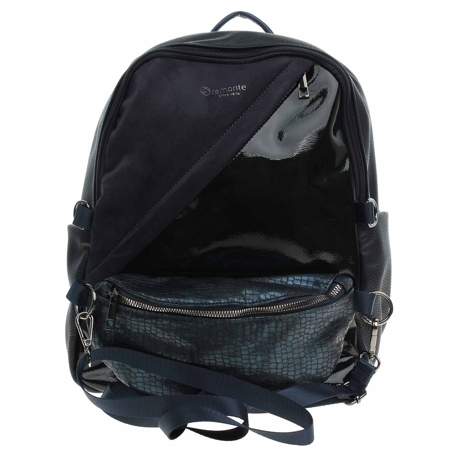 Remonte - dámský batůžek s odepínatelnou ledvinkou má svršek ze 100% polyuretanu a podšívku ze 100% polyesteru. Hlavní komora se zapíná na zip, na přední i na zadní straně je kapsa se zipem. Rozměry batohu - 35 x 30 x 13 cm. Batoh je možno nosit v ruce za ucho (výška 6 cm) a také na ramenou na regulovatelným popruzích. Na bocích jsou kapsy bez zapínání. Odepínatelná ledvinka (rozměry 27 x 12 cm) se zapíná na zip a je vybavená regulovatelným popruhem s karabinkami. Vnitřní výbava: 1x kapsa na zip, 2 kapsy na mobil a klíče bez zapínání.