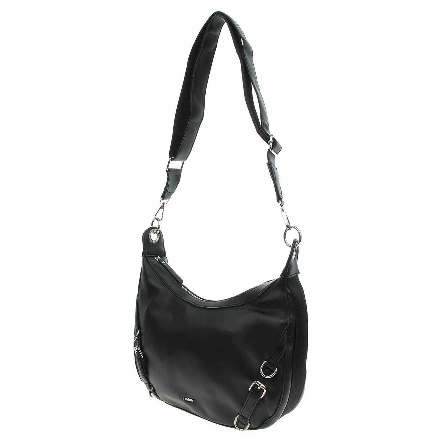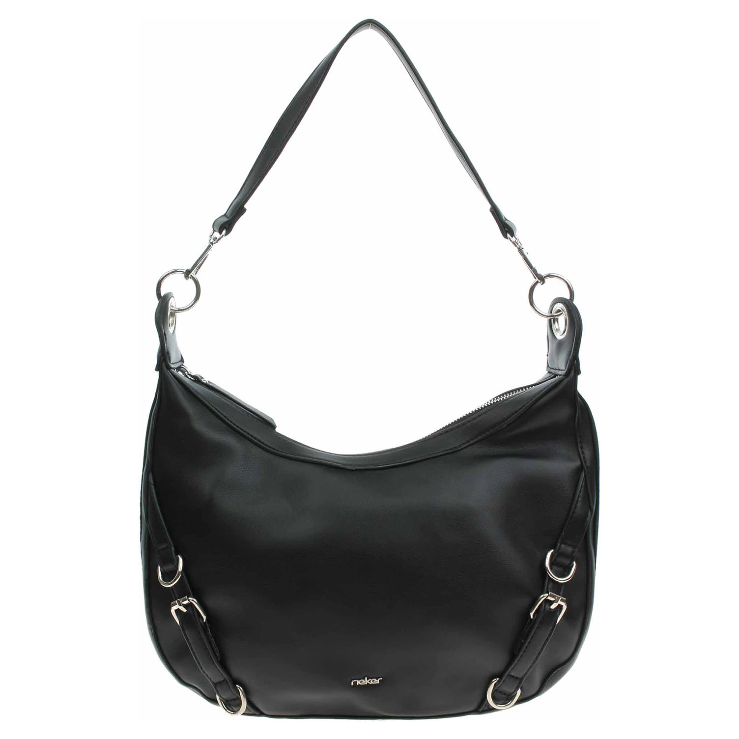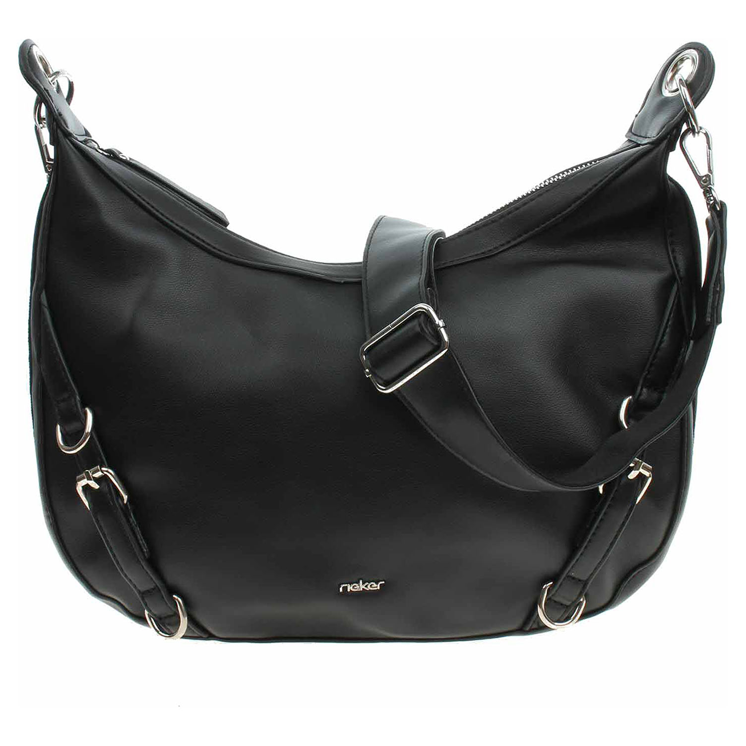 Rieker - dámská kabelka se zapínáním na zip má svršek z poluretanu a podšívku polyesteru. Kabelku je možno nosit v ruce za odepínatelný kratší popruh (výška 27 cm) nebo po výměně přes rameno na regulovatelném popruhu s karabinkami. Na zadní straně je kapsa se zipem. Rozměry: 33 x 9 x 25 cm. Karabinky, kroužky, zip i logo jsou z leštěného kovu stříbrné barvy. Vnitřní výbava: 1x kapsa se zipem a 2x kapsa bez zapínání.