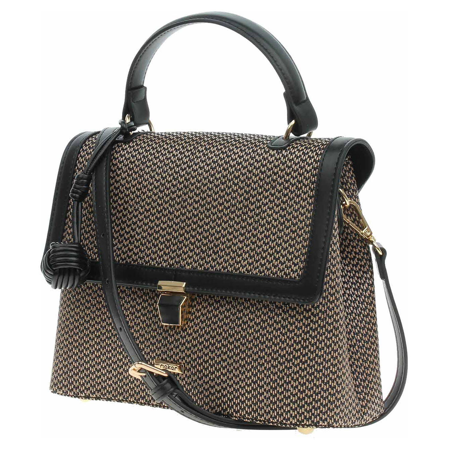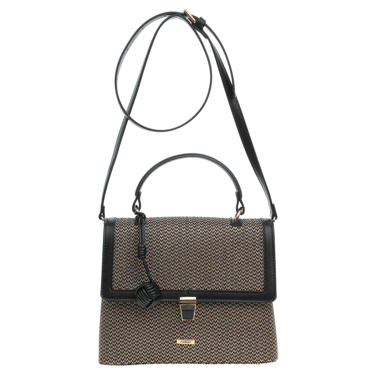 Rieker - dámská klopnová dvoukomorová kabelka z polyuretanu v barevné kombinaci béžová/černá se zapíná na zámeček a má rozměry 23 x 20 x 8 cm. Kabelku s přívěškem je možno nosit v ruce na krátké rukojeti nebo přes rameno na regulovatelném popruhu z polyuretanu, který se dá odepnout. Vnitřní výbava: zadní komora - 1x kapsa se zipem, v přední komoře 2 kapsičky bez zapínání.