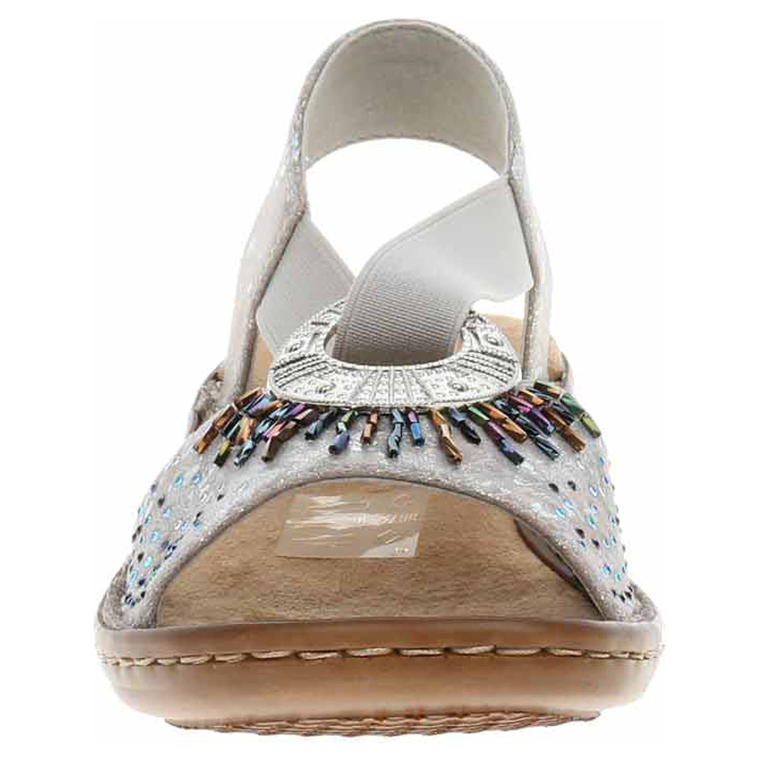 Boty Rieker - dámské sandály se svrškem a s podšívkou ze syntetiky jsou vybavené vyměkčenou stélkou s textilní našlapnou vrstvou. Pro pohodlné nazouvání je ozdobným kroužkem přes nárt provlečená gumička. Podešev je flexibilní a díky systému Antistress skvěle tlumí nárazy a otřesy. Klínek je vysoký 3,5 cm.