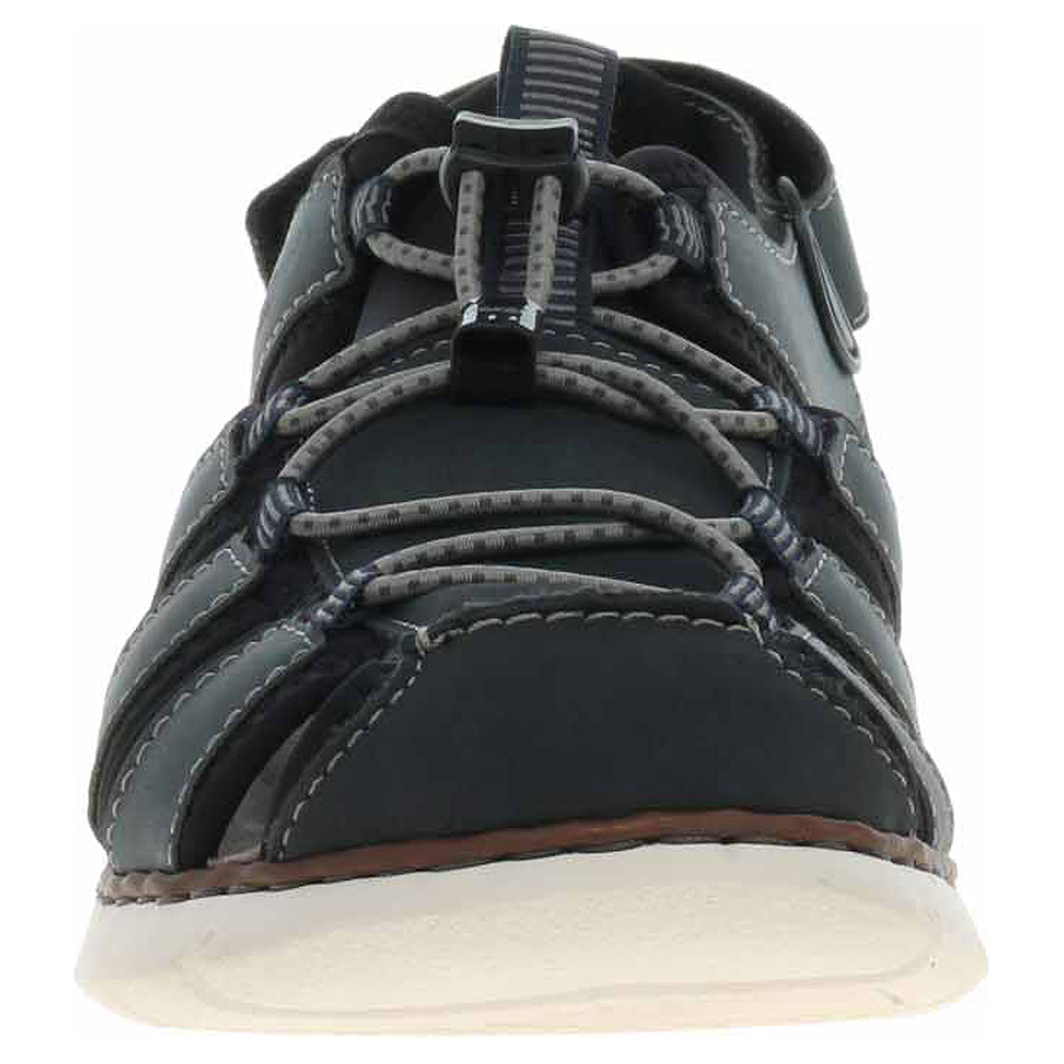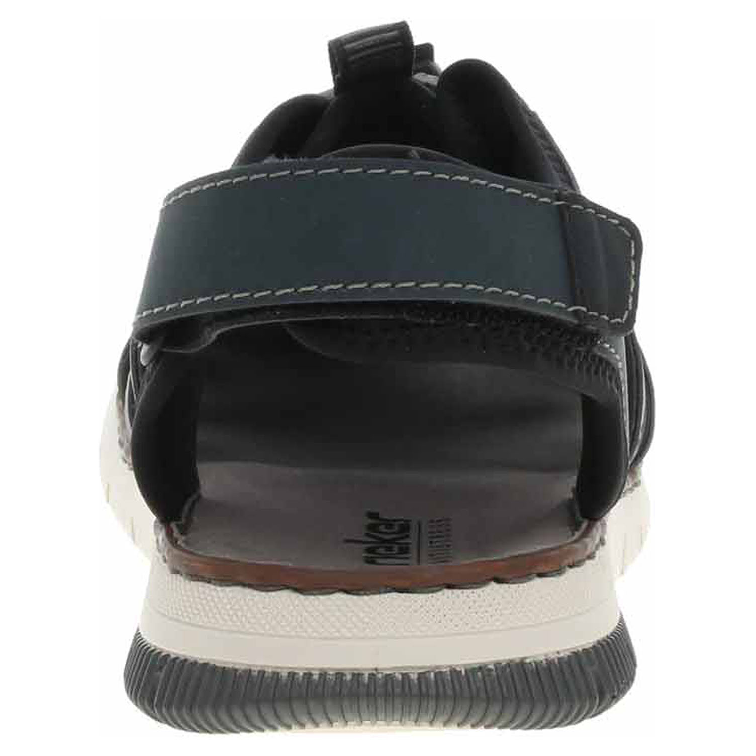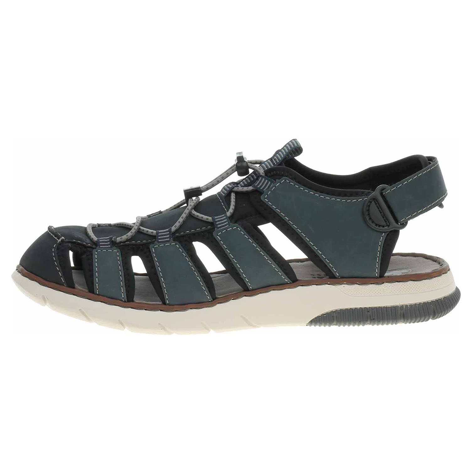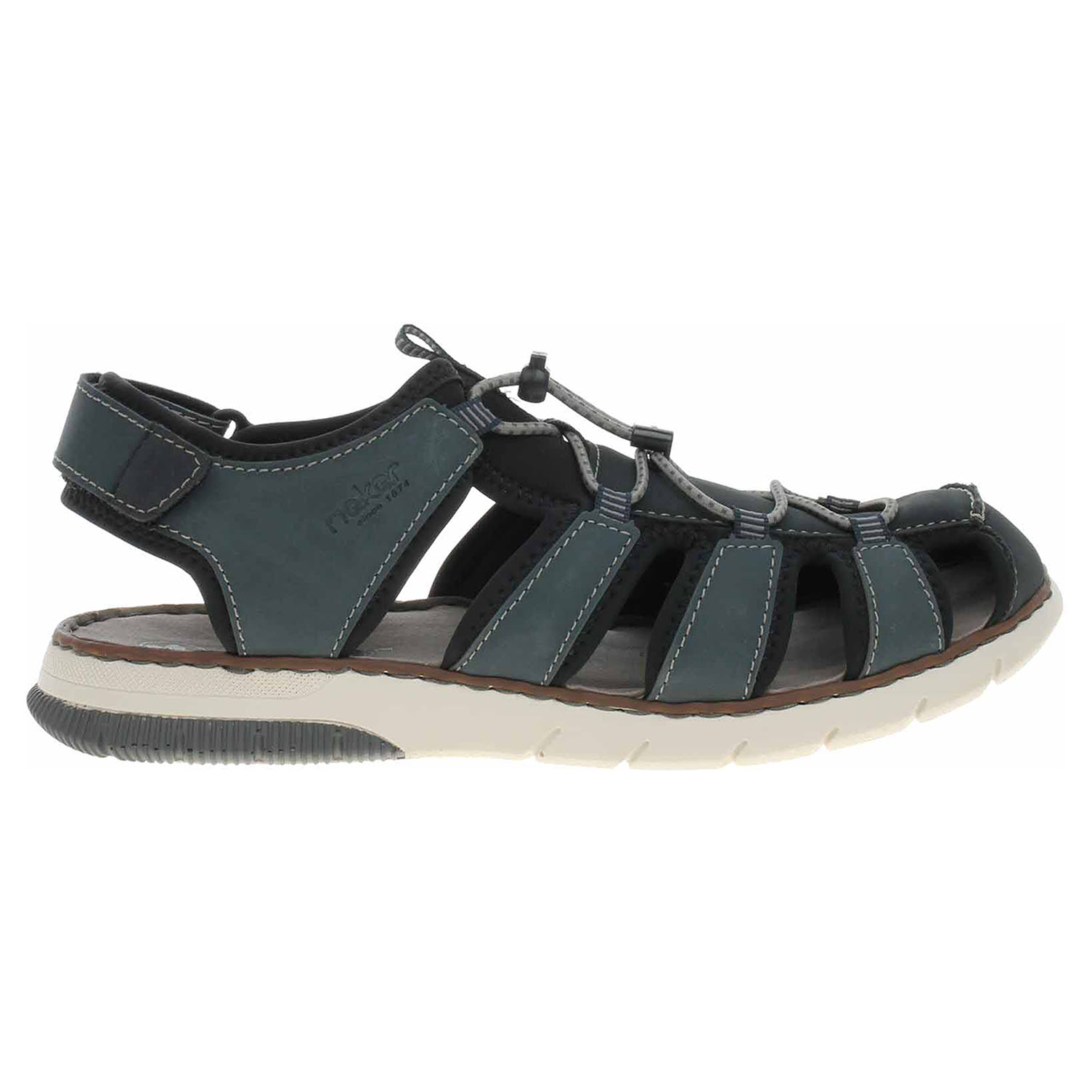 Boty Rieker - pánské uzavřené sandály mají svršek kombinovaný syntetika/textil, textilní podšívku a vyměkčenou stélku s textilní nášlapnou vrstvou. Šněrováním je provlečená nekonečná gumička s brzdičkou. Pohodlné nazouvání zajištuje pásek na patě, který se zapíná na suchý zip. Klínek je vysoký 2,9 cm. Podešev je flexibilní a díky systému Antistress skvěle tlumí nárazy a otřesy.
