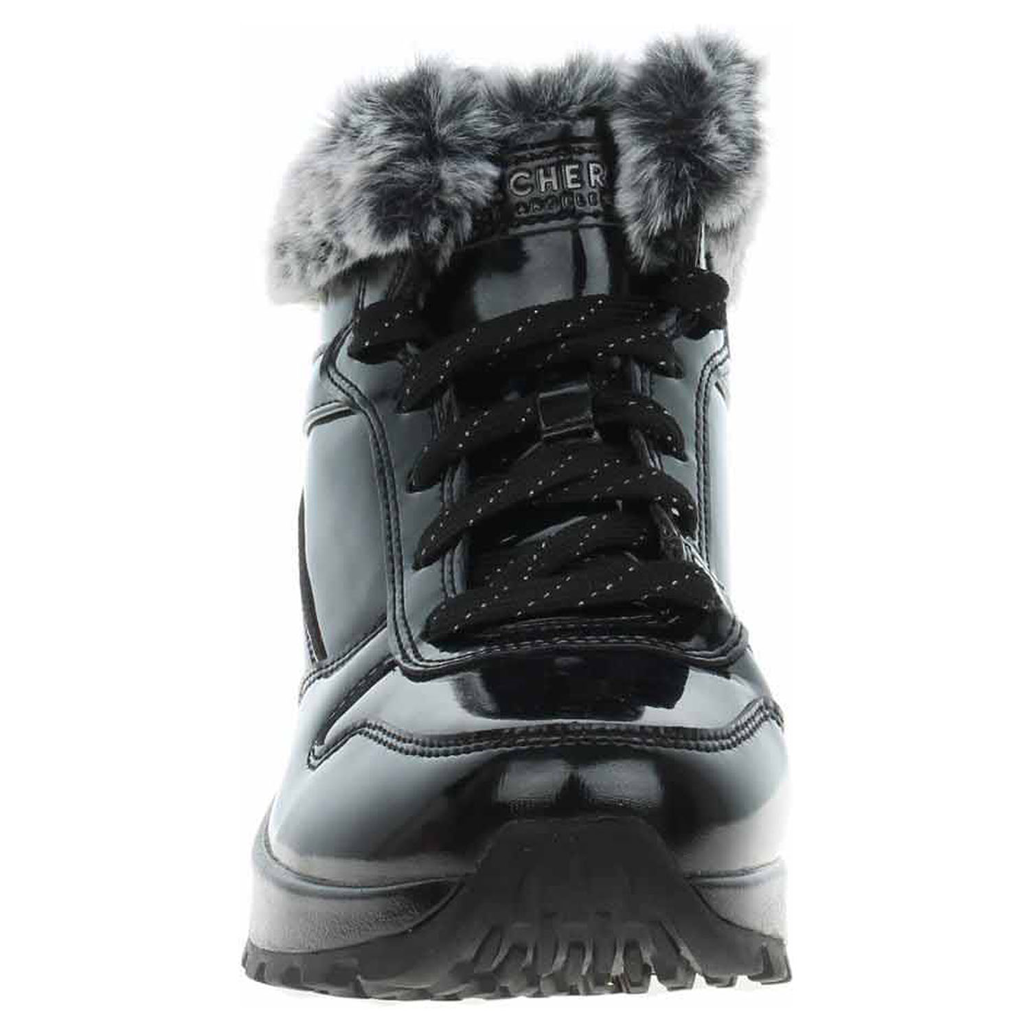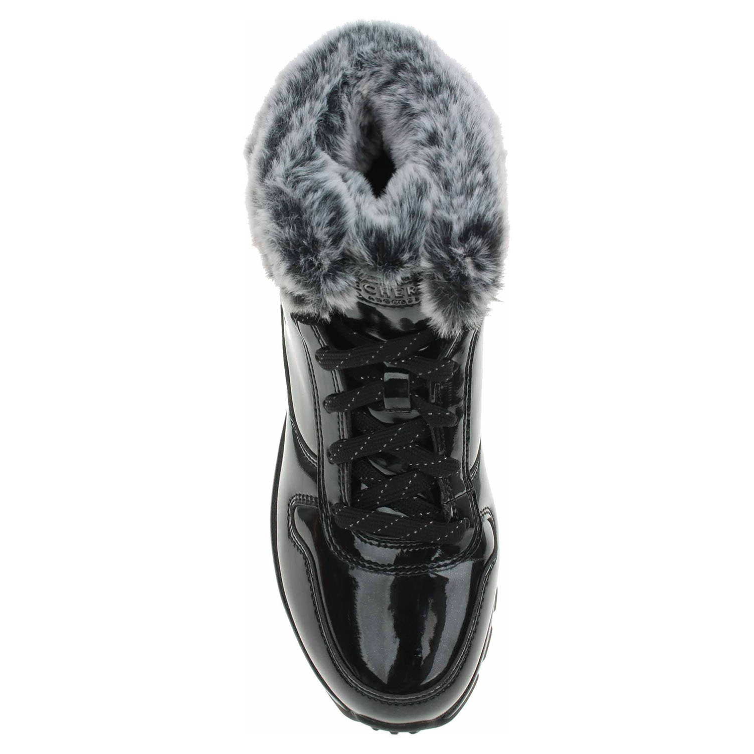 Skechers Uno Rugged - Fiesty Winter - lakovaná dámská kotníková obuv s lemem kolem kotníku má svršek ze syntetiky, textilní podšívku a je vybavená paměťovou stélkou Air-Cooled Memory Foam. Vzduchem chlazená stélka zajišťuje chůzi jak na polštáři, ale noha se nepřehřívá a přirozeně se ochlazuje. Na nártu obuvi je šněrování. Klínek s viditelnou mezipodeševí Skech-Air® se vzduchovým polštářkem je vysoký 4,5 cm a platforma je vysoká 2,5 cm. Lakovaná obuv - hladký, lesklý povrch je docílen lakovou úpravou. Povrch je choulostivý na mechanické poškození, rozmáčení a mráz. Ošetřujte prostředky na lakové usně.