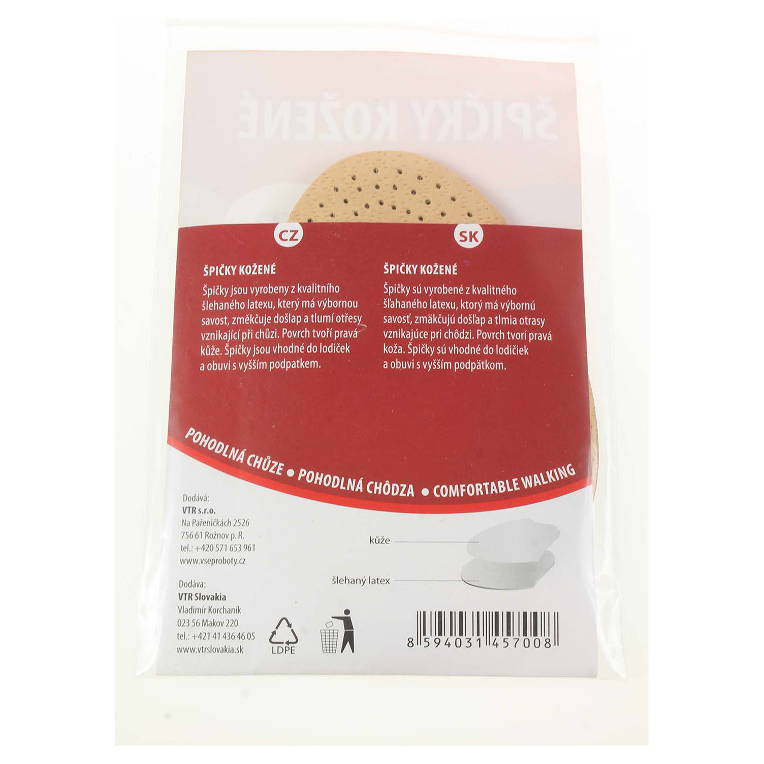 VTR špičky kožené - jsou vyrobené z kvalitního šlehaného latexu, který má výbornou savost, změkčuje doslap a tlumí otřesy vznikající při chůzi. Povrch tvoří pravá kůže. Špičky jsou vhodné do lodiček a do obuvi na vyšším podpatku.