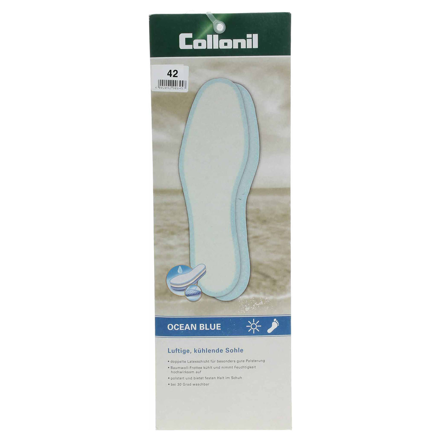 Collonil Ocean Blue - chladivá stélka pro příjemný pocit a svěžest uvnitř obuvi, vhodná zejména pro letní období. Horní vrstva ze 100% bavlněného froté účinně absorbuje vlhkost a redukuje nepříjemné pachy. Střední latexová vrstva tlumí otřesy při došlapu. Struktura na spodní vrstvě z modrého latexu zajišťuje optimální cirkulaci vzduchu a fixuje stélku dovnitř obuvi. Lze prát při teplotě do 30°C.