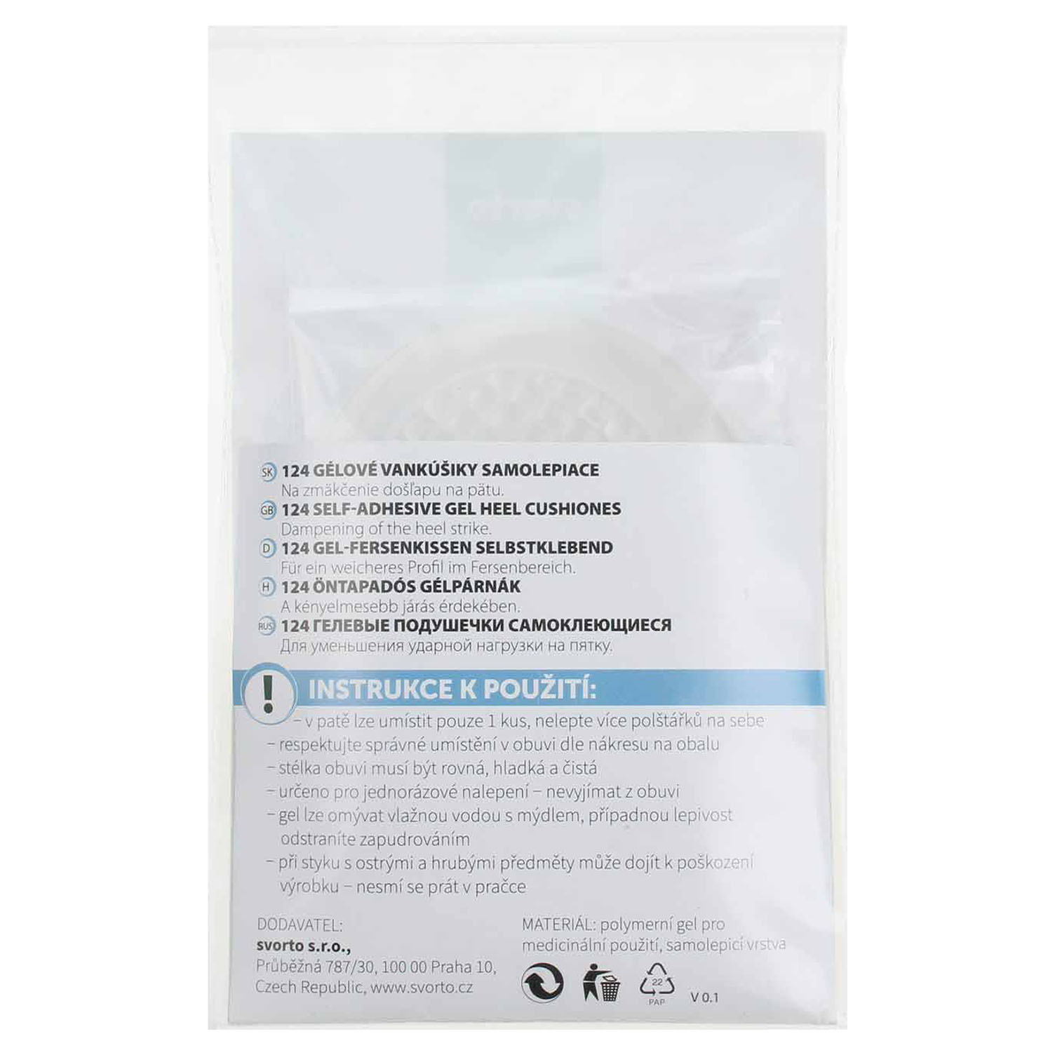 Svorto gelové polštářky samolepící - podpatěnky - průsvitný gel nenarušuje vzhled obuvi a změkčuje došlap v patě. Mimořádně vhodné je jejich použití v obuvi na podpatku, otevřené obuvi typu sandály nebo dřeváky. Lepí se plochou stranou směrem ke stélce, mřížkovanou nahoru. Polštářky lze použít opakově po omytí ve vlažné vodě.